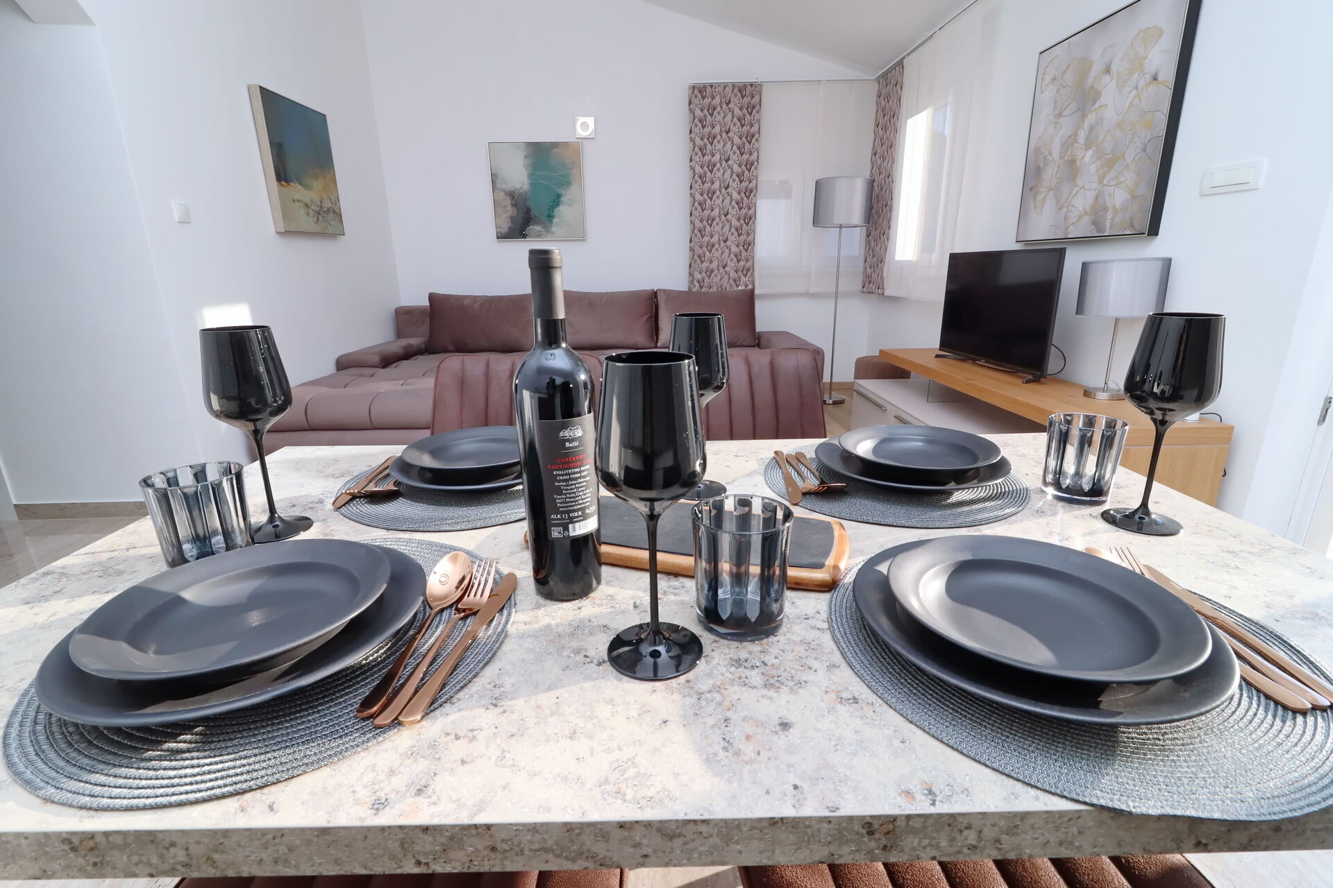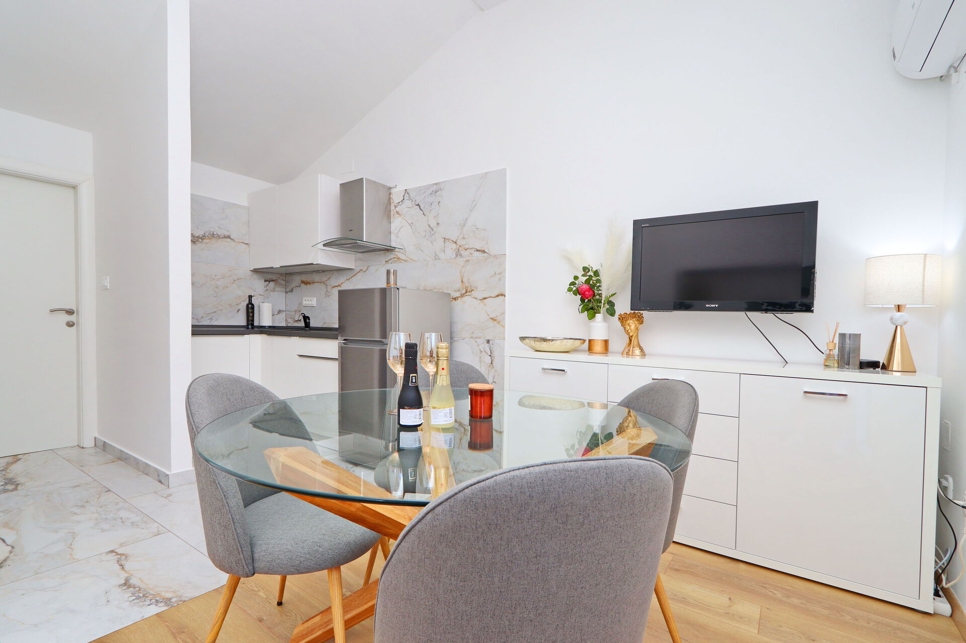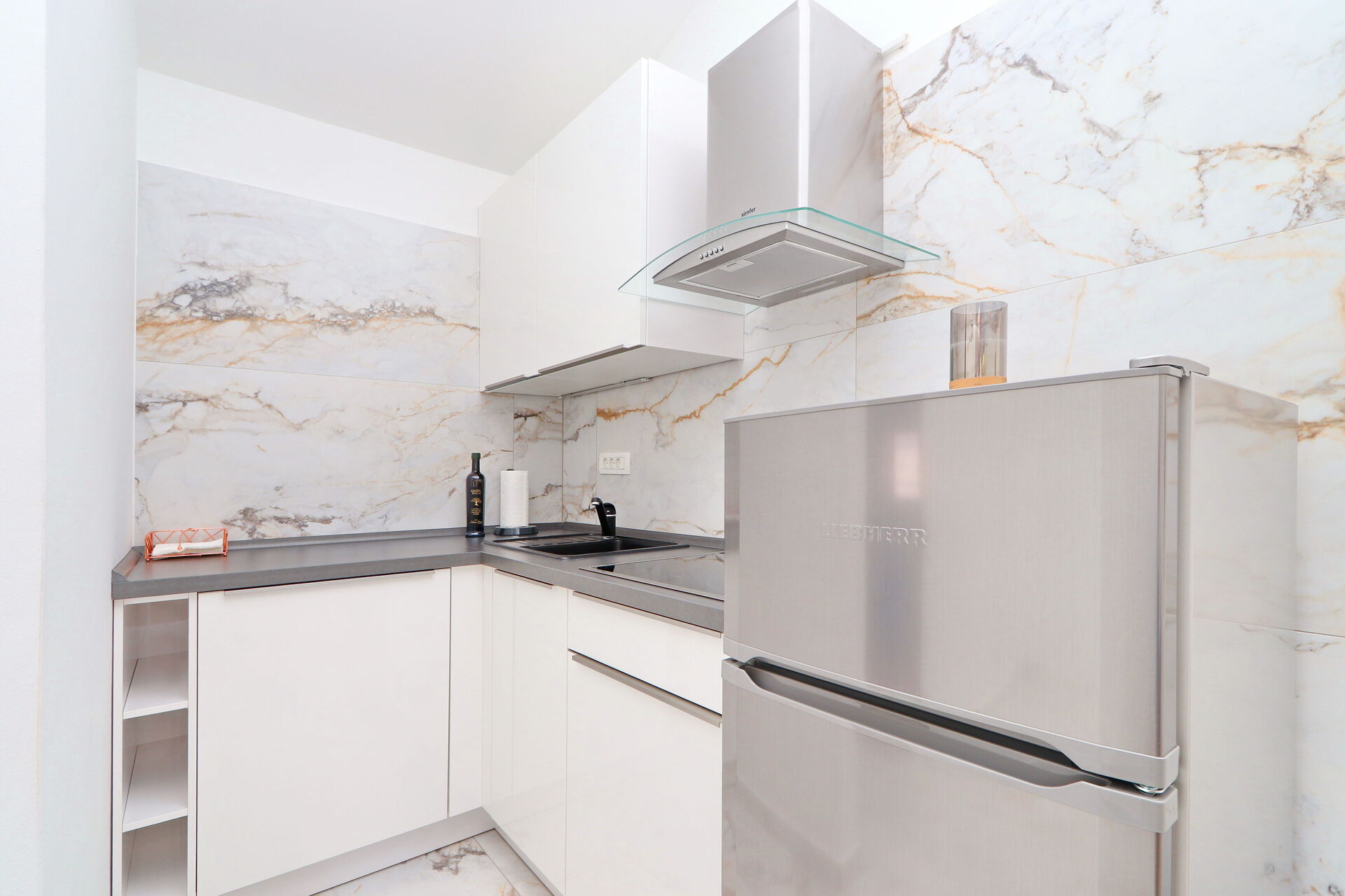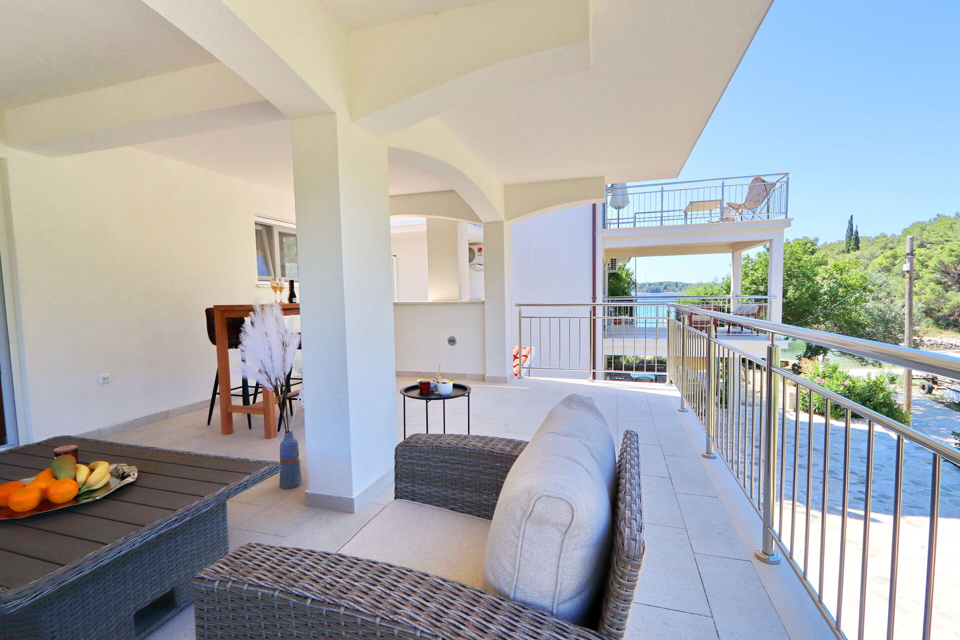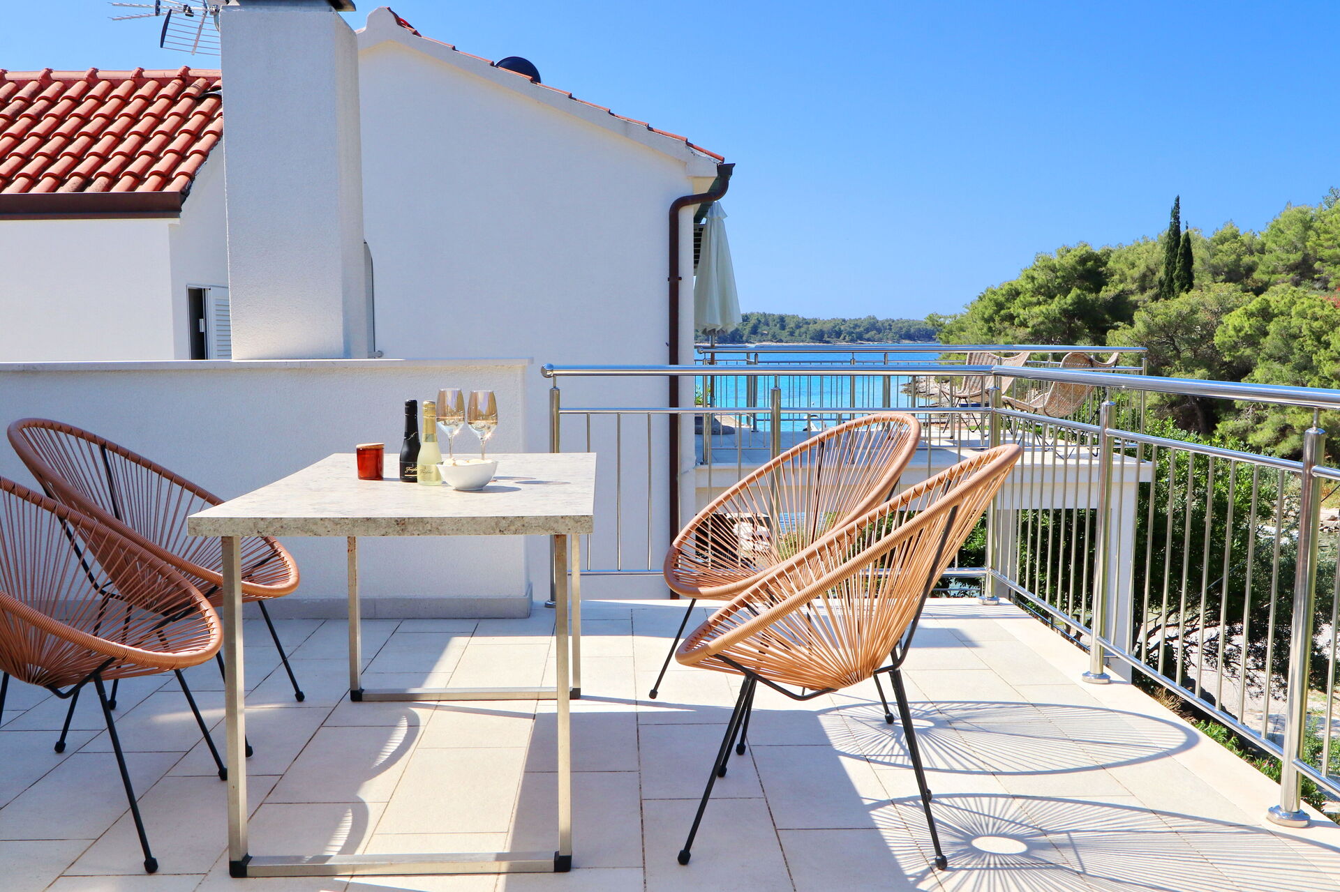 The indoor furnishings are luxurious and modern, yet simple. Each apartment has its own outdoor space with a balcony or terrace. Outside in the pool area there is a large covered veranda, with a handy kitchen equipped with a stone barbecue and sink, where all of the guests can eat and relax together.