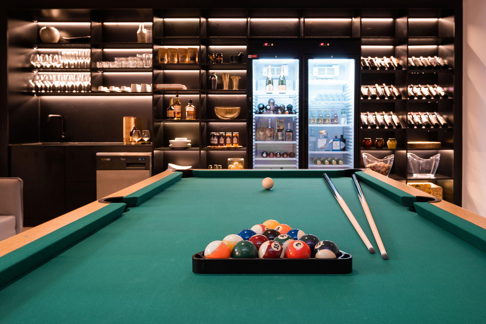 Inside there are 4 bedrooms, 3 which each have a private bathroom. On the lower ground level there is also a bathroom with sauna, a basement with billiard table, and a room with a Play-Station for even more fun and recreation.
