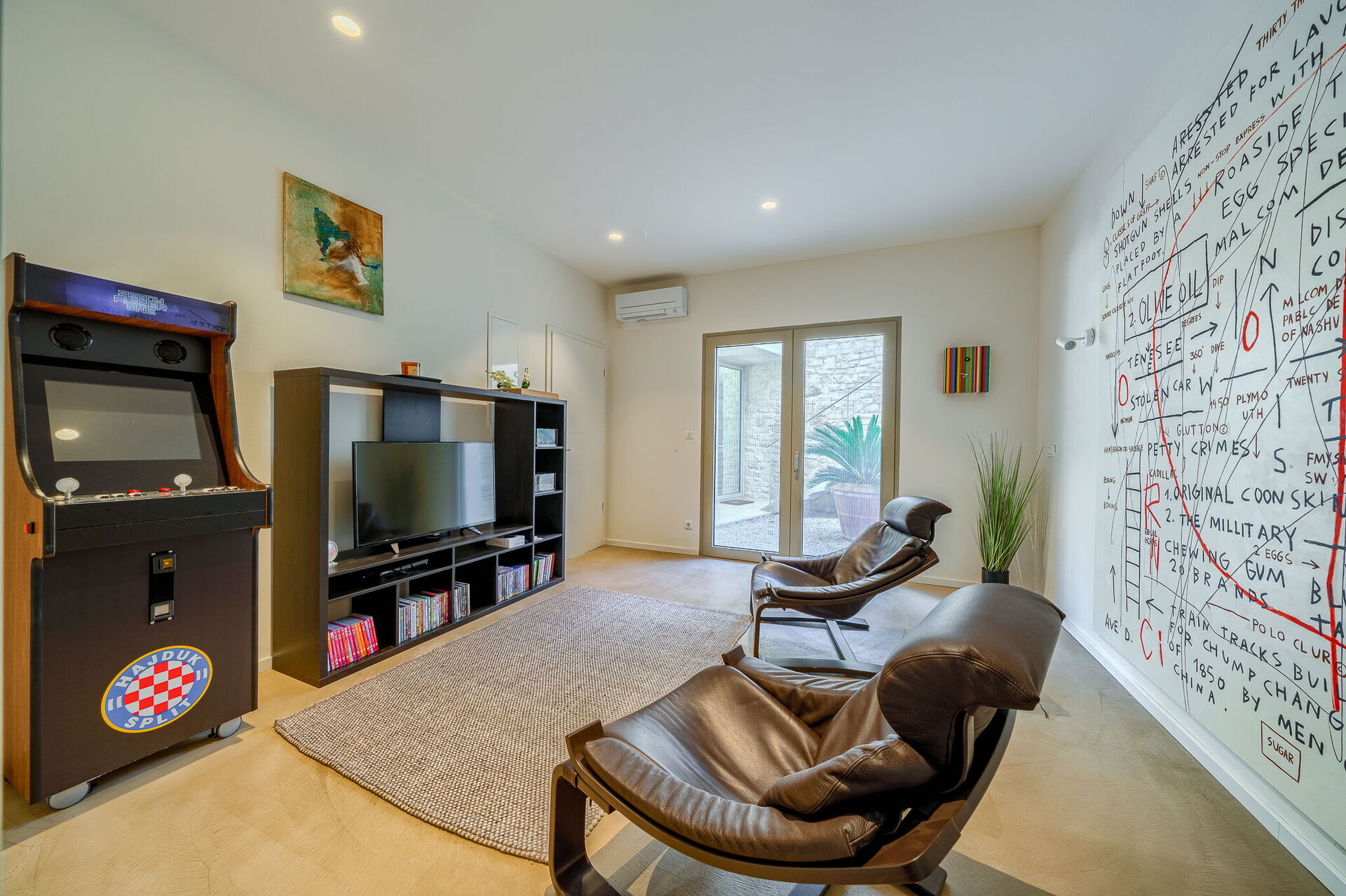 The stunning pool (heated upon request) with panoramic views is surrounded by a sunbathing terrace equipped with sun loungers: the ideal place to relax and cool off on hot days. Enjoy lunches, dinners and sunset cocktails at the barbecue area with a table and chairs: your vacation in Croatia will be perfect in the company of friends and family.