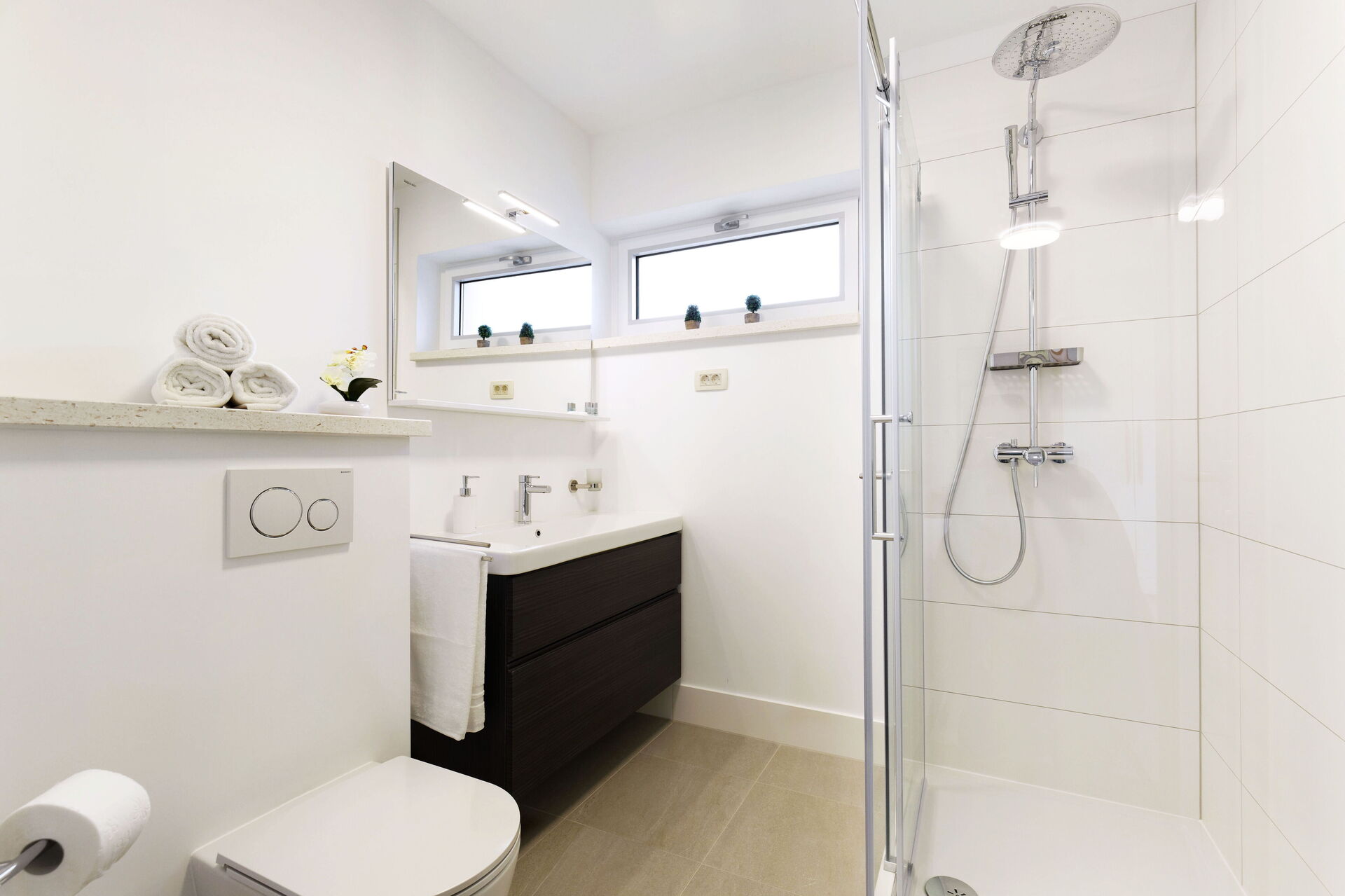 First floor: 3 double bedrooms, each with private bathroom with shower.