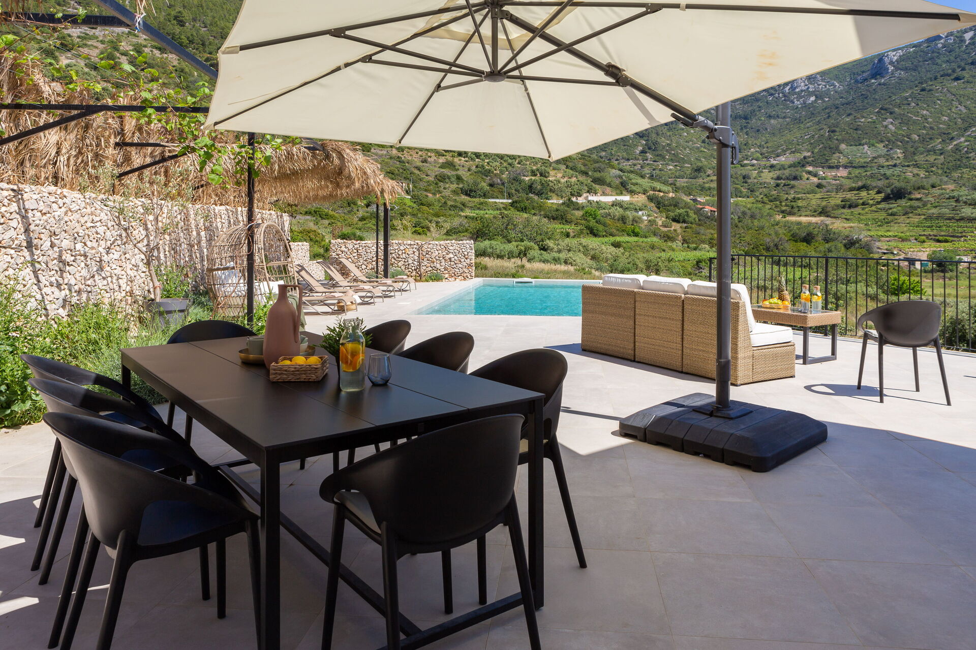 All of the ground floor and first floor rooms have outdoor access. The dining room has direct access to the terrace with the pool.