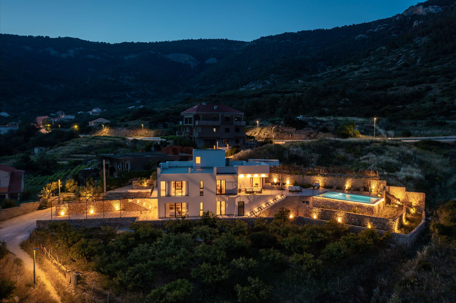 The two-story villa sits next to a hill, and is surrounded by a well-tended terraced garden. There is an elegant heated pool at the villa’s first floor level, which can also be reached via stairs outside.