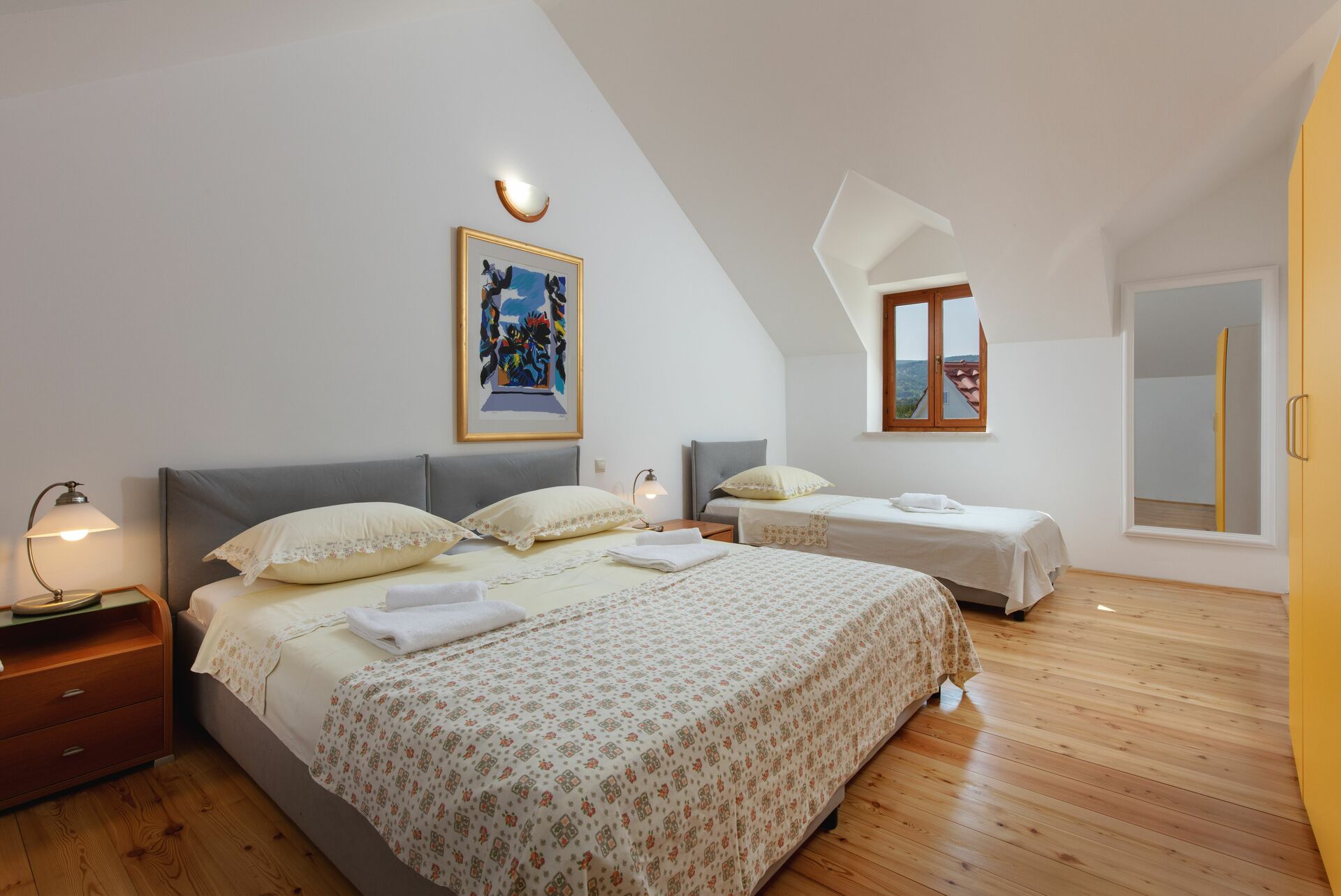 First floor (outdoor access only): double bedroom; bedroom with double bed and one single bed (or the bedroom can have 3 single beds); bathroom with shower.