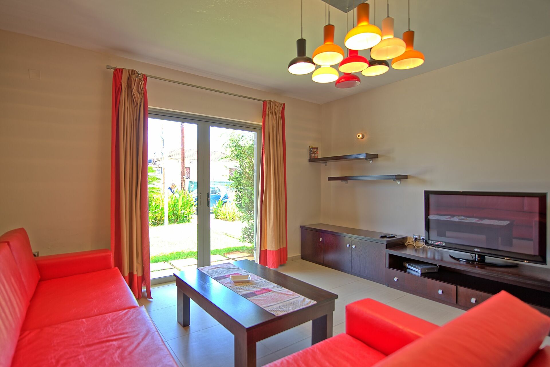 First floor: large living room (satellite TV) with dining area, bar corner (refrigerator) and kitchen (oven, freezer, dishwasher, American coffee maker, microwave); this floor also has direct outside access.