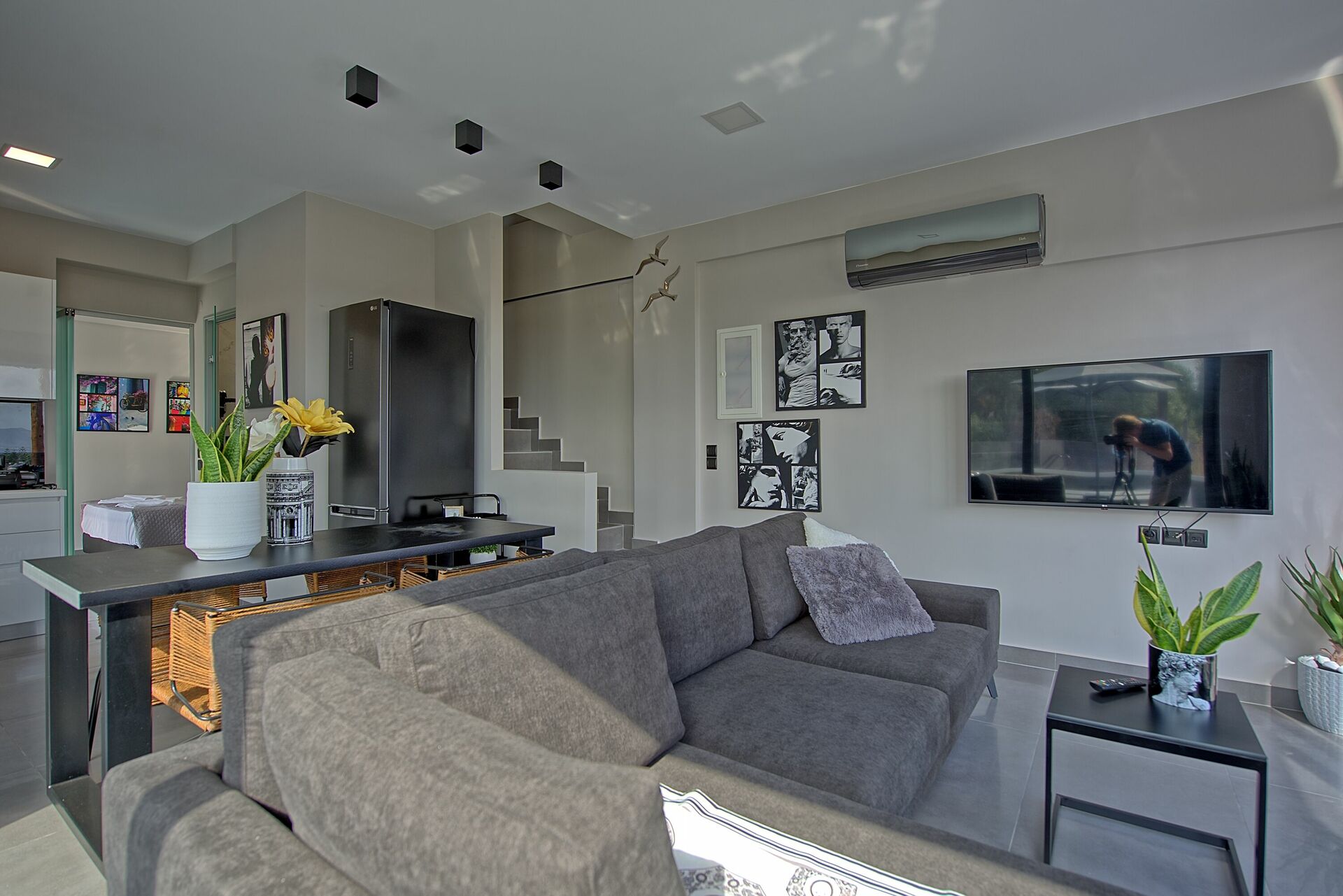Inside is everything you need. Washer, all the things to cook. Smart tvs in every room, good air conditioning.