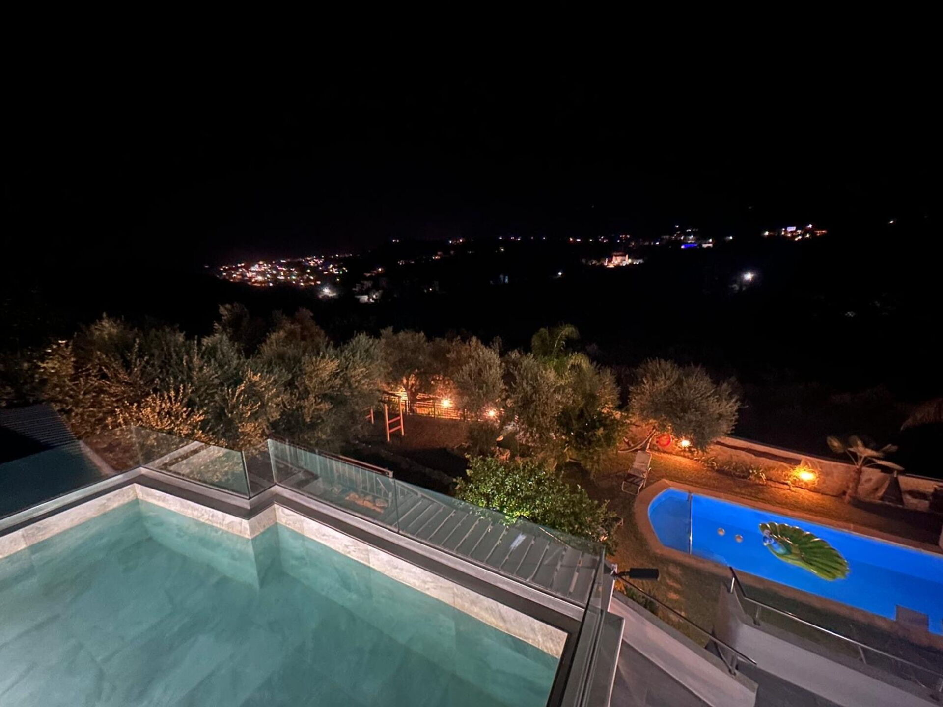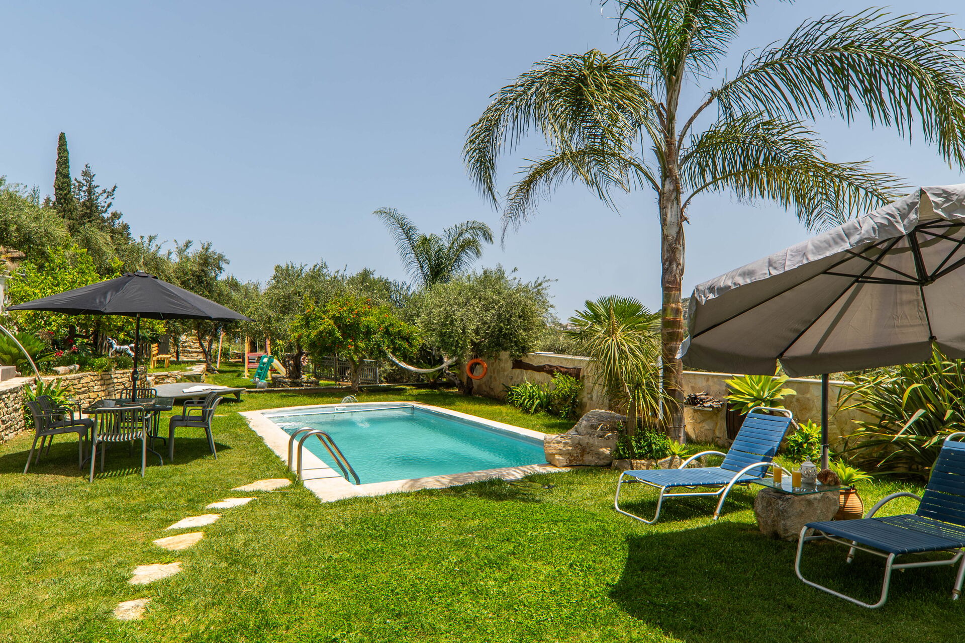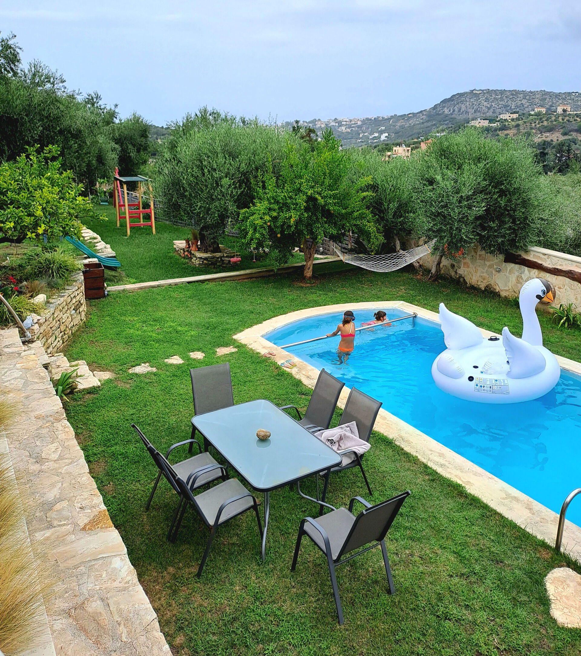 A peaceful paradise minutes from the sea! Everything about our vacation here was peaceful & relaxing, I would highly recommend both the villa & the hosts. Crete is a beautiful island & we’d love to come back!The house is set in spacious surroundings with hammocks, hanging chairs, plenty of seating options & comfortable sunloungers! Inside had luxury conveniences such as a washing machine, dishwasher, powerful showers & AC in the lounge area & all bedrooms. Also large TVs in all the rooms with Netflix & many other options. The decoration is a mix of modern inside & traditional outside with plenty of rustic features like old bicycles, radios or huge ceramic pots! There is a lovely BBQ area, play equipment & numerous places to soak up the sun. The Villa was very clean with hard floors throughout. There were towels for inside & others for the pool, plus the property was cleaned mid-way through our stay! The villa is about 4 minutes drive from Almyrida which is a small village but has plenty of essentials shops and a variety of restaurants. A hire car is essential as the house is a short distance up a short dirt track. Kalyves has a bigger supermarket around 10 minutes drive and then you have larger places about 30 minutes away such as Chania. The villa was as described, it has AC in the main lounge-kitchen and in all the bedrooms. In the villa was a welcome basket with wine and local luxuries! The fridge also had a selection of food and there were everyday essentials provided like toilet roll, hand soap and consumables. The kitchen was really well equipped with all the essentials and more! There was an oven, large fridge freezer, washing machine, dishwasher, utensils, even eggs provided from the owners chickens! The two swimming pools were both high quality & perfect size for water volleyball! There were plenty of sun loungers and places to sit, numerous options spread across the three outside floors of the villa. Excellent beds, with nice mattresses and good quality pillows and bedding. Excellent showers and sinks, nice decoration and clean. Nice touches like wash bins to collect your clothes up in.The decoration is a mix of modern inside & traditional outside with plenty of rustic features like old bicycles, radios or huge ceramic pots! There is a lovely BBQ area, play equipment & numerous patios and places to soak up the sun.Roxani & George own & host a beautiful villa set in the hills with great views. The hosts are excellent communicators available 24/7. They also gave good recommendations to keep us occupied throughout our stay!