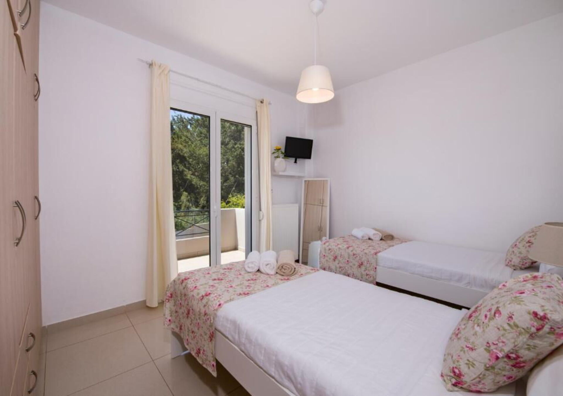Raised ground floor: living room (TV) with dining area and kitchen (refrigerator, freezer, oven, dishwasher, microwave, coffee maker), double bedroom with balcony access, bathroom with shower, double bedroom, bathroom with bathtub (washing machine), bedroom with two single beds and balcony access.