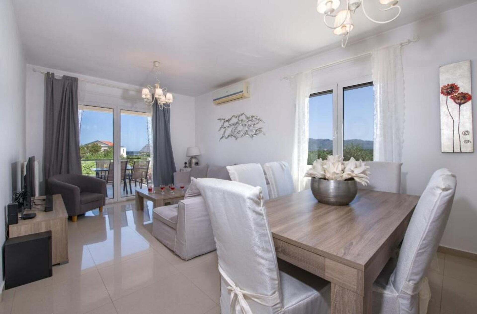 The bright living room has access to the terrace with an outdoor dining area furnished with a table and chairs.
