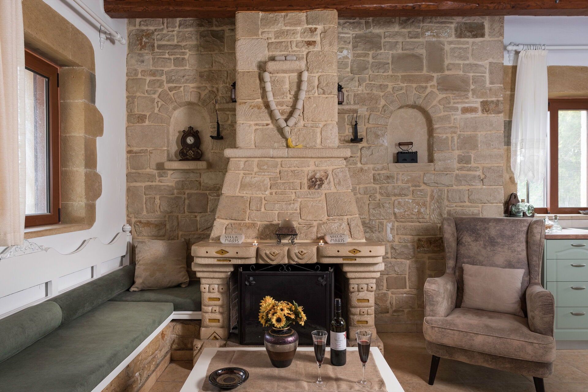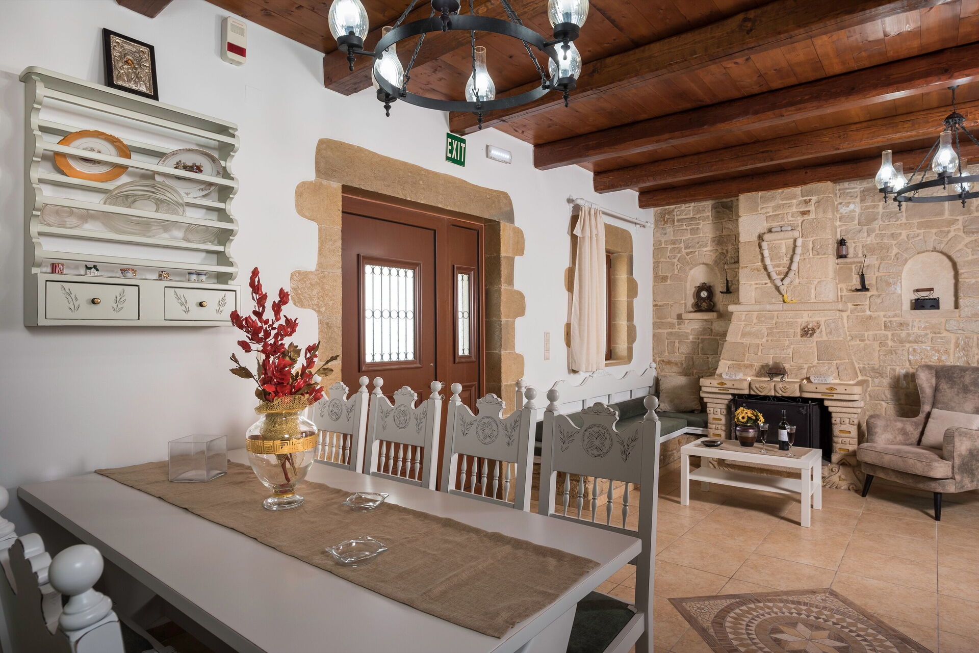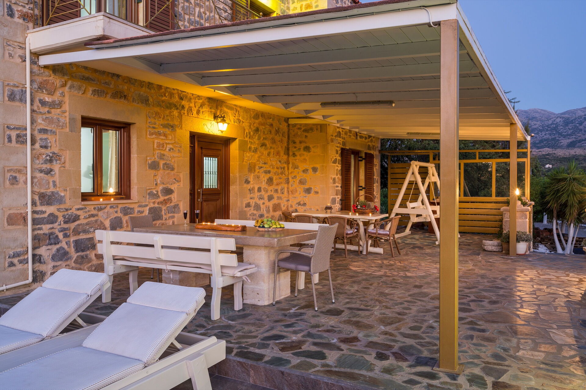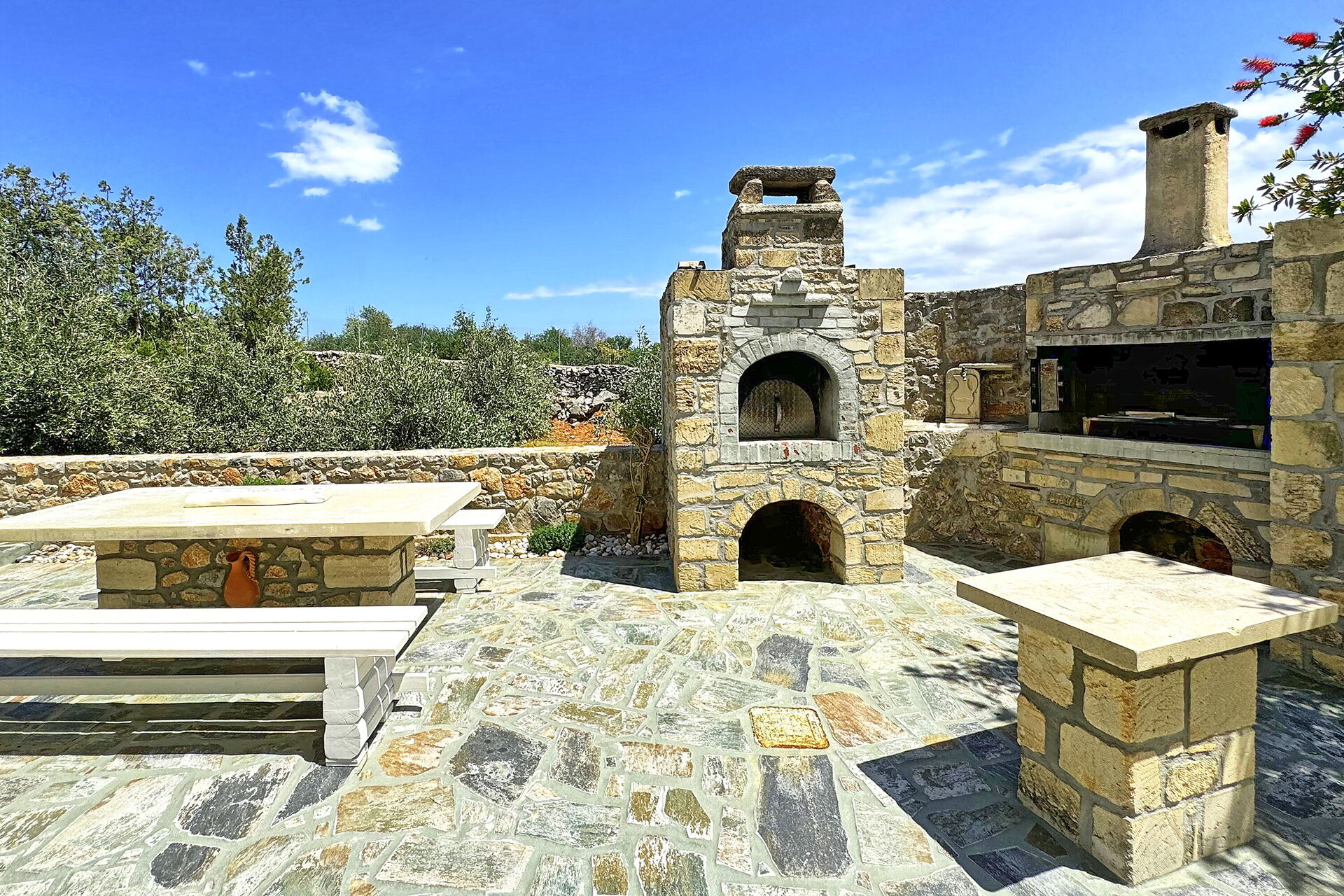 This splendid vacation villa rental is surrounded by a large garden with characteristic Mediterranean shrub trees and plants. Villa guests can enjoy time outdoors by the beautiful private pool; the elegant veranda next to the kitchen; the stone table among the olive trees; and the barbecue area behind the house. The small church of Agios Ioannis Erimitis, which was built by the current owner’s father, is also part of the property. There is even a two-hole mini golf course in the shade of a large tree behind the house.