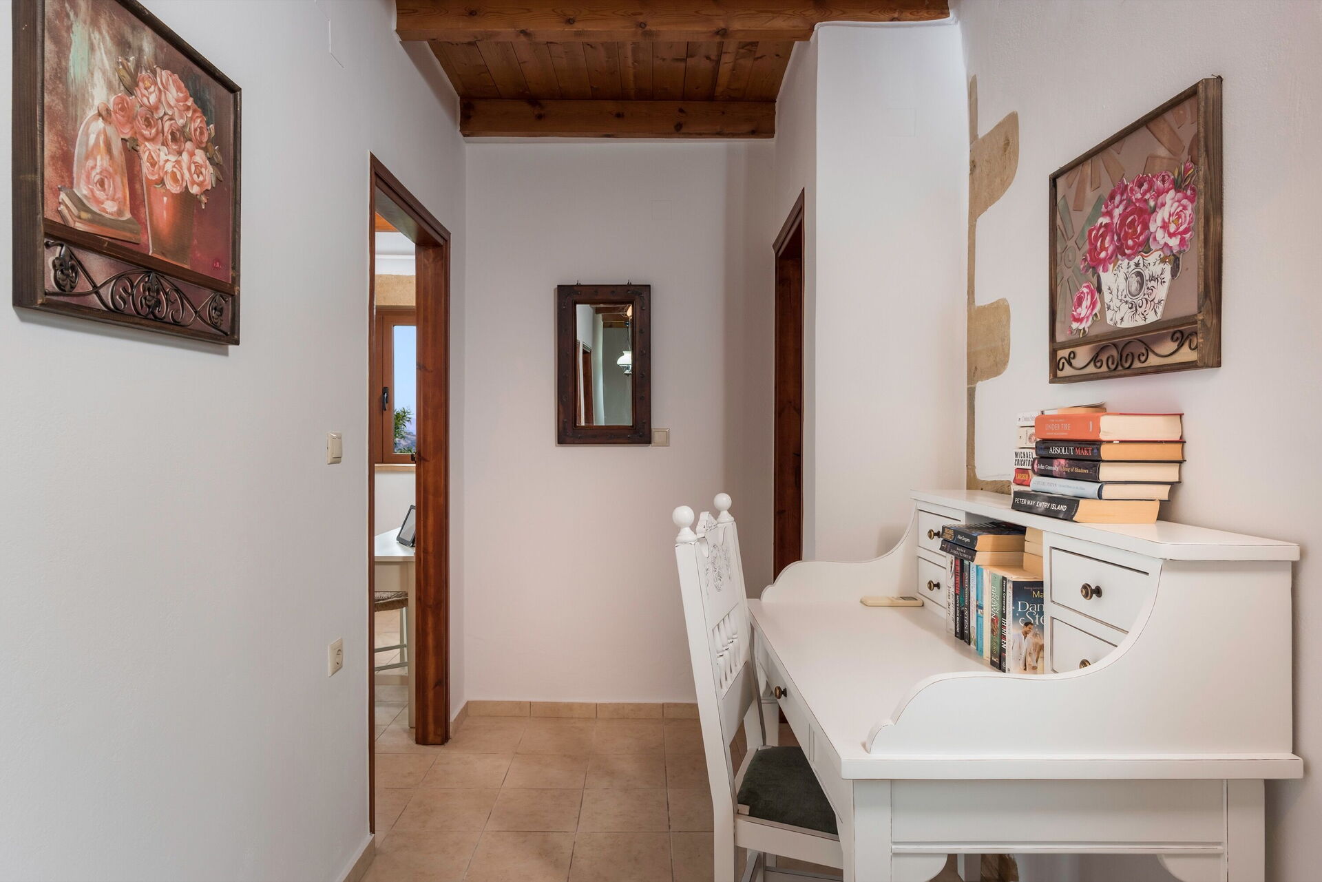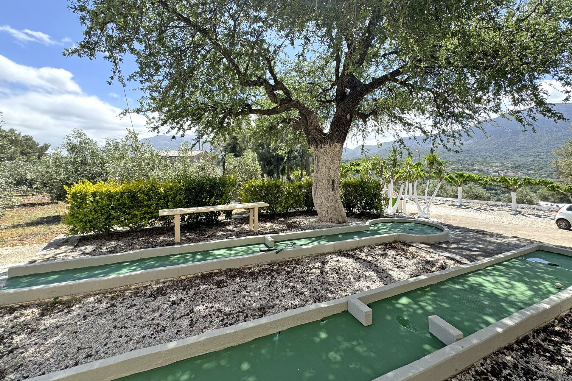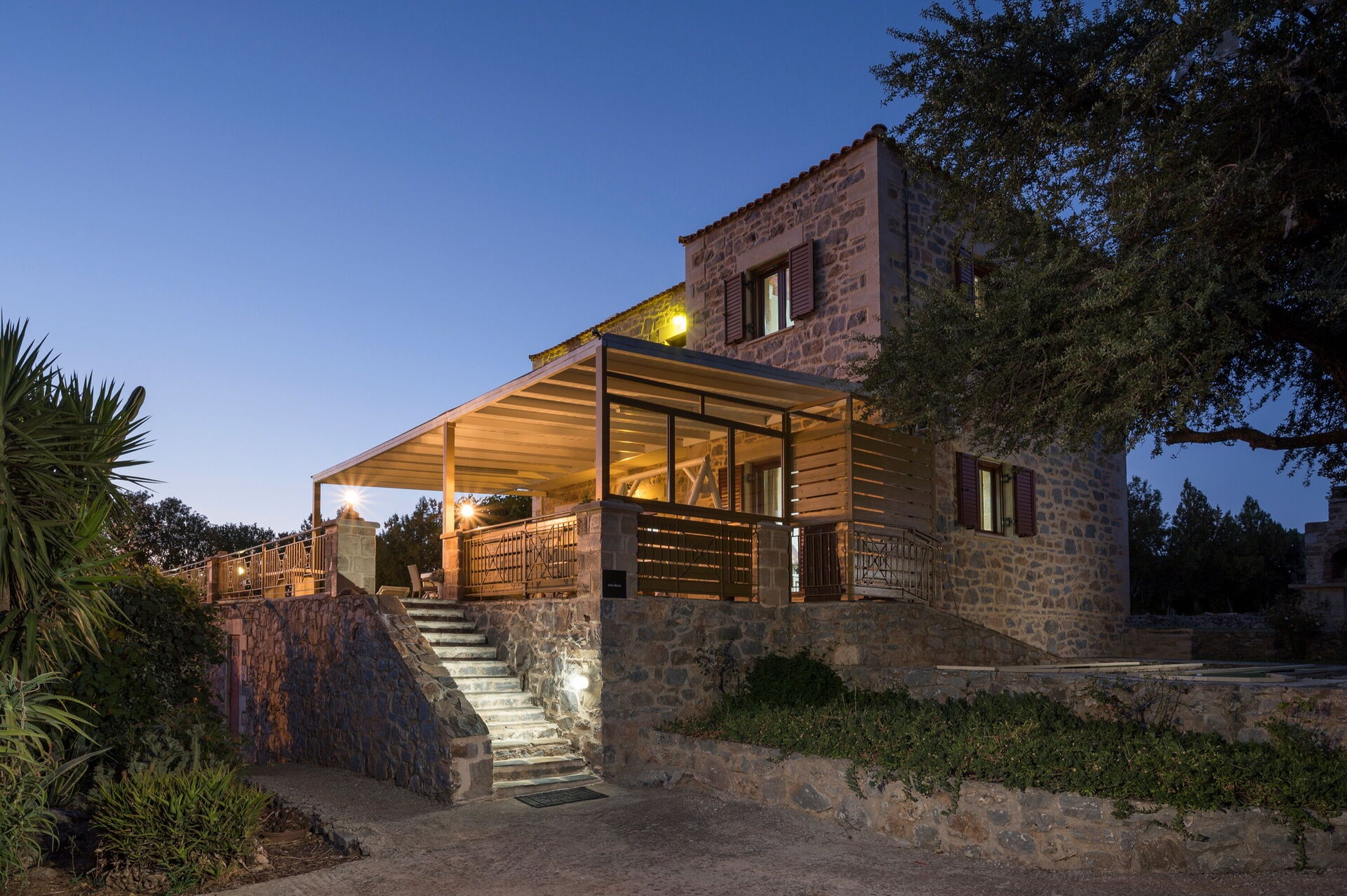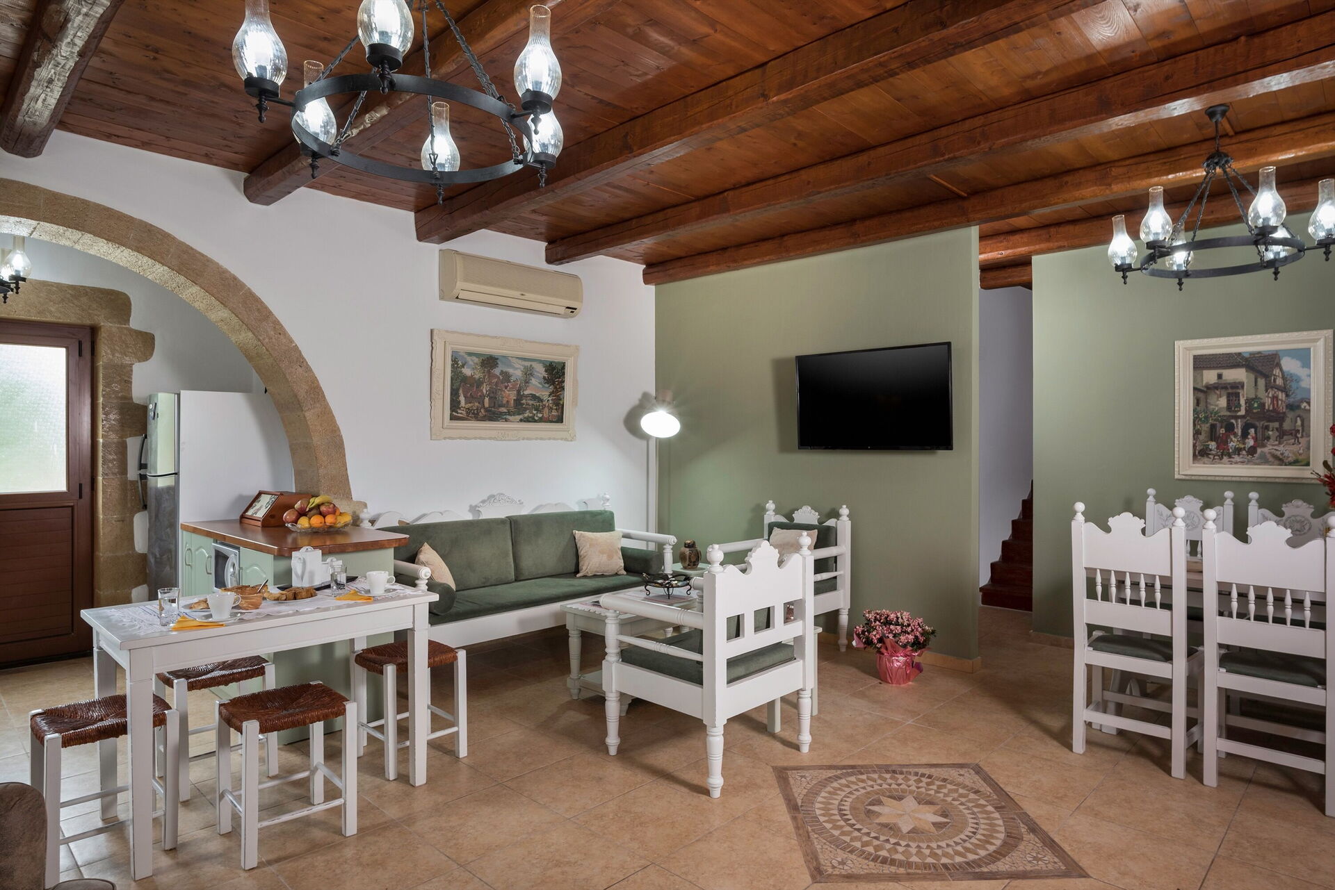 This splendid vacation villa rental is surrounded by a large garden with characteristic Mediterranean shrub trees and plants. Villa guests can enjoy time outdoors by the beautiful private pool; the elegant veranda next to the kitchen; the stone table among the olive trees; and the barbecue area behind the house. The small church of Agios Ioannis Erimitis, which was built by the current owner’s father, is also part of the property. There is even a two-hole mini golf course in the shade of a large tree behind the house.