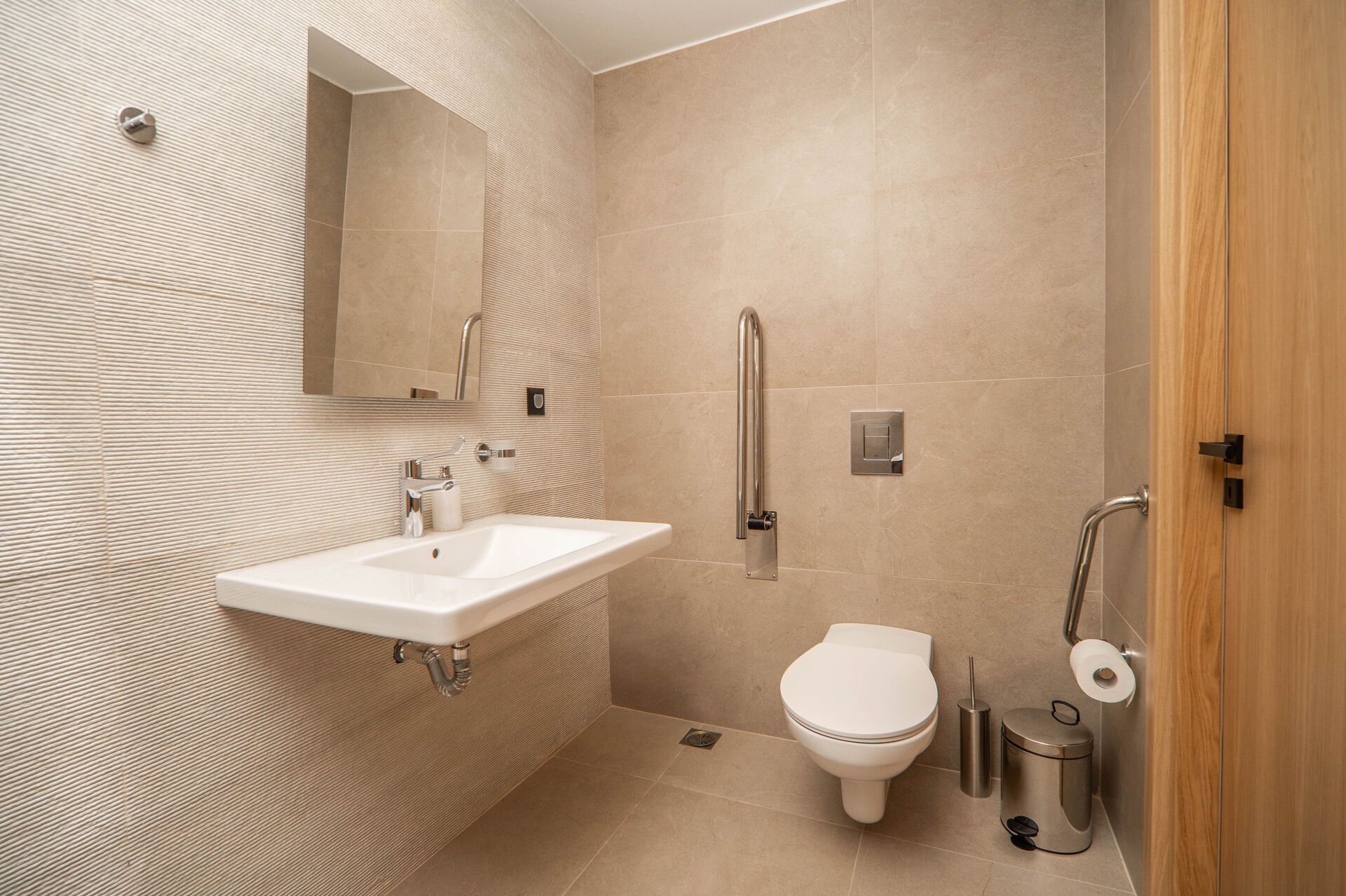 Ground floor: living area with living room, dining area and kitchen (dishwasher, oven, microwave, coffee maker, freezer, toaster, electric kettle), double bedroom with private bathroom with shower (the bathroom is suitable for people with disabilities).