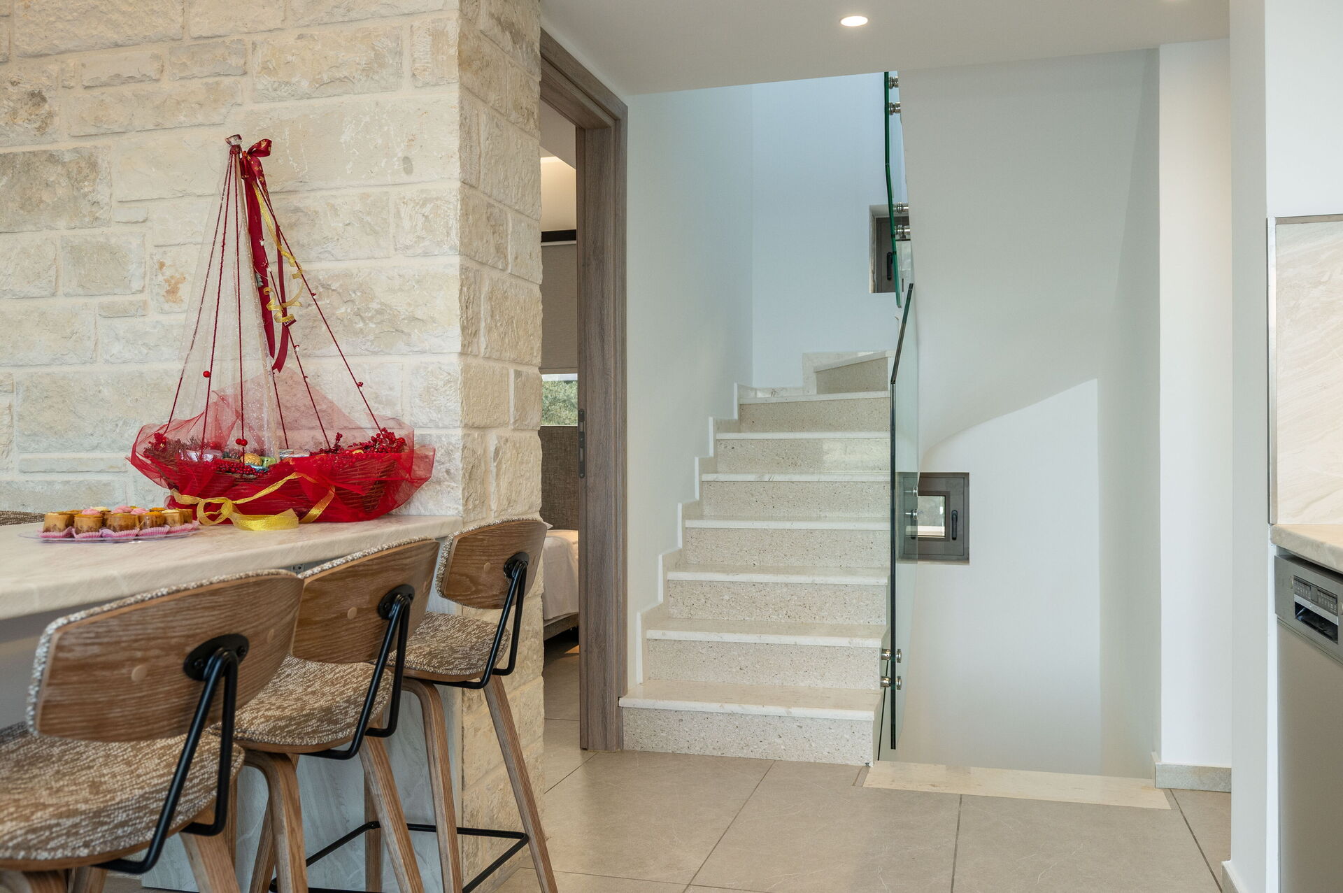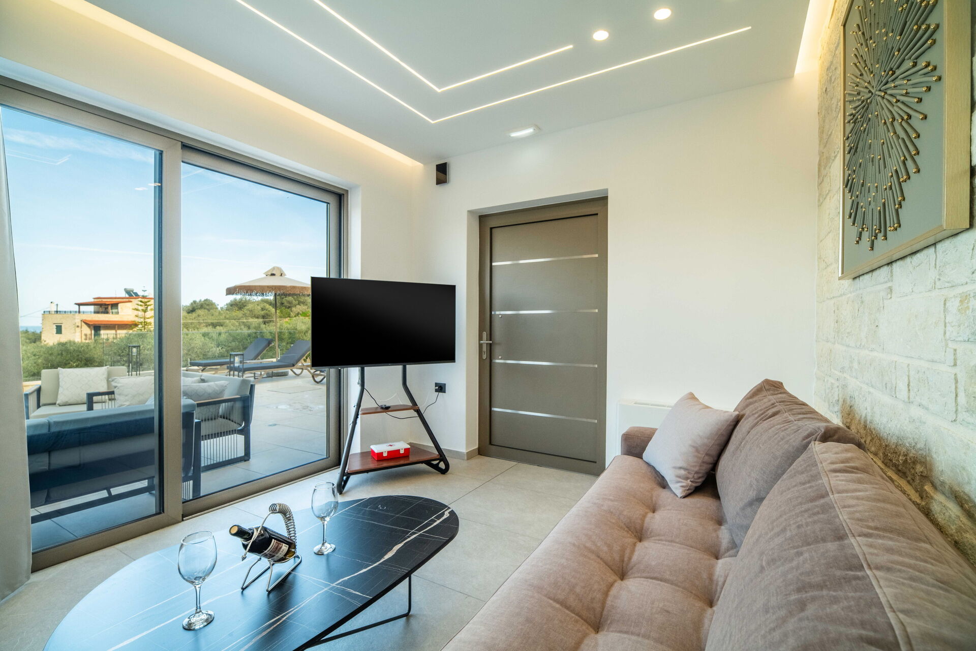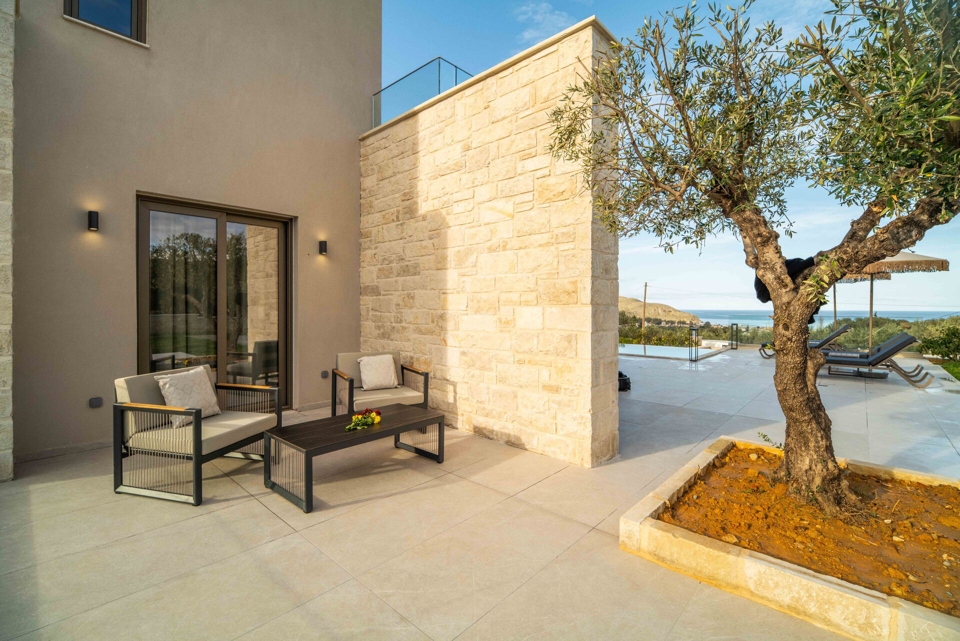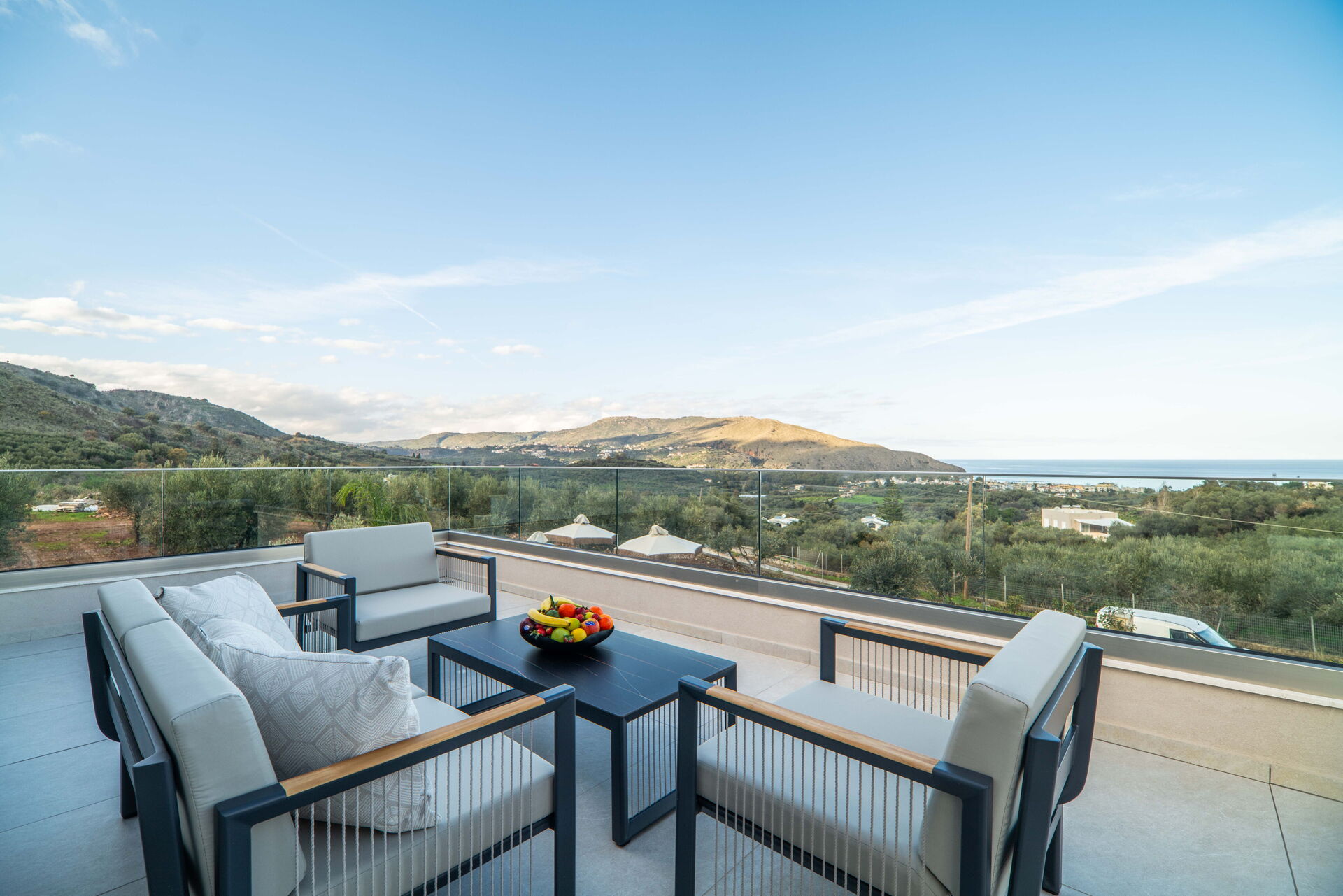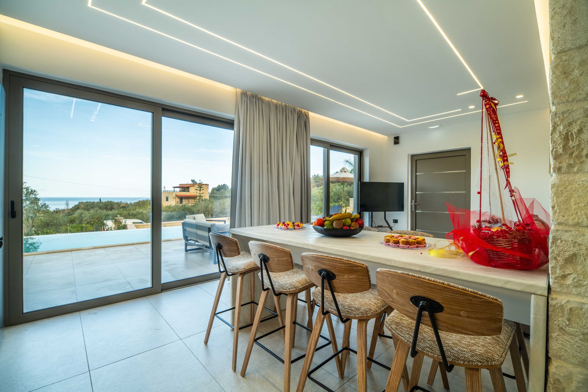 Construction of the villa was finished in January 2026, and everything in Villa Vasilissa is brand new: a scenic pool with panoramic views of the sea and Cretan countryside awaits you for refreshing swims on hot summer days. Inside, the villa has 3 floors and a total of 5 bedrooms: two on the first floor, two on the ground floor, and one on a lower floor, which is just as comfortable and well equipped. An indoor dining area offers beautiful views of the pool, countryside, and the sea. There is also an outdoor area furnished for al fresco dining.
