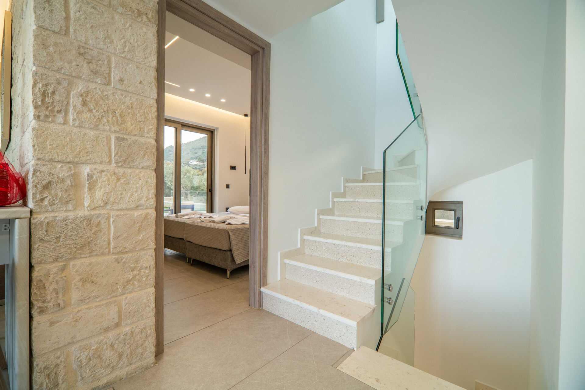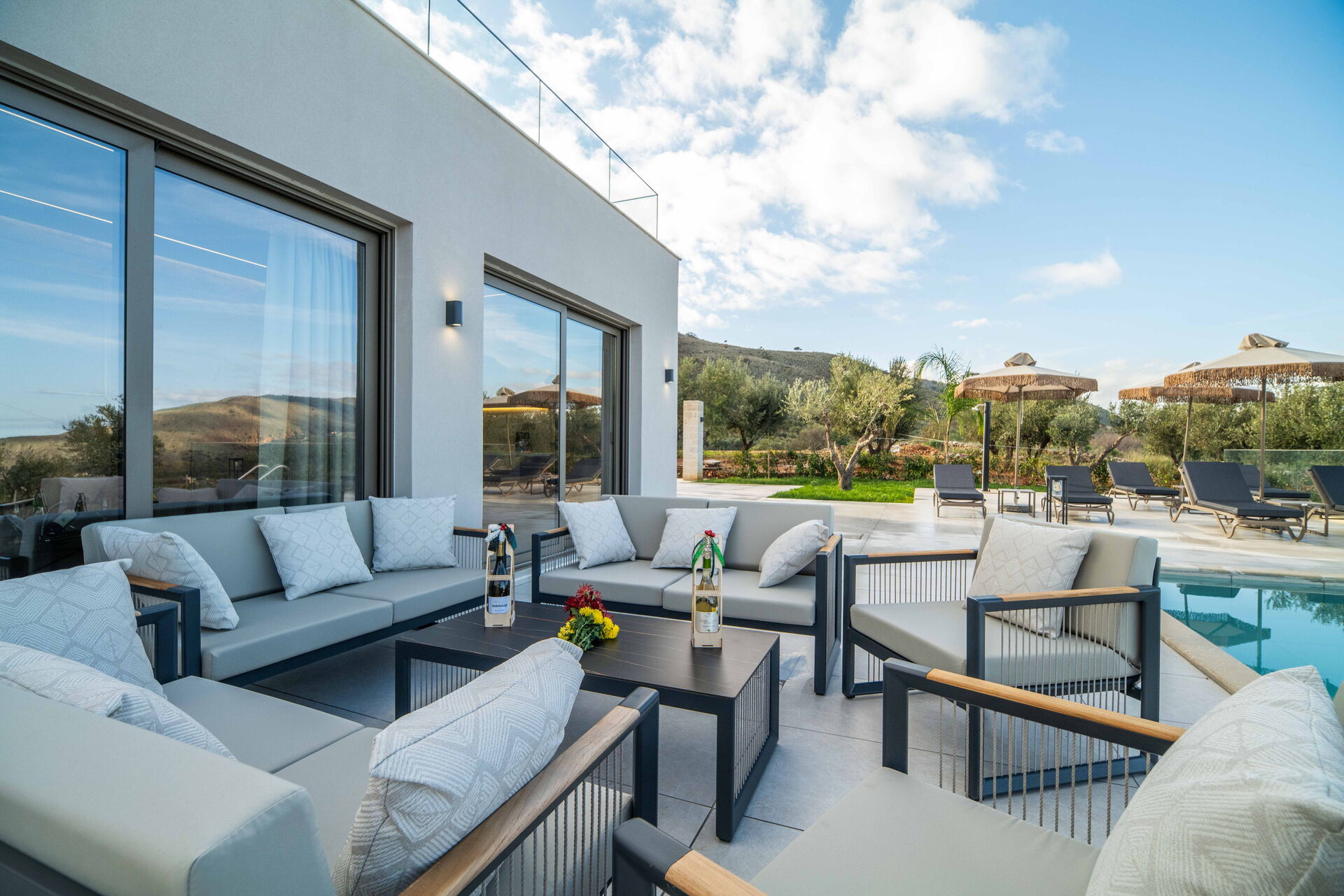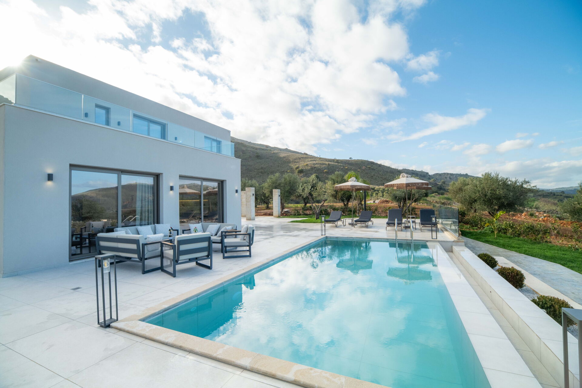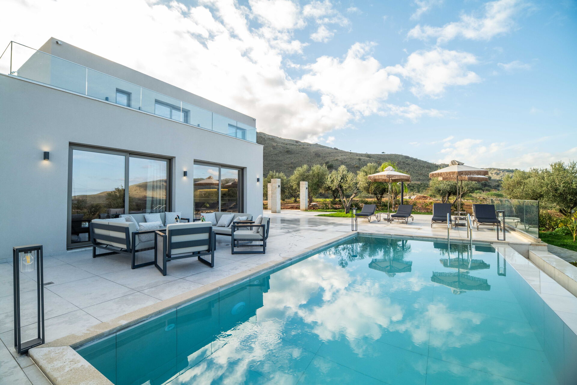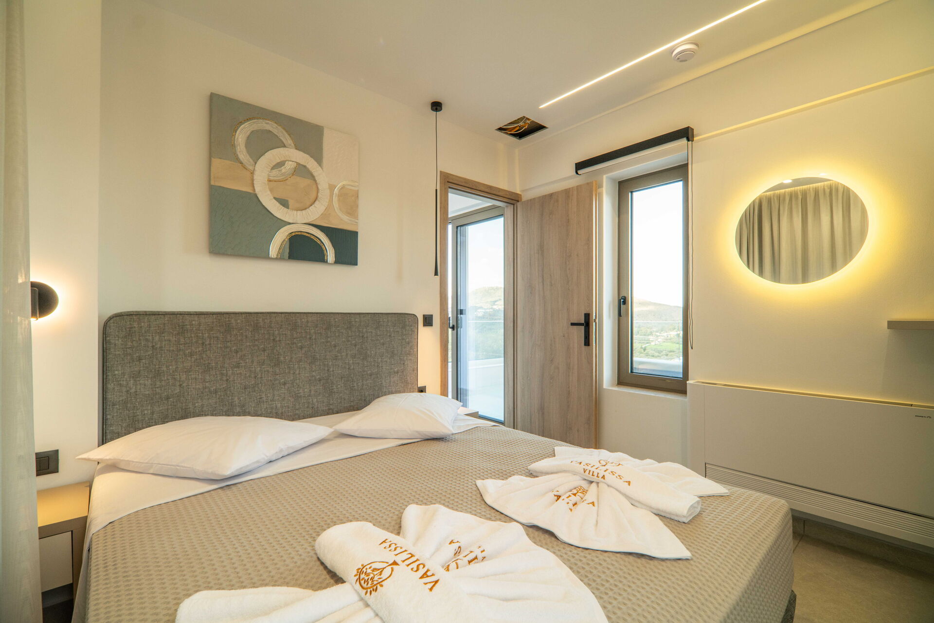 Construction of the villa was finished in January 2026, and everything in Villa Vasilissa is brand new: a scenic pool with panoramic views of the sea and Cretan countryside awaits you for refreshing swims on hot summer days. Inside, the villa has 3 floors and a total of 5 bedrooms: two on the first floor, two on the ground floor, and one on a lower floor, which is just as comfortable and well equipped. An indoor dining area offers beautiful views of the pool, countryside, and the sea. There is also an outdoor area furnished for al fresco dining.