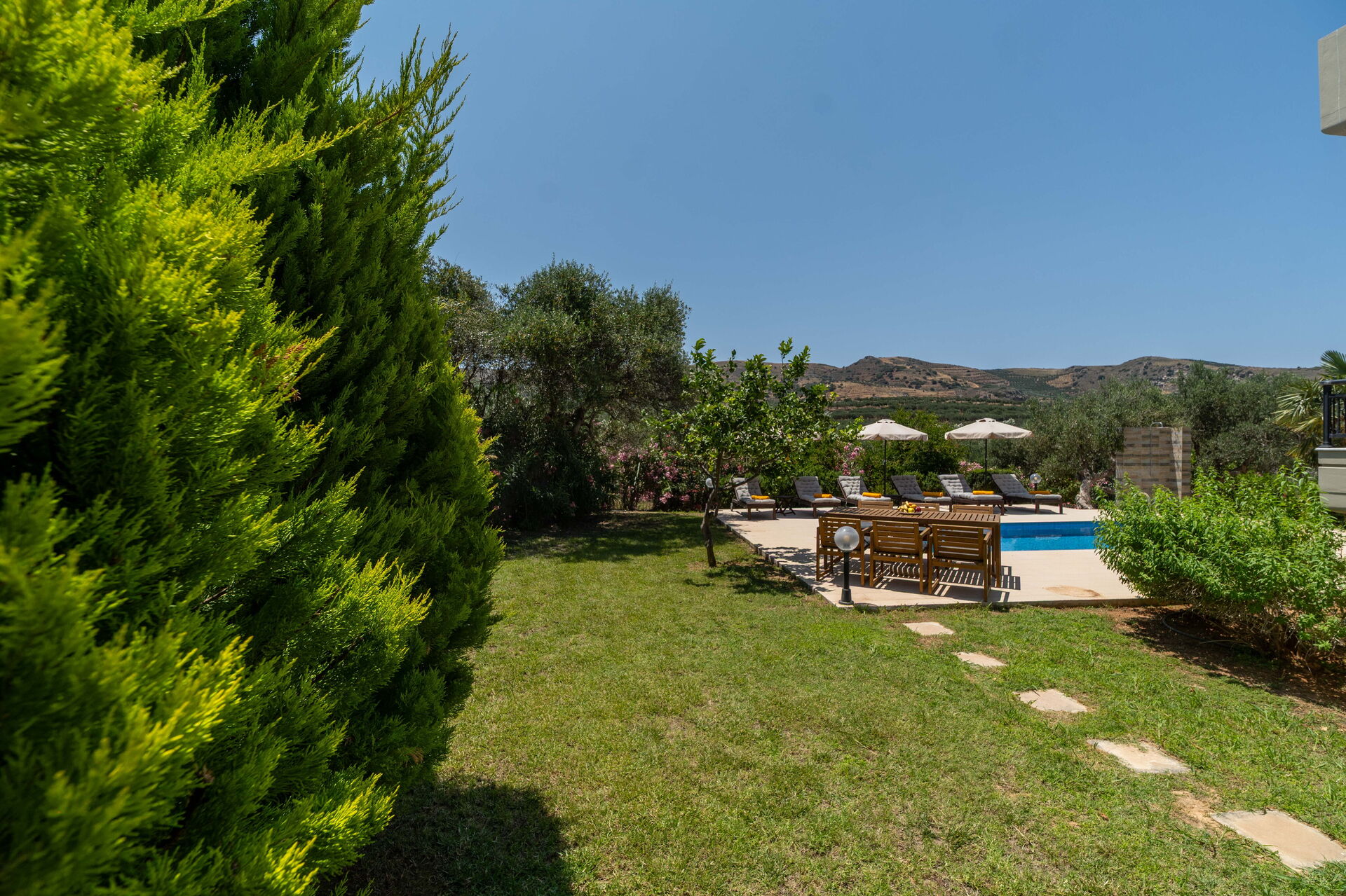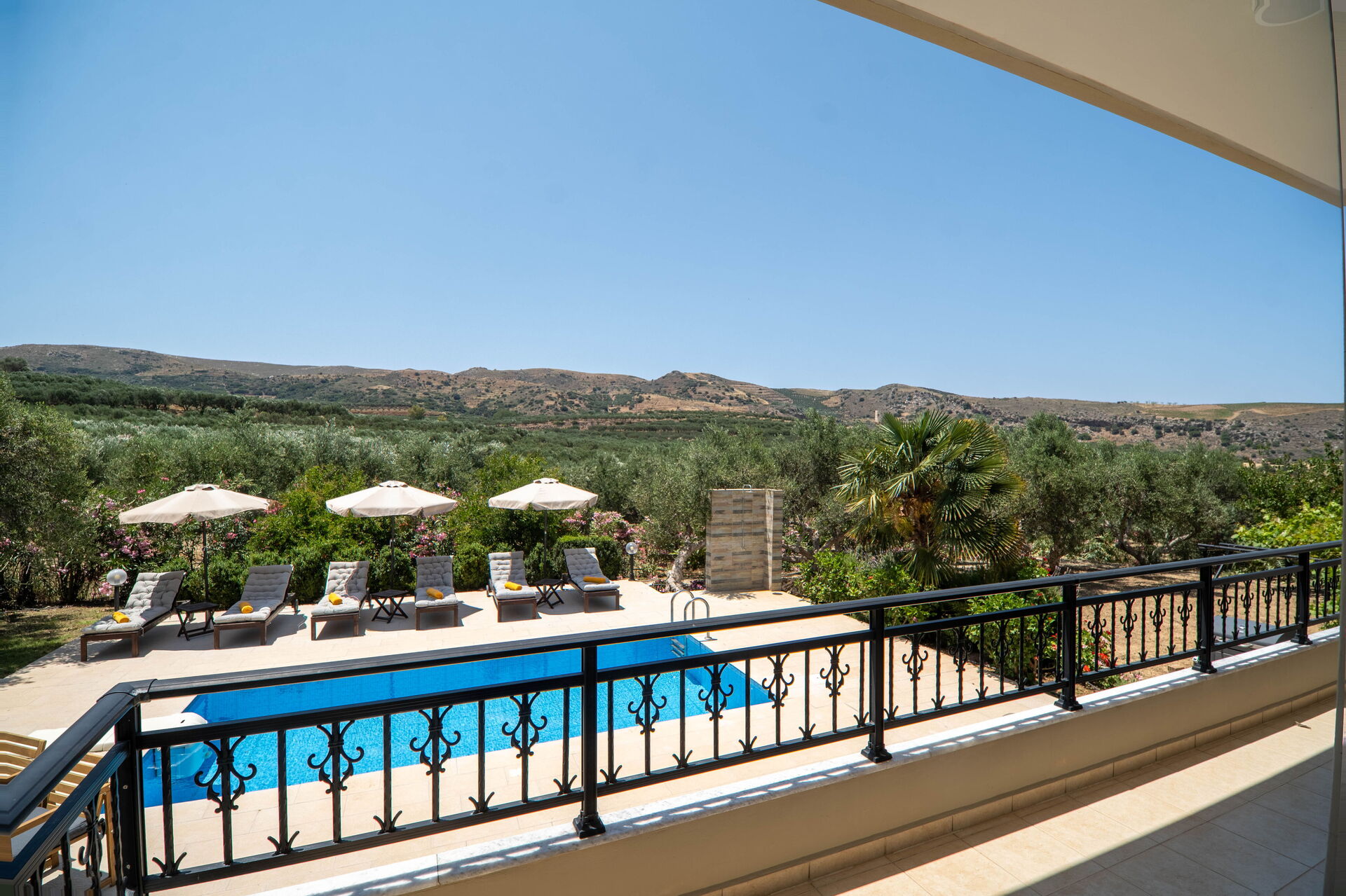 The grounds surrounding the house have a well-tended garden and various scenic terraces. One has an outdoor dining area, and a beautiful pool with a sunbathing area, sun loungers and tables. It is the perfect place to relax under the Cretan sun and cool off with friends or family while enjoying views of the sea and surrounding hills.