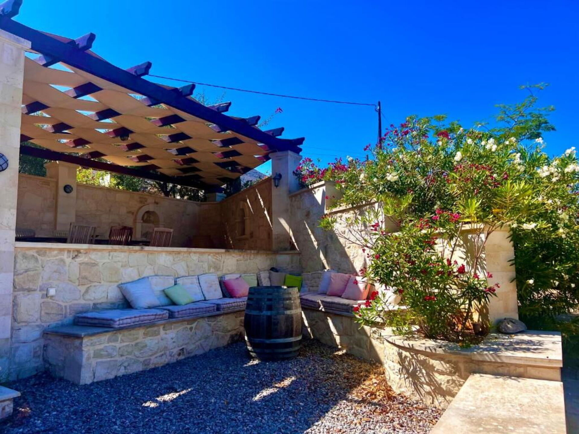 This villa’s central location is within an easy drive to Crete’s most famous areas, so you can explore the entire island: don’t miss the cities of Chania and Rethimno; charming villages sprinkled here and there; Lake Kournas; and the gorgeous sea nearby in the towns of Almyrida and Georgioupolis.