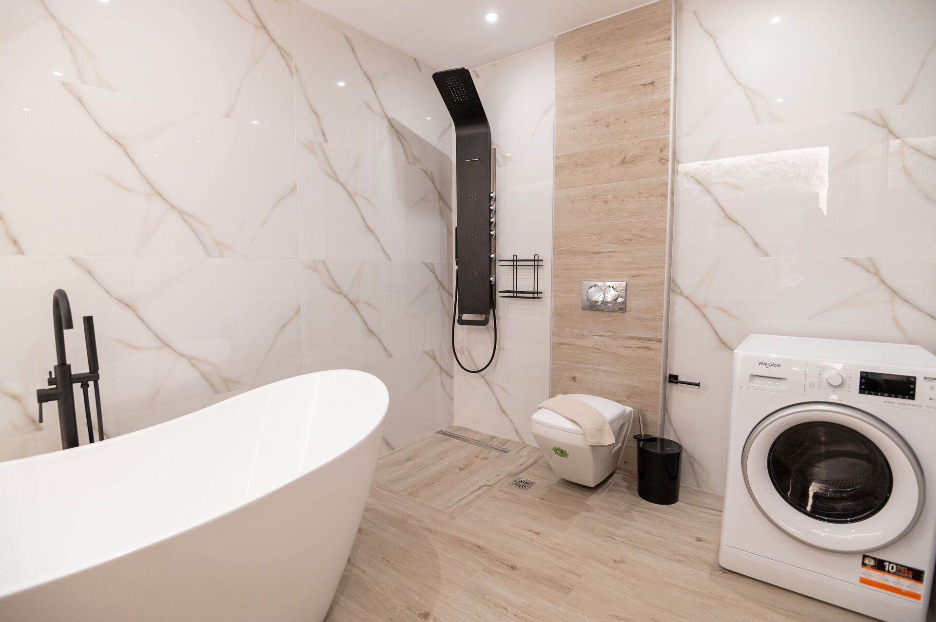 The first unit offers 4 bedrooms (1 is a pass-through room) and 3 bathrooms; it can accommodate up to 12 people