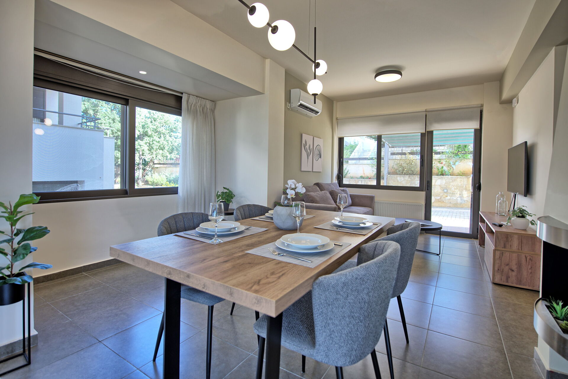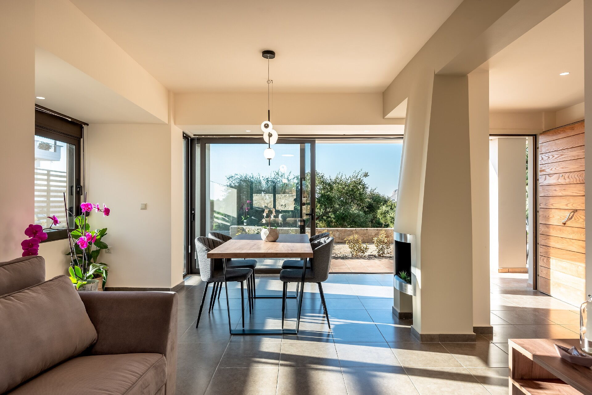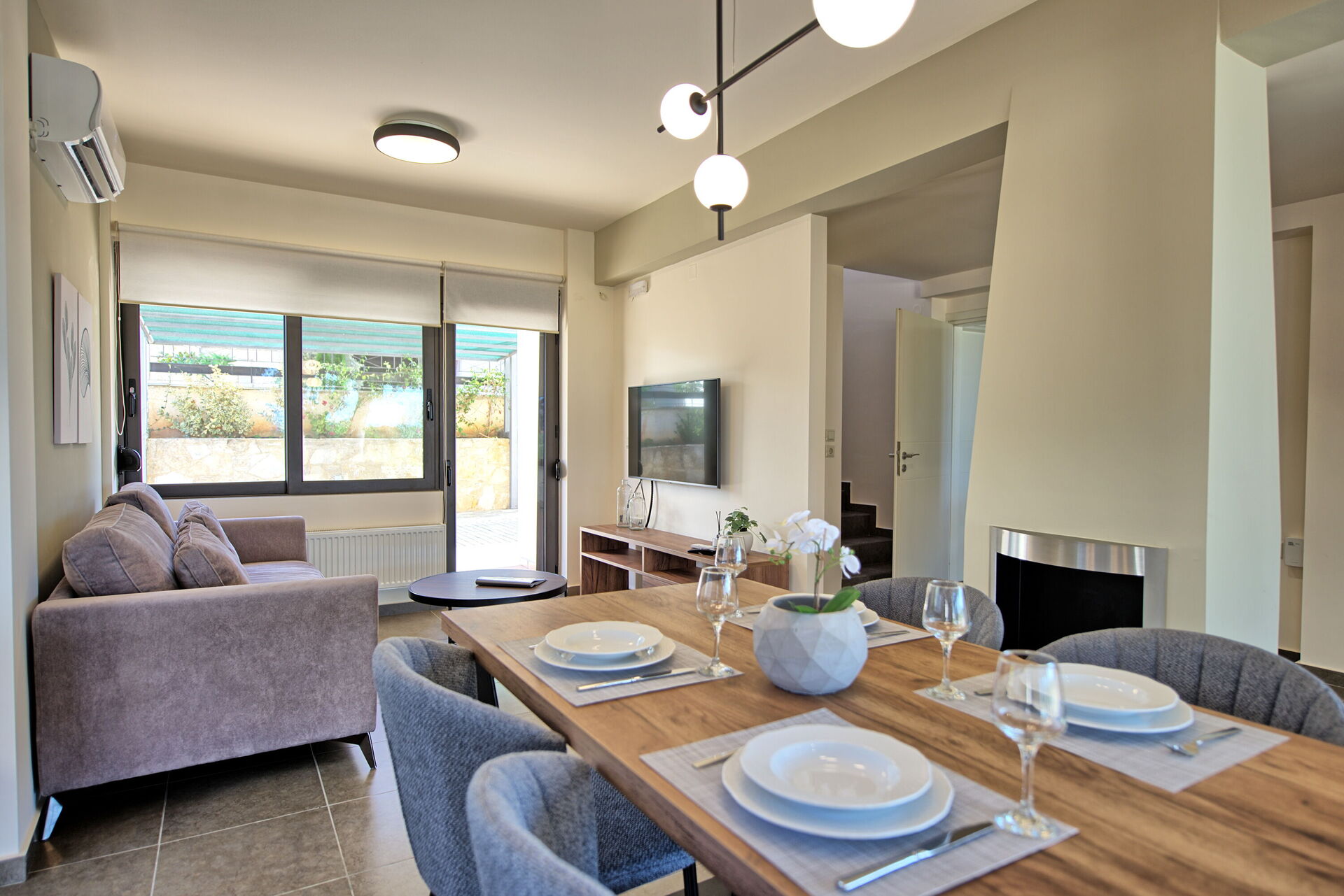 The marvelous villa rental is part of a complex of 4 sister houses, all of them featured in our website (Iris, Dioni, Phaedra e Aelia). The beautiful, 3-level share of a villa offers 2 bedrooms and a room with a sofa bed, to accommodate up to 5 people. This modern house features not only prestigious furniture but also plenty of light: the large windows make every room in the villa rental incredibly bright.