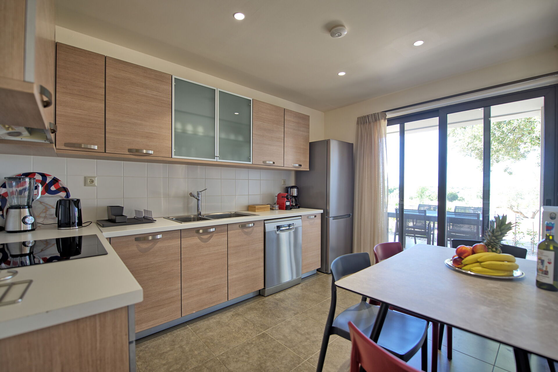 Ground floor: entrance and large living room (fireplace, TV) with dining area and kitchen (coffee machine, refrigerator, freezer, oven, dishwasher), WC. From the living room and the kitchen there is access to the covered patio at the front of the house, and to the back of the house.