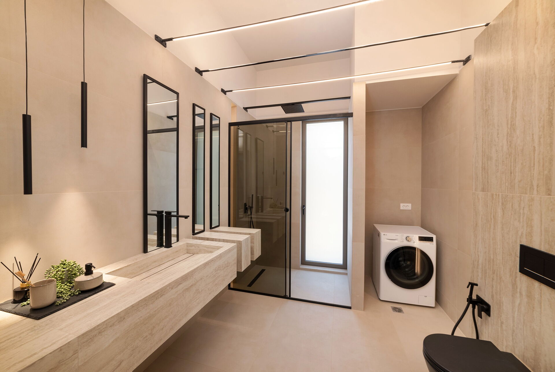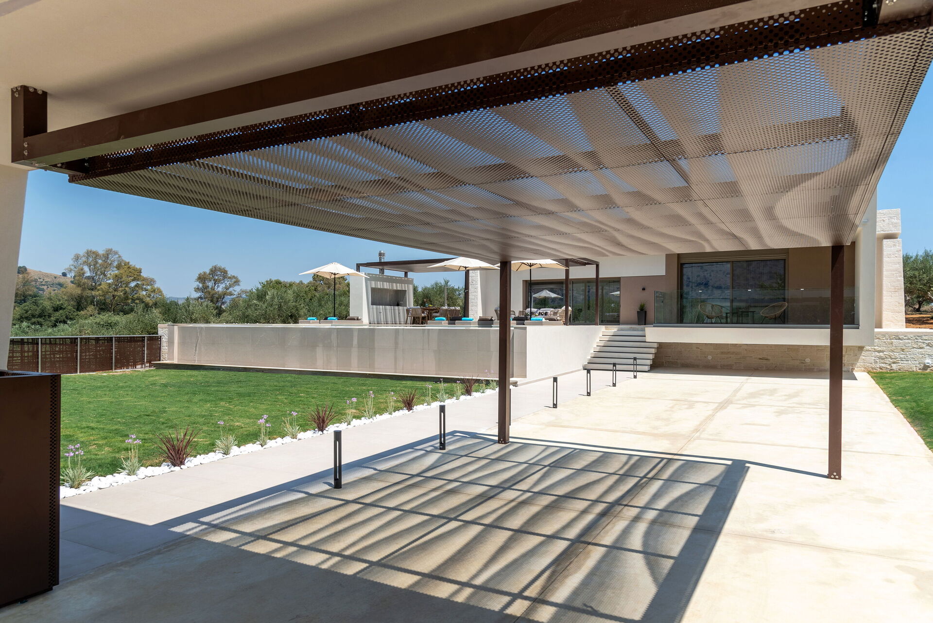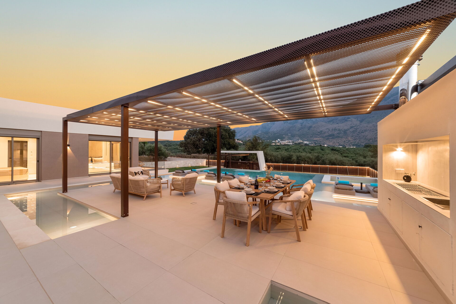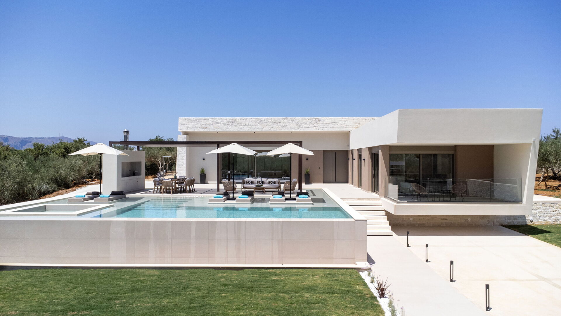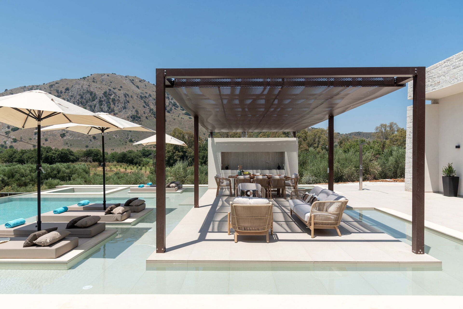 Design and comfort distinguish this bright, luxurious villa: the furniture and layout have been chosen with great care. Inside and outside it has been designed to offer the utmost comfort. It can accommodate up to 7/8 people in 4 bedrooms, and outside there is a large, furnished cooking and dining area for enjoying Crete’s beautiful sunny days. Not only that, there is a gorgeous private pool (with a whirlpool area, that can be heated up upon request) where guests can cool off and have fun.