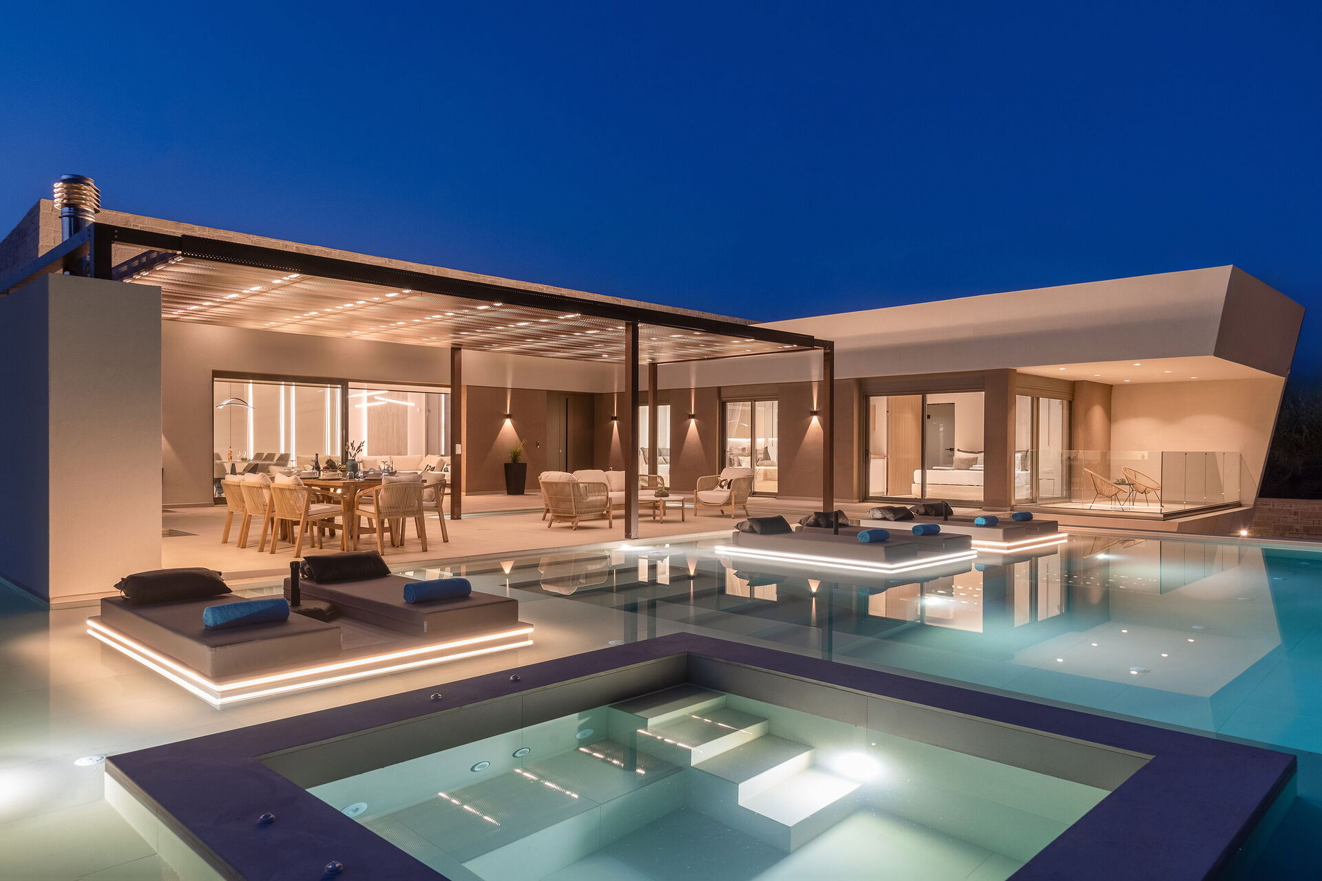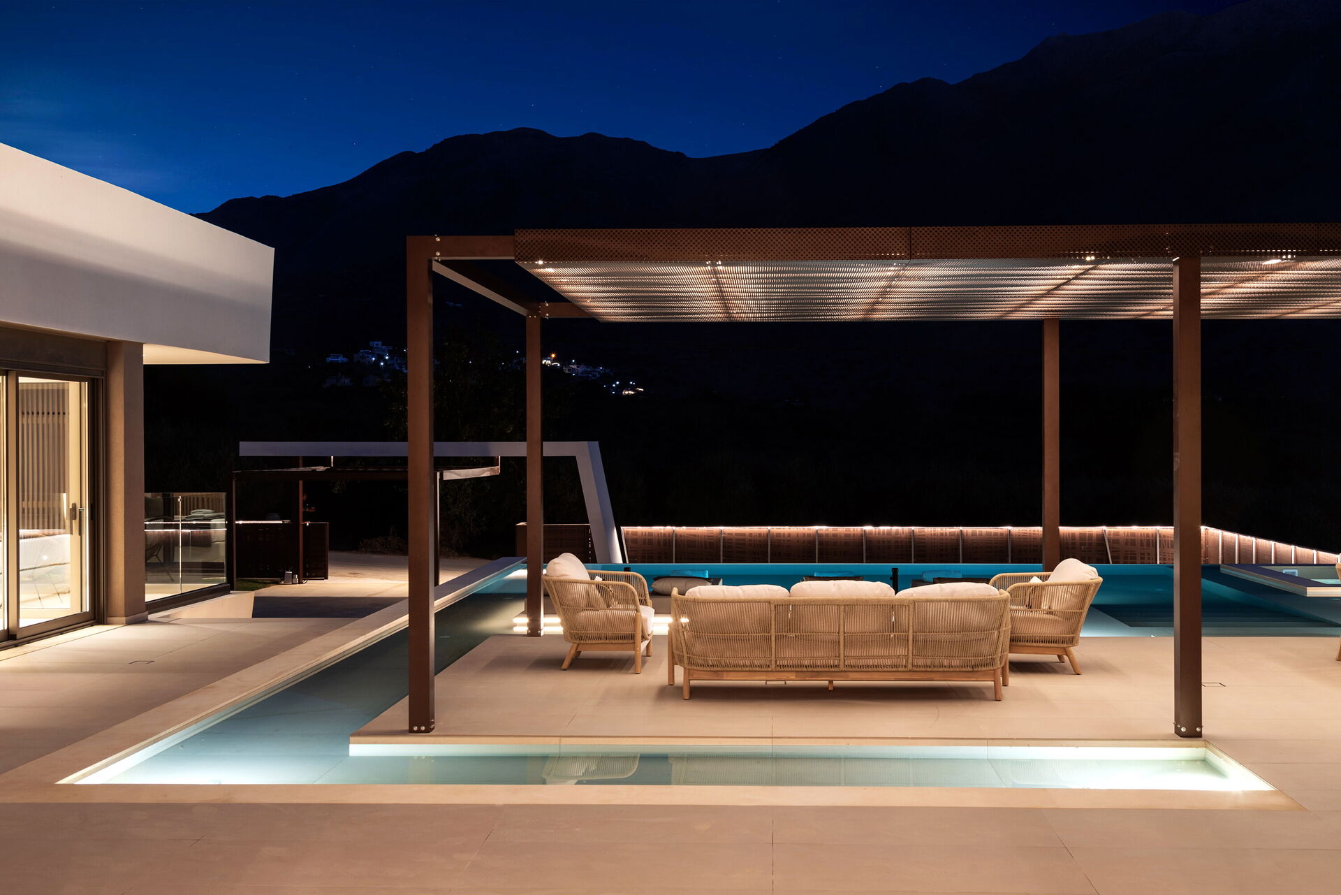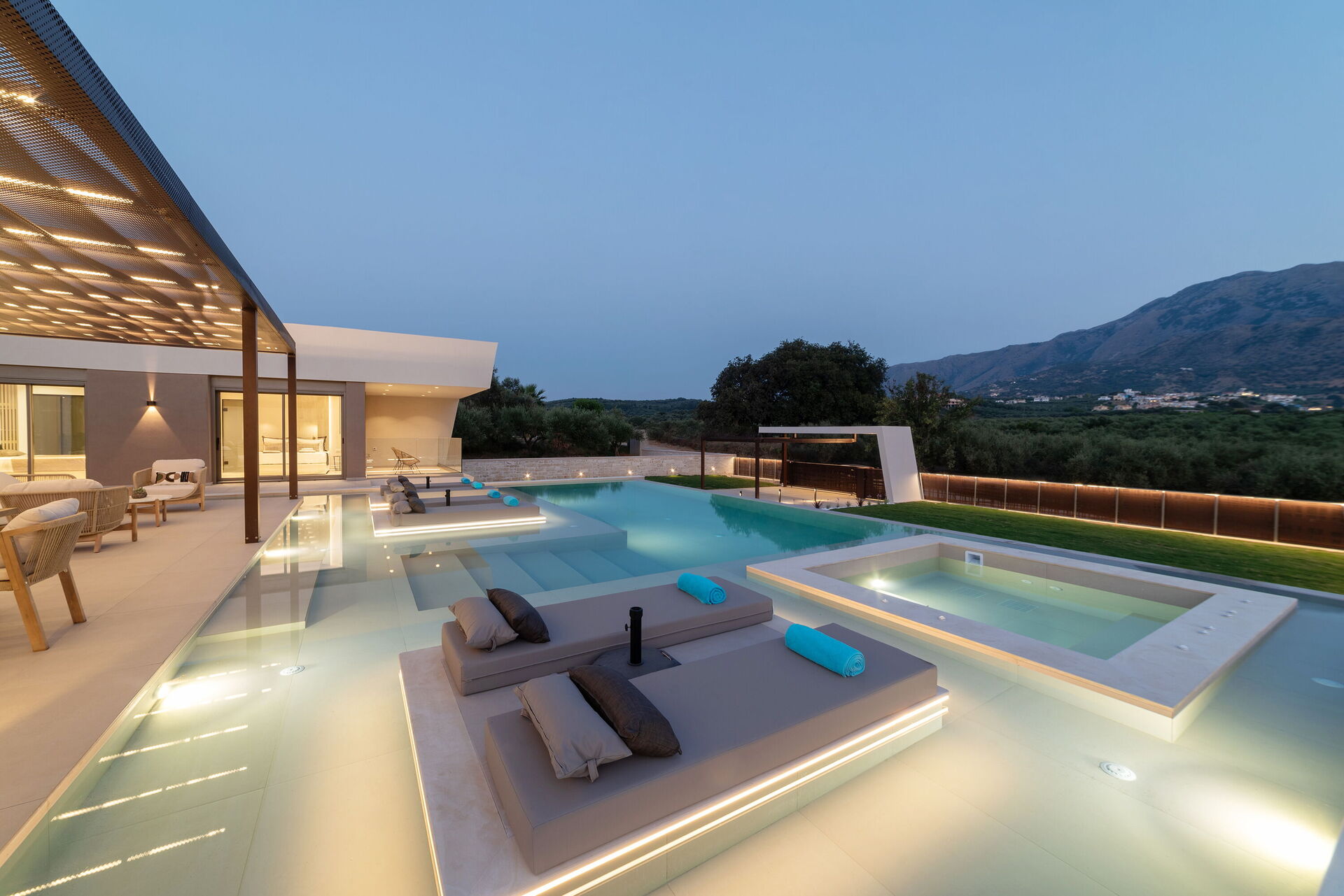 Villa El is a fantastic villa in the renowned Lake Kournas area, just 4 km from the beaches of Crete’s north coast. This ultra modern villa with 4 bedrooms, and a fantastic outdoor area with private pool with heated whirlpool area, is the place for a truly exclusive vacation with friends or family.