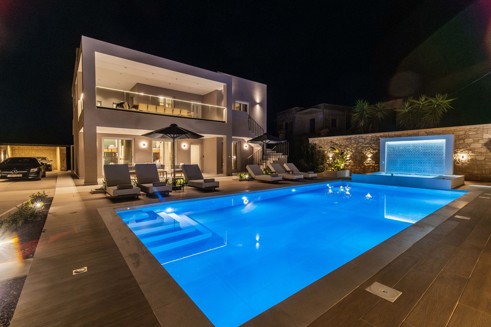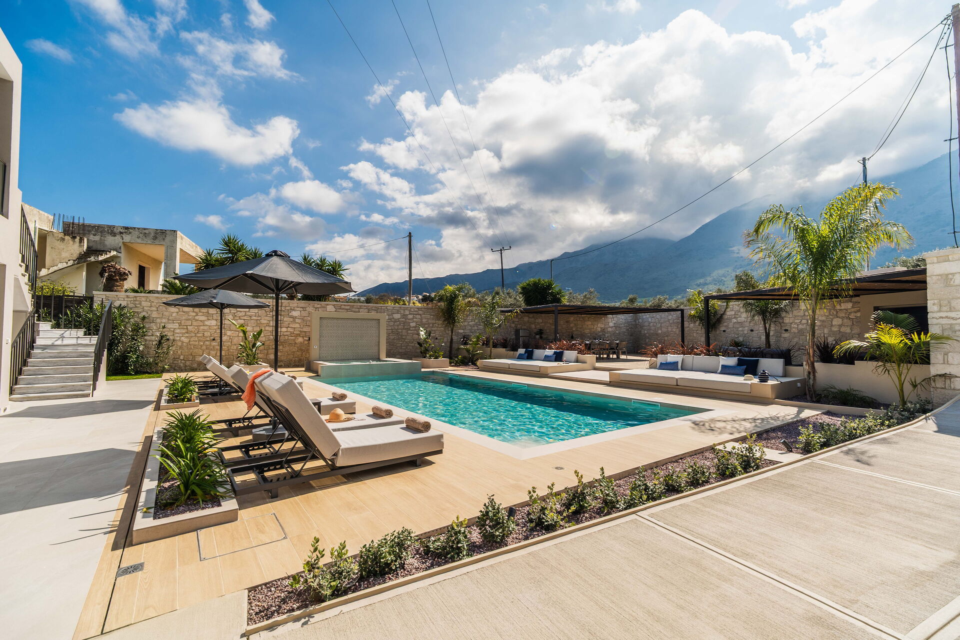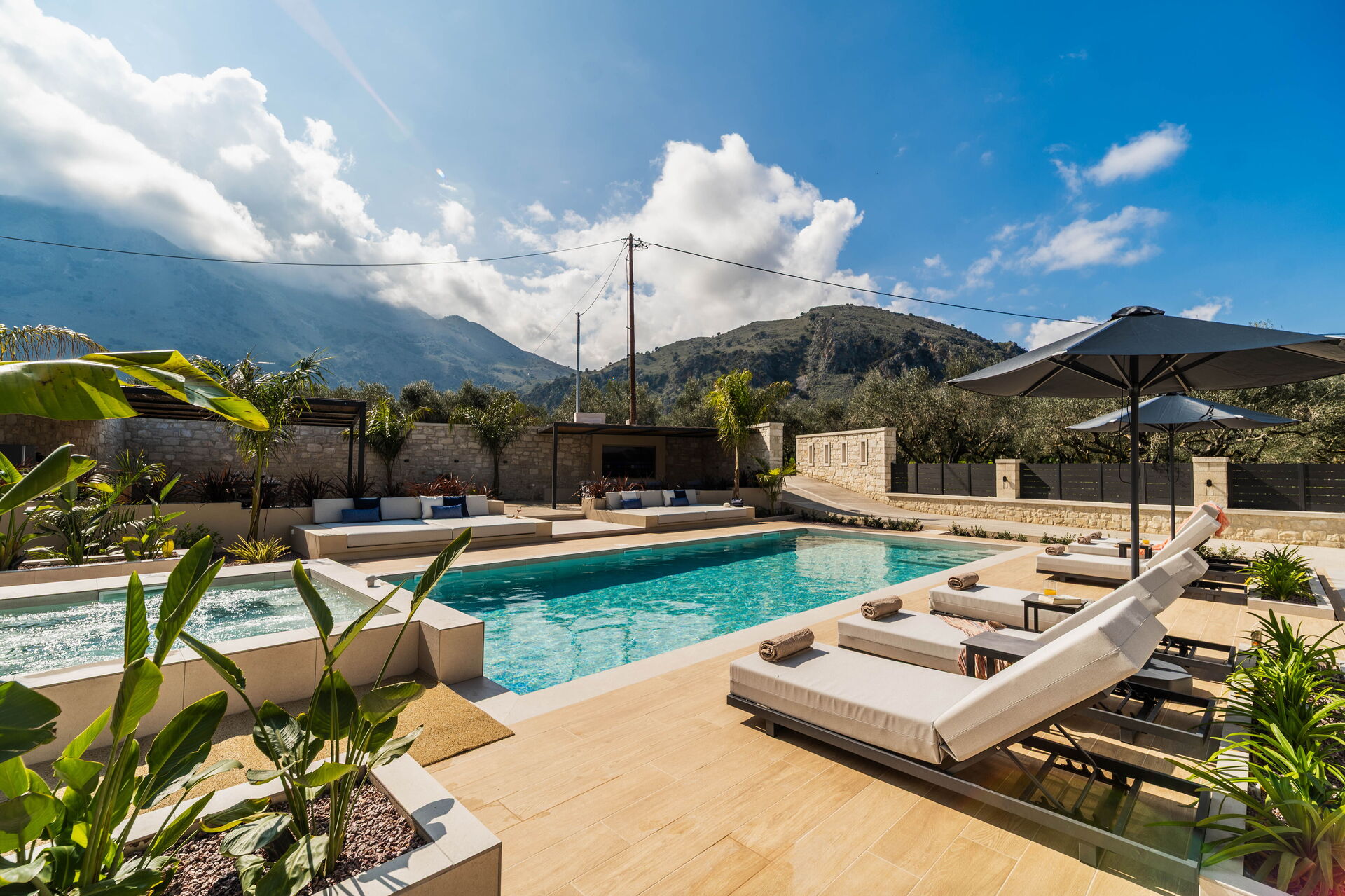 On the grounds, Villa Serenity offers a garden with an outdoor dining area, a hot tub with a waterfall, and a brand new private pool. The pool of this beautiful vacation villa in Crete is the perfect place to cool off and relax on sunny summer days. The views of the surrounding landscape extend to the sea, and the fantastic sunsets will be unforgettable moments during your vacation in Greece.