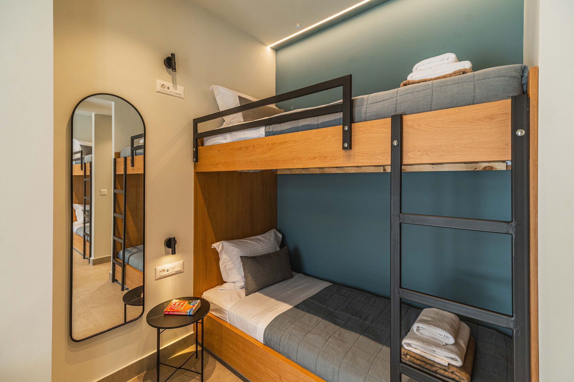 Ground floor: 2 double bedrooms (bed dimensions: 160 x 200 cm) each with a private bathroom with shower, 2 double bedrooms (bed dimensions: 180 x 200 cm; can be separated upon request) each with private bathroom with shower, bedroom with 2 bunkbeds and a private bathroom with shower.