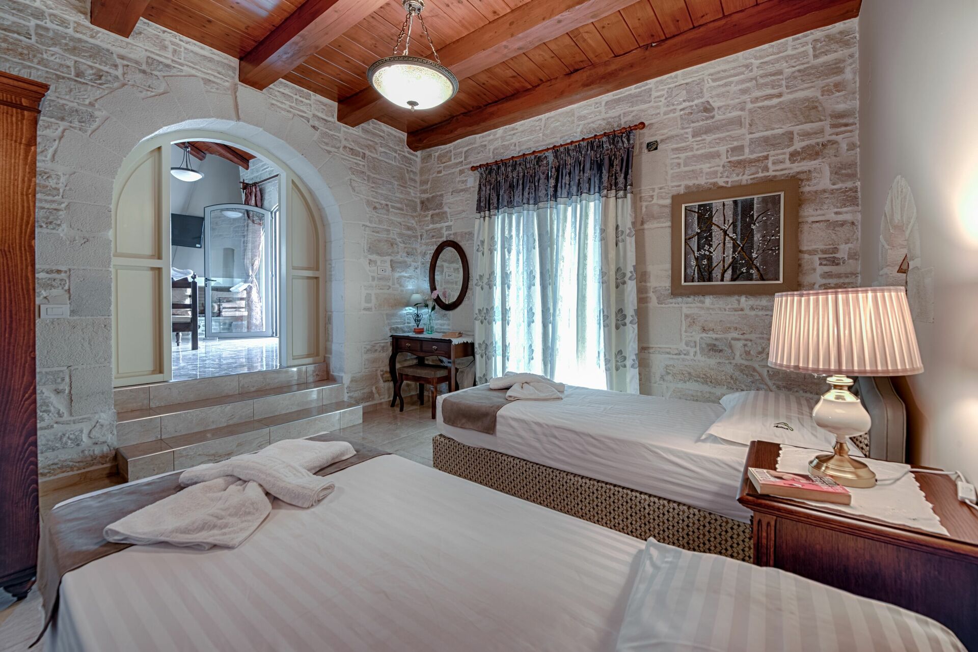 2 steps down: bedroom with 2 single beds (can be joined upon request) with access to outside veranda furnished with small table and chairs (pool side).