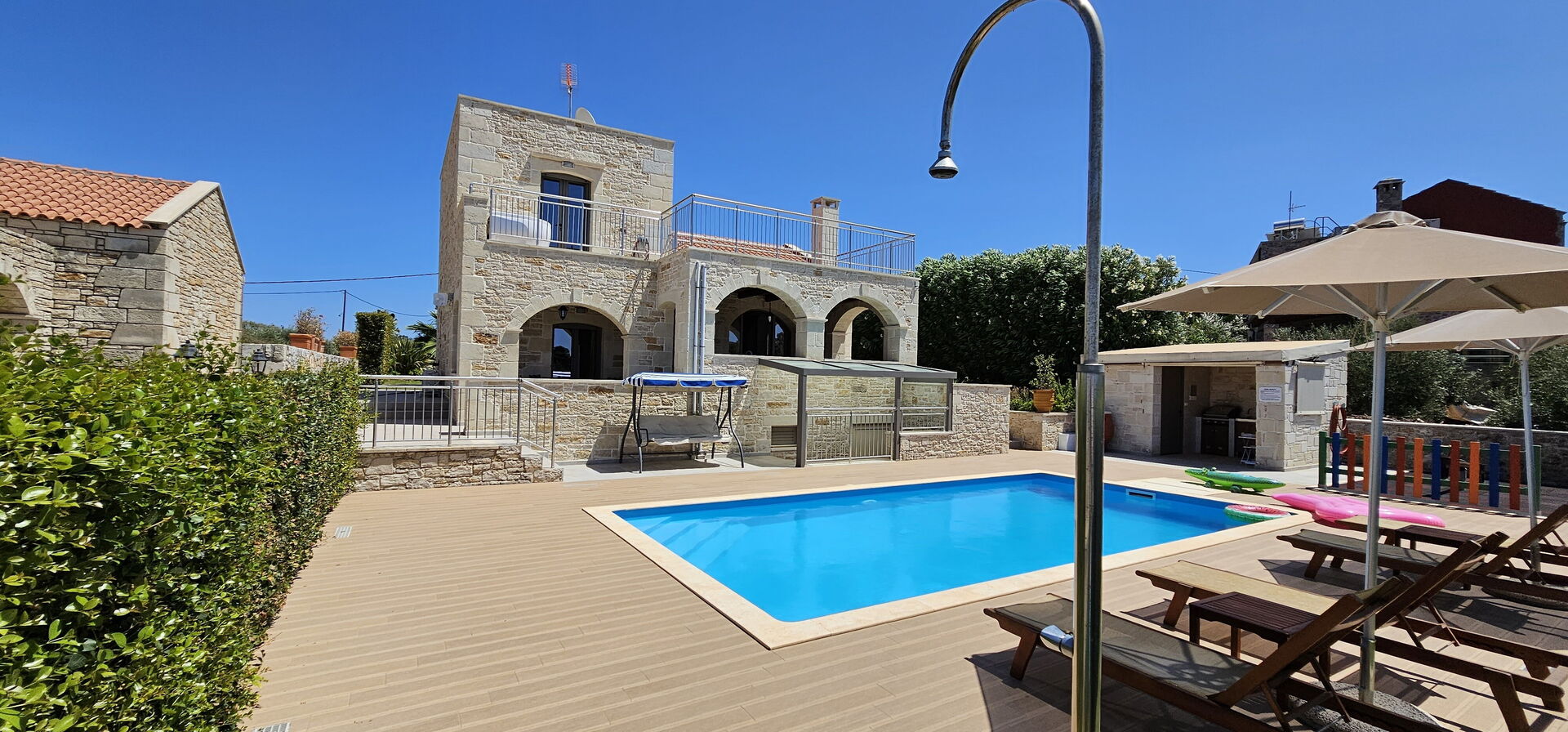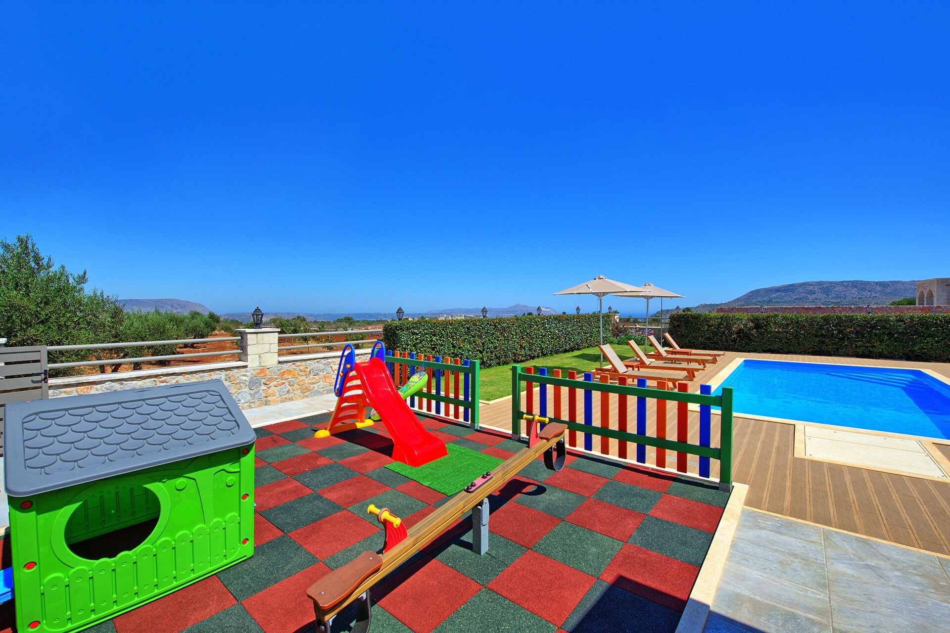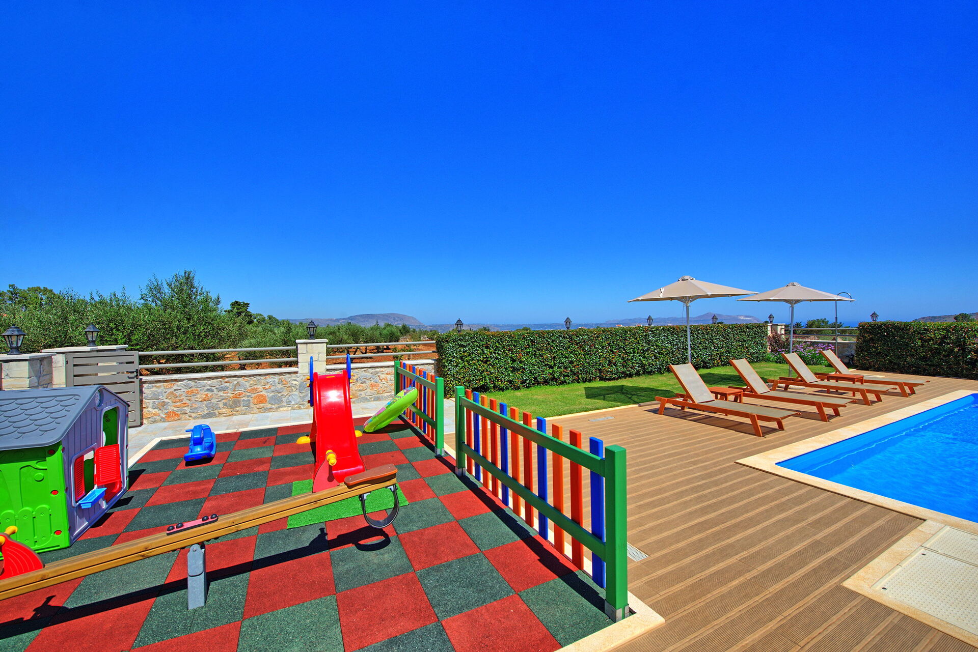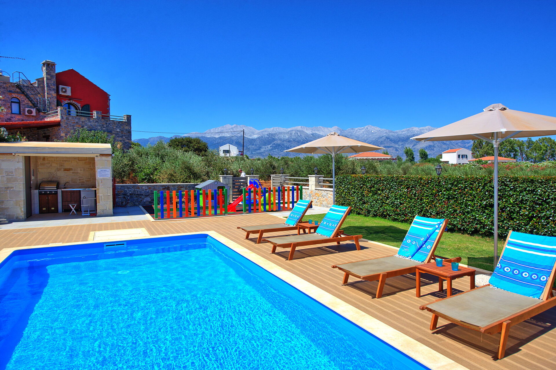 The house is new, spacious, very clean, airco is silent and works really well, beds are big and comfortable, master bedroom has an extra long bed so very comfortable for taller people like me. Outside you will find beautiful gardens all around the house which are full of beautiful plans and flowers. The swimming is fantastic, it's very big and the area around is very spacious, there is also a play area for the little ones. There is a covered outside kitchen with a BBQ which we didn't use to avoid fire risks, attached there is also another WC so you don't have to enter the house every time. The villa has beautiful views although there are still a few villas under construction in front but that didn't bother us at all. On the property you will find lots of olive trees and dozens of different fruit trees, they are all maintained by the owner Tony, ask him for a little tour and he will be happy to show you around. The villa is located just outside a small village, there is a restaurant/pizzeria just a 6 minutes walk, they don't have a big menu but all they make is fresh and delicious and at a very good price. Otherwise a 5 minute drive to Vamos and you will find several more restaurants, minimarket and bars. There are many beaches nearby, the 2 closest ones are both about 15-20 min drive, one is in Almirida, this one is smaller and can get a bit crowded. The other one is towards Georgioupoli, here you will find a small beach in the town, this one is very crowded, but if you drive a bit further you will find a huge beach (Peristeras Beach) with plenty of space, beautiful water and many bars and restaurants. We advise a place called Giorgiali, they have free sunbeds (just consumption), shower, toilet and a nice restaurant, we often spent the morning in the villa and the afternoon at the beach ending at the restaurant Giorgiali (beach dinner with a wonderful sunset). Other place to visit is Chania, very beautiful harbour, ask Tony and Debbie for directions. We totally recommend this property and will definitely come back!