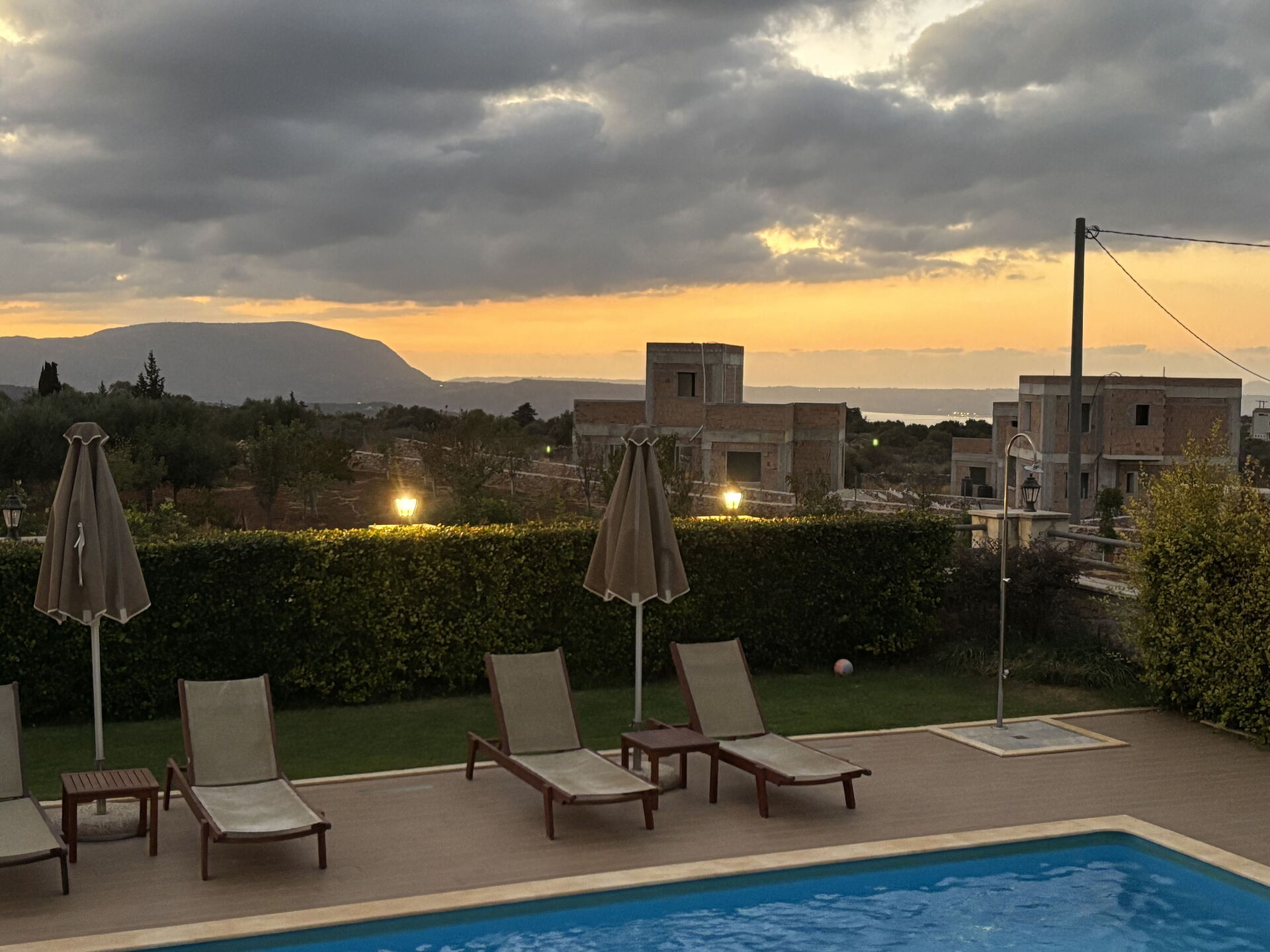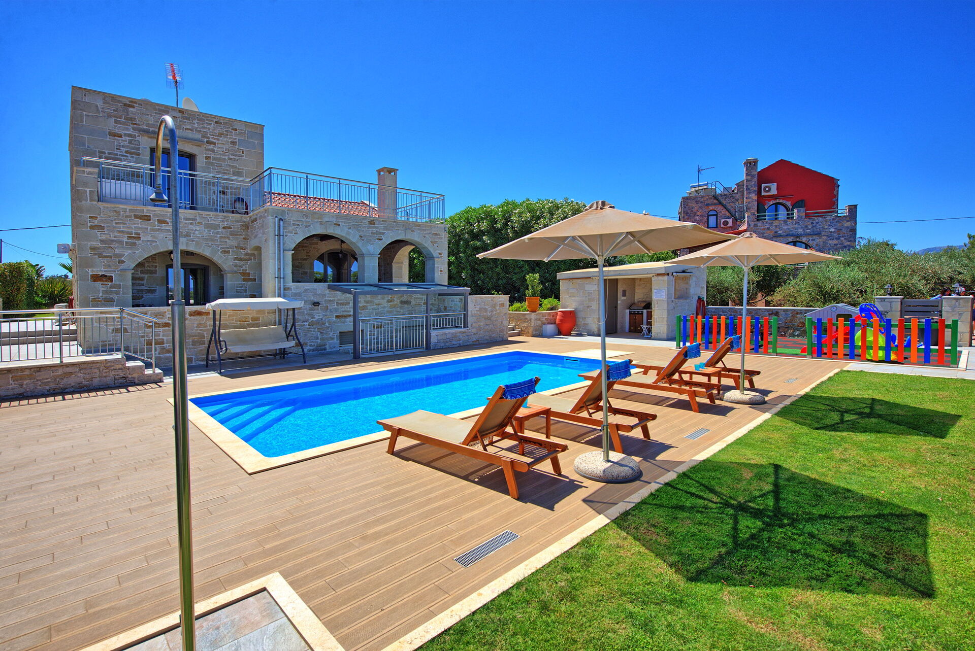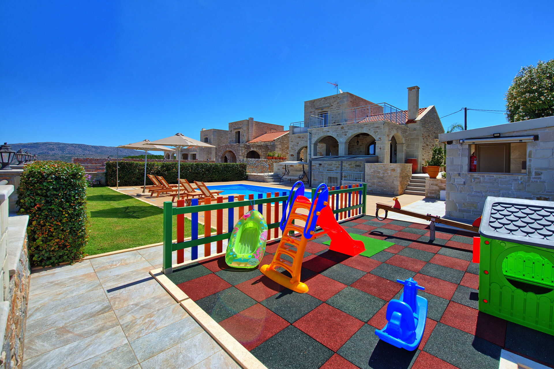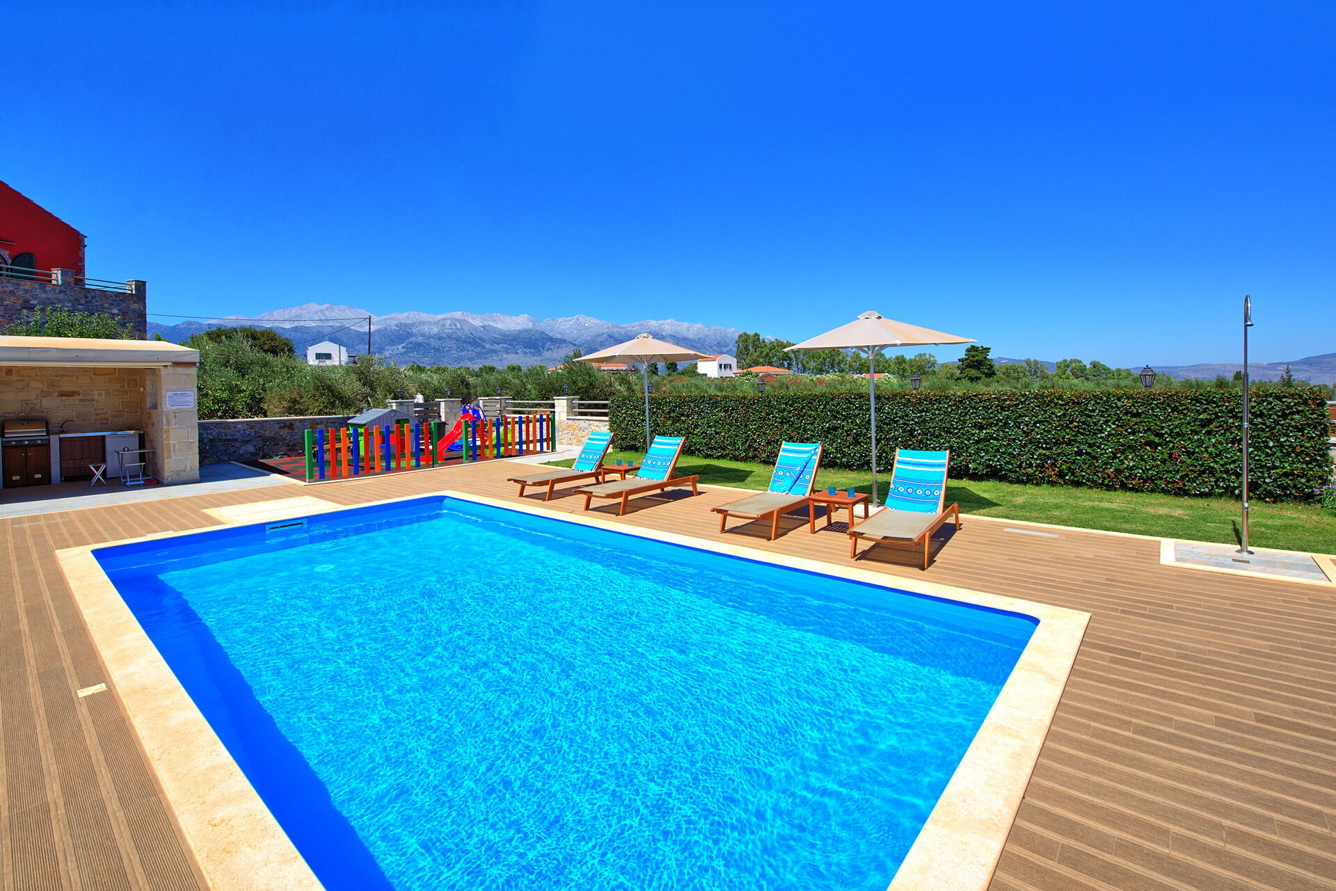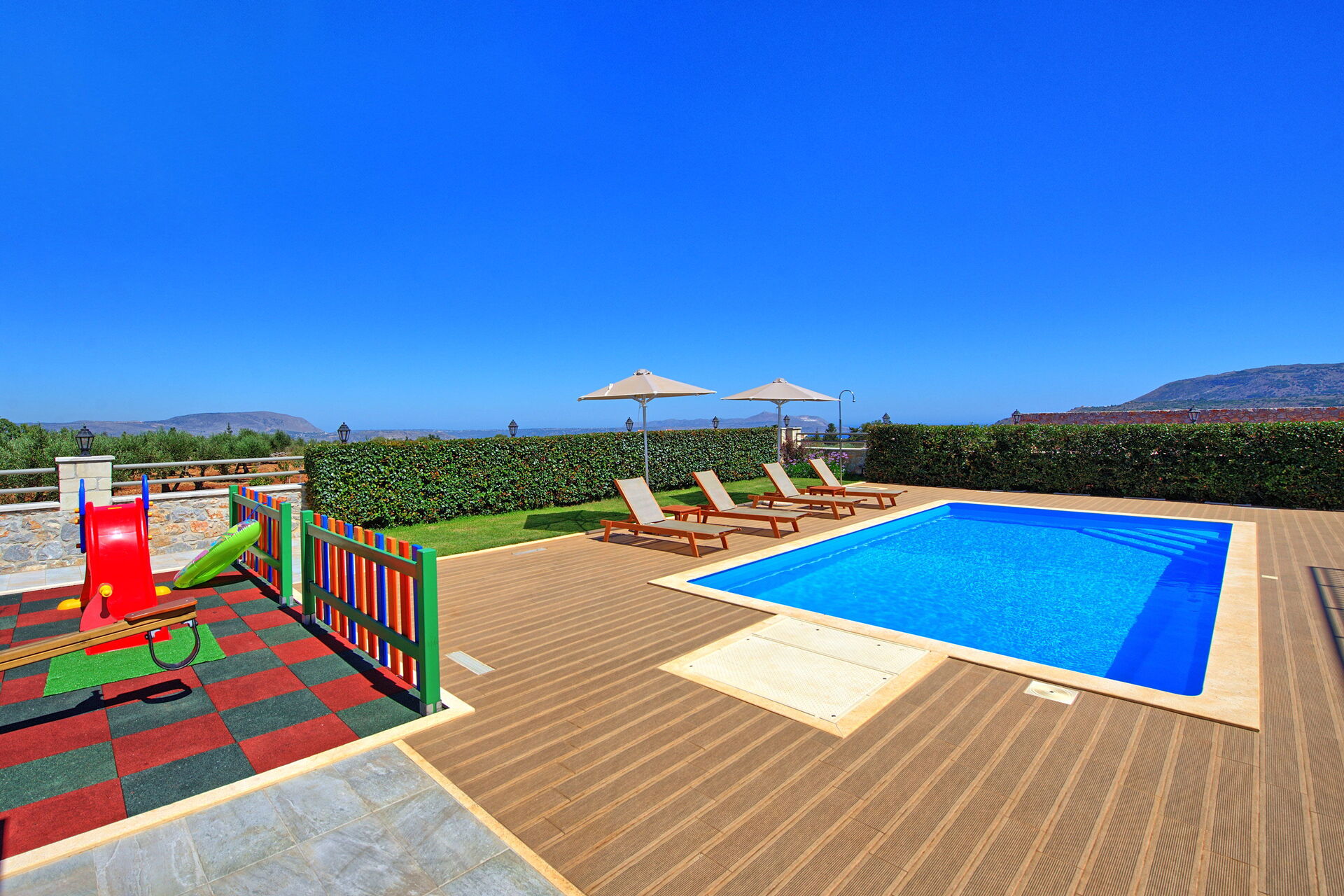The house is new, spacious, very clean, airco is silent and works really well, beds are big and comfortable, master bedroom has an extra long bed so very comfortable for taller people like me. Outside you will find beautiful gardens all around the house which are full of beautiful plans and flowers. The swimming is fantastic, it's very big and the area around is very spacious, there is also a play area for the little ones. There is a covered outside kitchen with a BBQ which we didn't use to avoid fire risks, attached there is also another WC so you don't have to enter the house every time. The villa has beautiful views although there are still a few villas under construction in front but that didn't bother us at all. On the property you will find lots of olive trees and dozens of different fruit trees, they are all maintained by the owner Tony, ask him for a little tour and he will be happy to show you around. The villa is located just outside a small village, there is a restaurant/pizzeria just a 6 minutes walk, they don't have a big menu but all they make is fresh and delicious and at a very good price. Otherwise a 5 minute drive to Vamos and you will find several more restaurants, minimarket and bars. There are many beaches nearby, the 2 closest ones are both about 15-20 min drive, one is in Almirida, this one is smaller and can get a bit crowded. The other one is towards Georgioupoli, here you will find a small beach in the town, this one is very crowded, but if you drive a bit further you will find a huge beach (Peristeras Beach) with plenty of space, beautiful water and many bars and restaurants. We advise a place called Giorgiali, they have free sunbeds (just consumption), shower, toilet and a nice restaurant, we often spent the morning in the villa and the afternoon at the beach ending at the restaurant Giorgiali (beach dinner with a wonderful sunset). Other place to visit is Chania, very beautiful harbour, ask Tony and Debbie for directions. We totally recommend this property and will definitely come back!