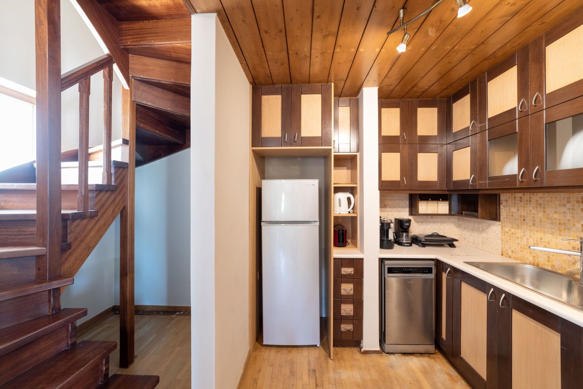 Ground Floor living room (Tv, Dvd) with fireplace and kitchen corner ( oven, dishwasher, Espresso coffee maker), bathroom with shower.