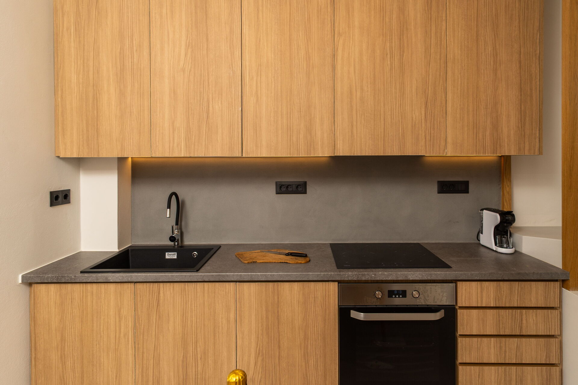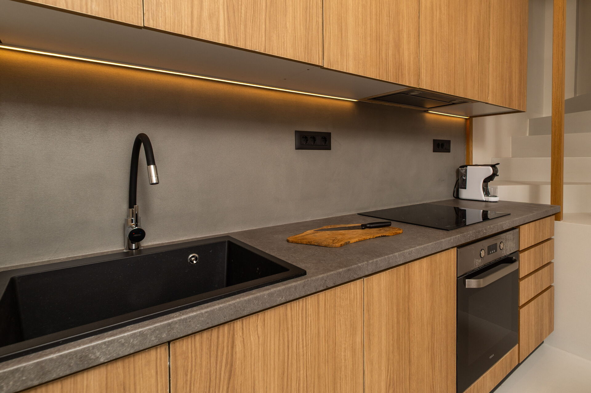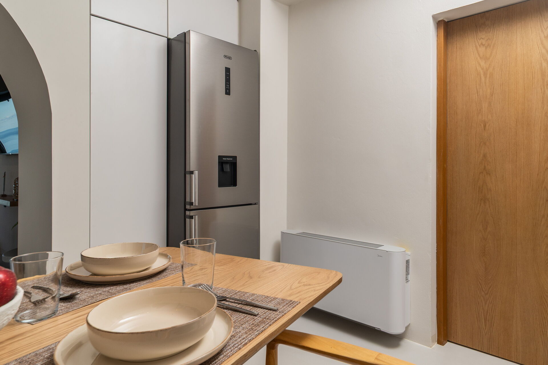 Ground floor: living room with single sofa bed and dining area with kitchen corner (refrigerator, dishwasher, oven, electric burners, espresso coffee maker), bathroom with shower.
