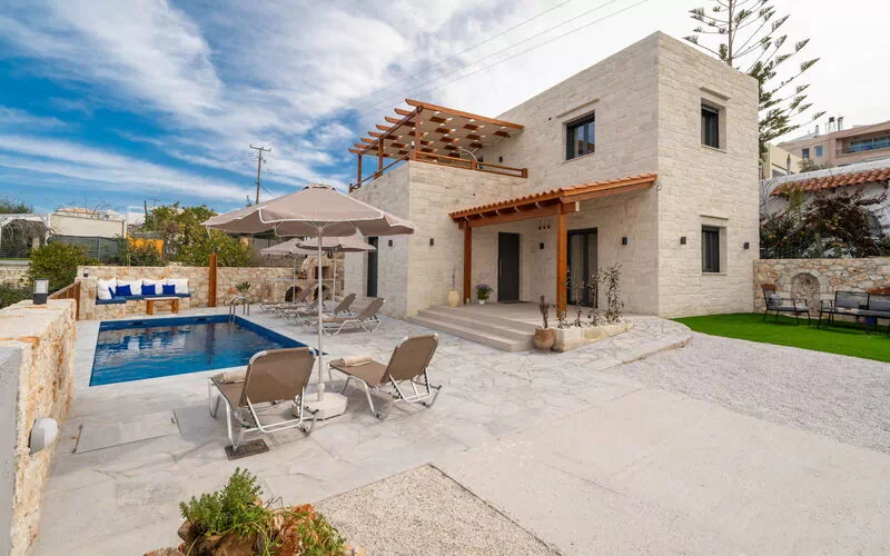 The true strength of Villa Blini is its exceptional logistics. Just 350 metres from the entrance gate lies the heart of Plaka: you can forget the car and walk to typical tavernas, bars, and small craft shops. For sea lovers, the renowned Almyrida beach is only 2 km away, making this villa the ideal base for those seeking convenience without sacrificing privacy. The outdoor space is a true oasis of well-being: the private pool is surrounded by a fully equipped solarium, ideal for cooling off on hot Cretan days or enjoying an aperitif at sunset.Bright Interiors and Latest-Generation Comfort