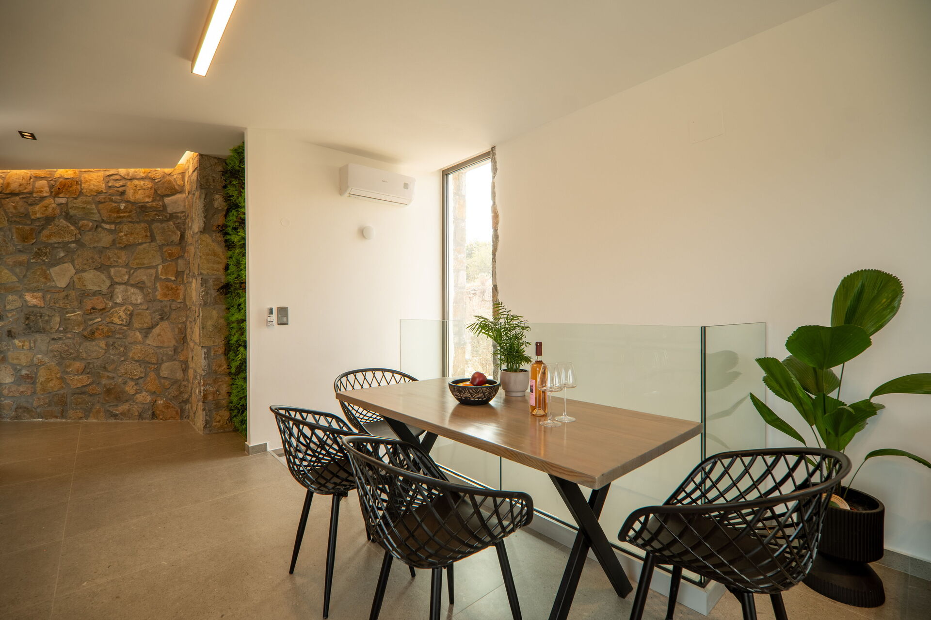 Outside there are a private pool with panoramic views, a hot tub, and a lovely outdoor dining area. The interiors are modern and very comfortable.