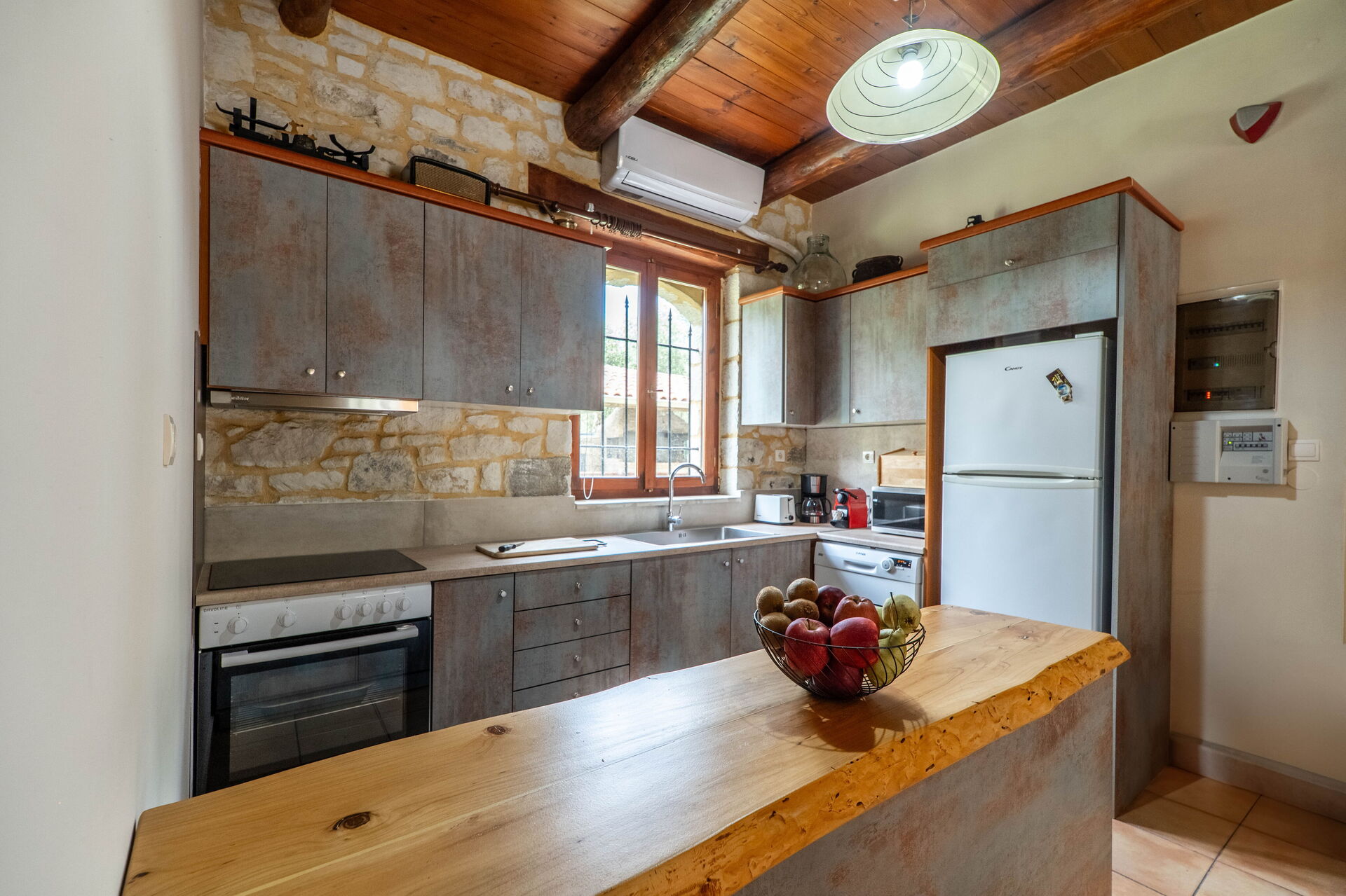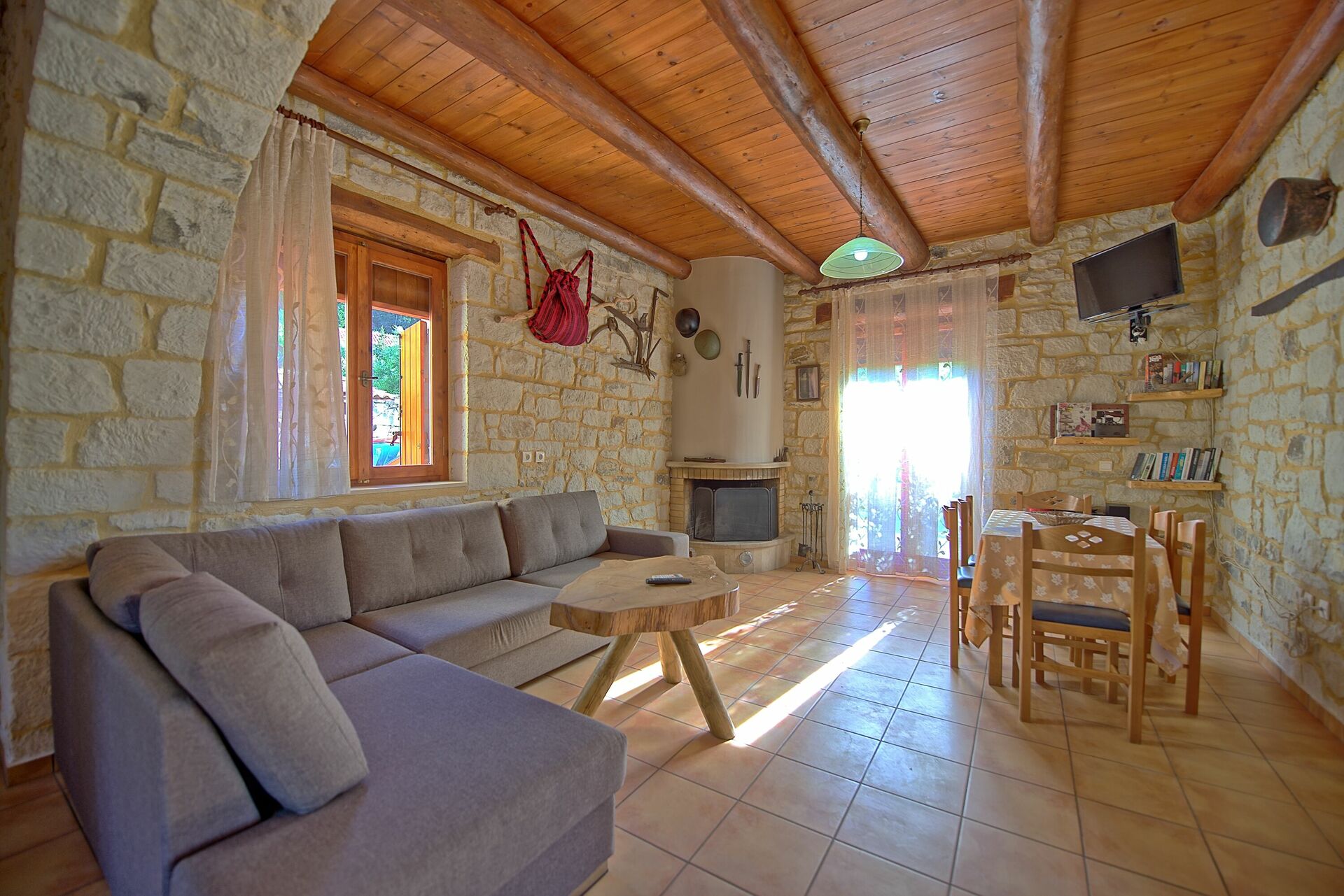 Inside, the villa rental is set over 2 floors. The interiors are fully air-conditioned (included in the rental price), and finished with taste and style making wide use of local stone and traditional Cretan elements. On the ground floor there is a large lounge with adjoining kitchen and dining area. The lounge is equipped with comfortable sofas (as well as a sofa bed for the 7th guest), TV, direct access to the veranda. The well equipped kitchen (4 cooking, fridge/freezer, oven, washing machine) opens straight to the lounge area where a table for 6/7 guests is located. On the ground floor there is also a spacious twin bedroom opening straight onto the garden. A family bathroom with shower is also located on this floor. On the upper floor there are 2 further airy bedrooms and a family bathroom with baththb. The bedrooms are respectively a double and a twin and have access to a lovely furnished terrace providing relaxing views over the countryside.