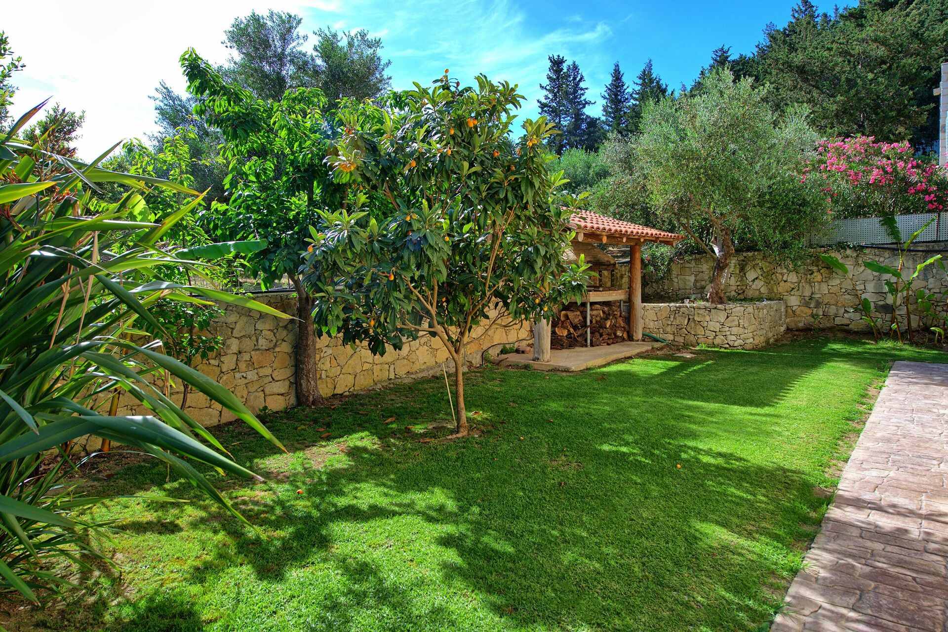 Outside, Villa Vrisses is surrounded by well kept gardens with lawn, mediterranean shrubs and flowers. A true oasis for relaxing hours listening to the sound of the cicadas! The private swimming pool (with children section) measures 6m x 4.5m and the depth is between 0.4m and 1.5m. Comfortable sunbeds and parasols are provided for the guests to enjoy. A terrace at the entrance of the villa also offers excellent opportunities for outdoor dining (together with a brick built barbecue for excellent charcoal grilled meals).