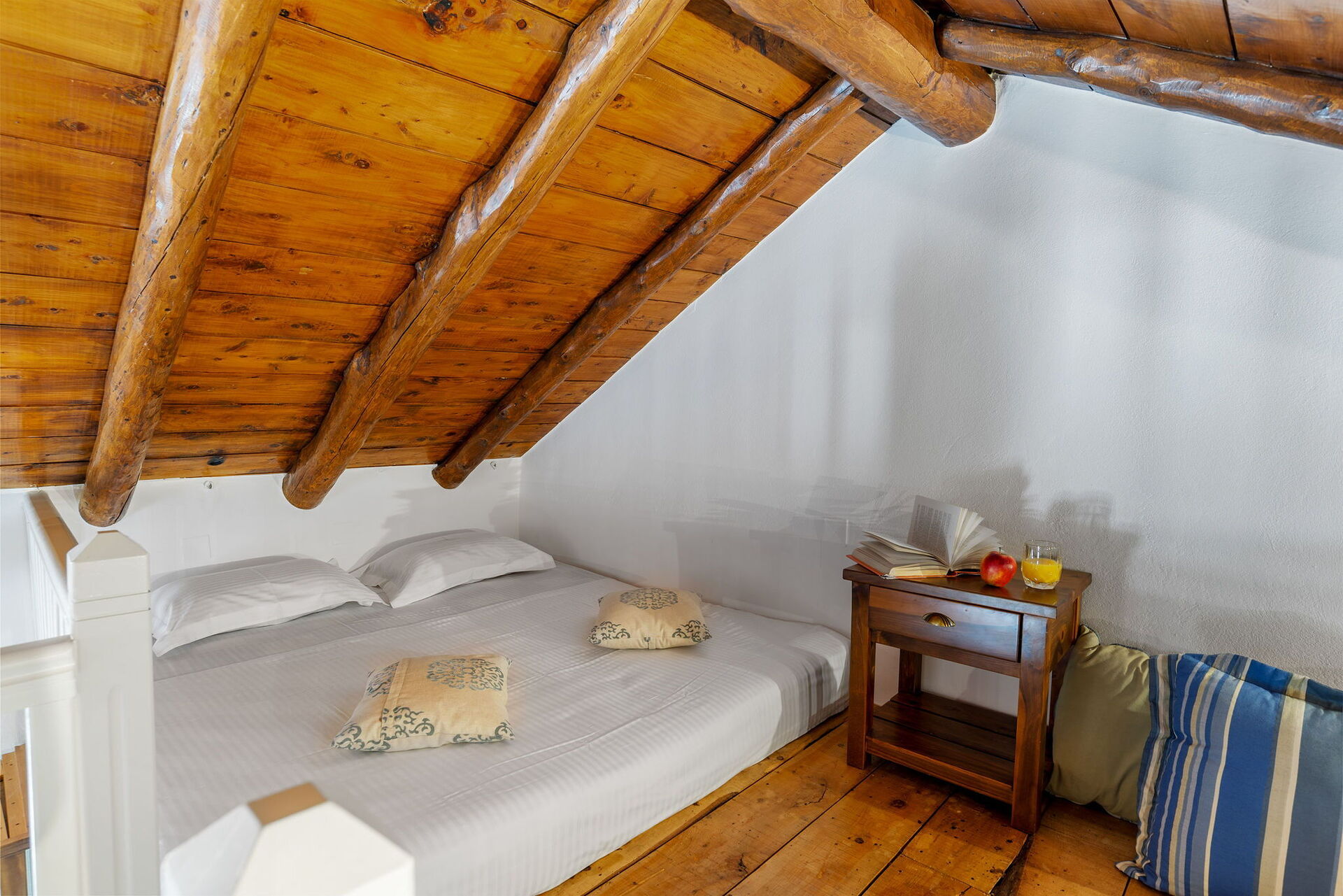 First floor: vestibule with outdoor access to terrace, bedroom in the loft with double bed (minimum height: 0,65 meters; maximum height: 1,70 meters), bathroom with bathtub, double bedroom.