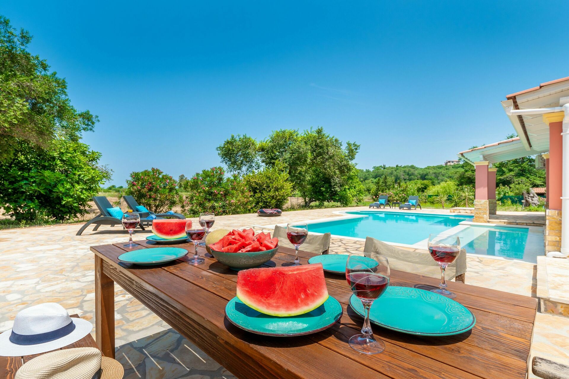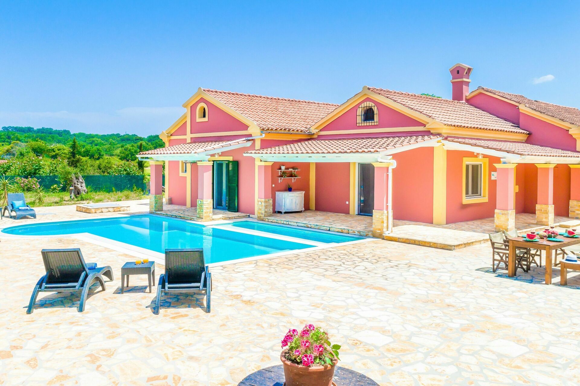 Offering one of the best designed swimming pools of the island, purposedly created and built for this villa by a well-known local architect, Beach Villa Joanna is truly set to impress. Thanks to its 3 spacious bedrooms (air-conditioned), beautifully decorated interiors, wide common areas both inside and outside, the holiday villa can comfortably sleep up to 6 / 8 guests. Blessed by extensive gardens with lawn and olive trees, this villa rental is the perfect holiday home for families looking after a relxation break in the unspoilt Corfiot nature yet within easy reach to the seaside (which is just 500m away) and the many facilities or the nearby Roda.