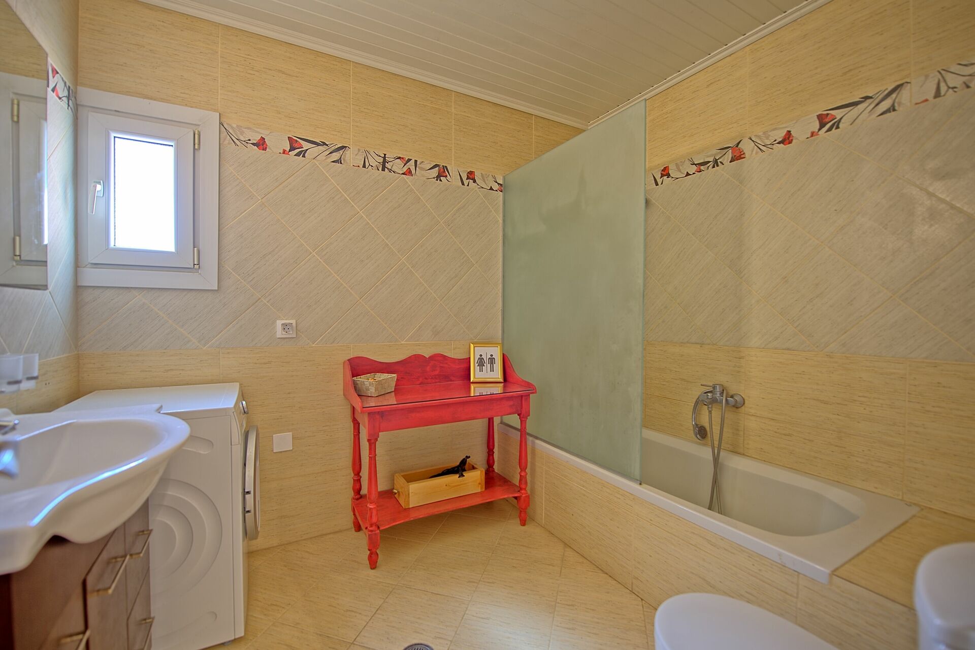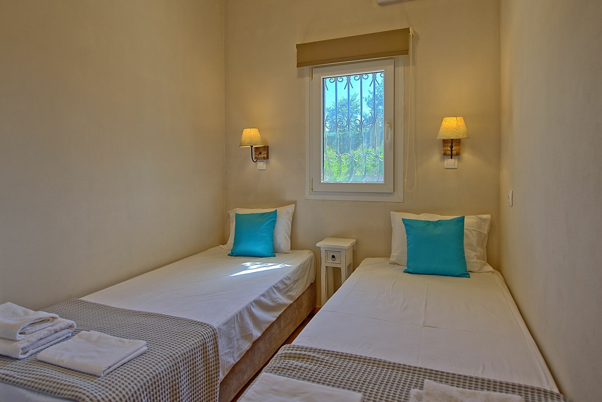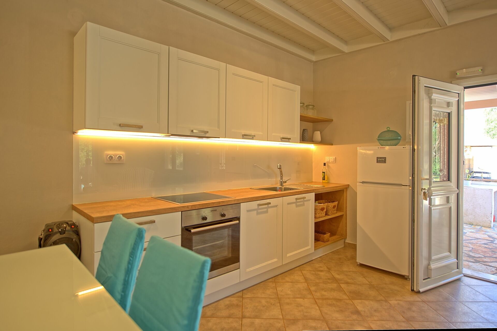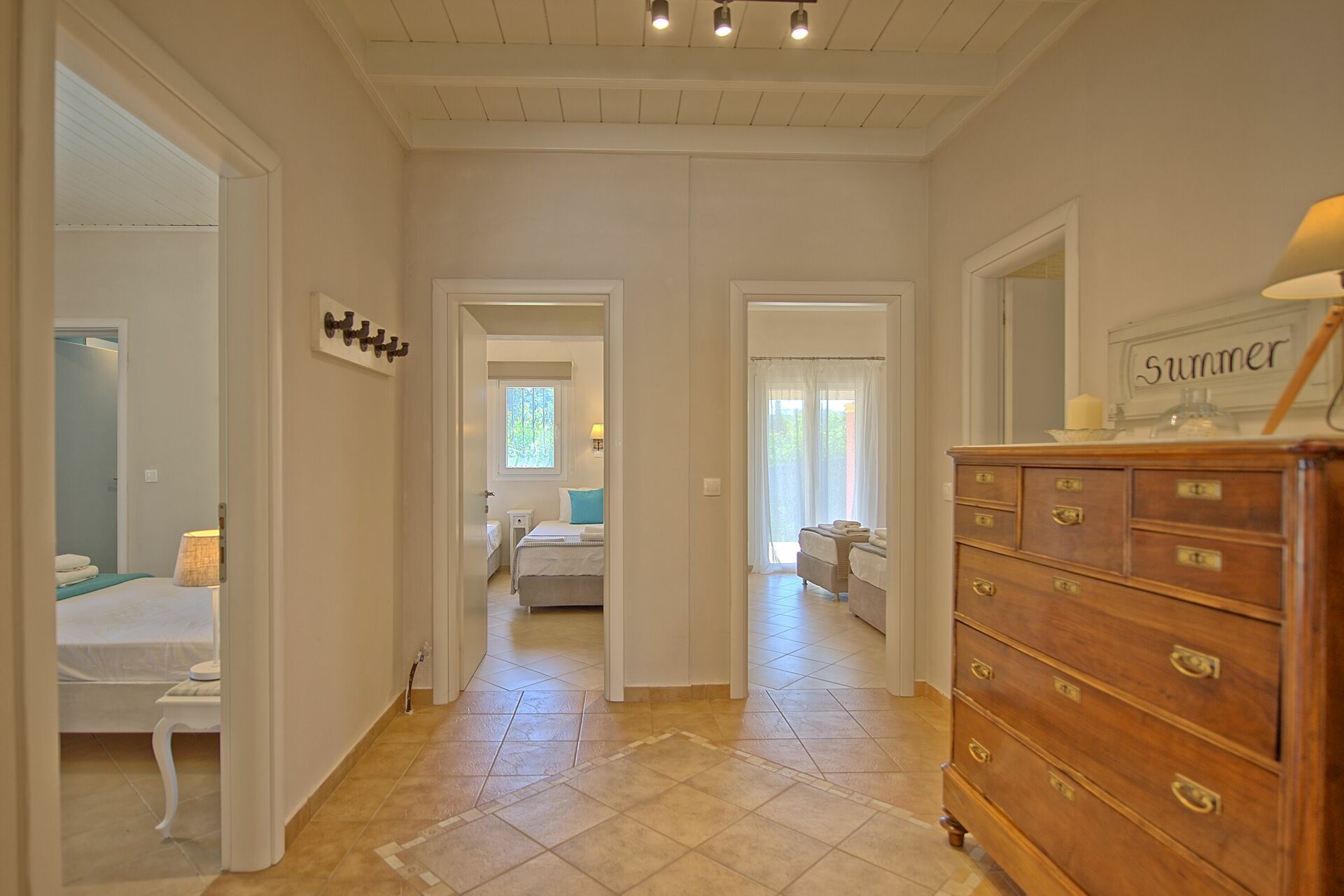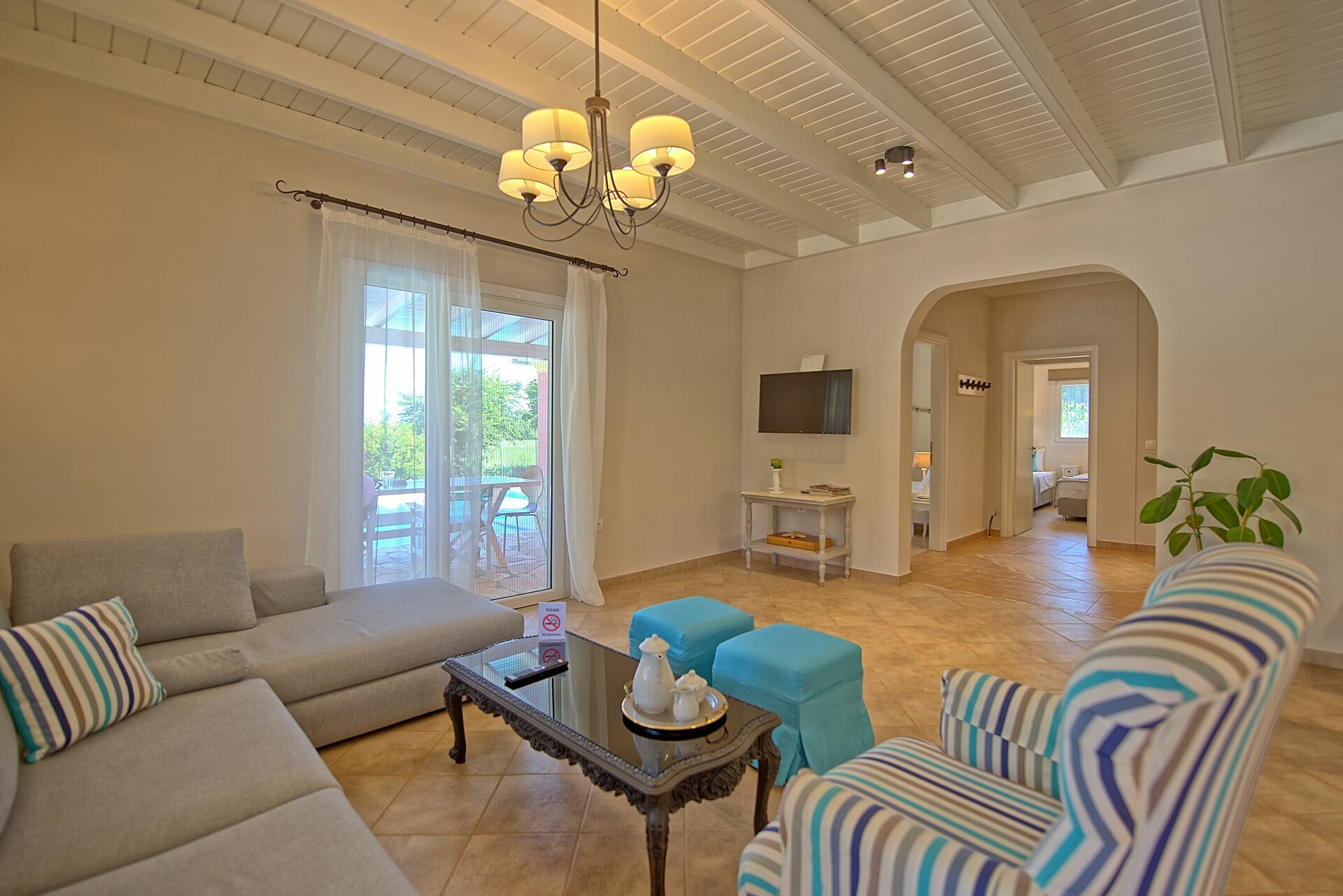 Inside, the villa for rent is set over one floor. The modern interiors have been carefully designed to offer a relaxing, cheerful feeling, with high attention to the details. The open plan lounge / kitchen offers 2 sofas (that can be turned into 2 regular size single beds), TV, wi-fi internet connection, dining table. The kitchen is stylish and fully equipped with 4 cooking rings oven, microwave, dishwasher, fridge/freezer. The living area opens straight out to the spacious outside terrace even providing direct access to the pool! There are 3 bedrooms and 2 bathrooms in total. The spacious master bedroom has its own bathroom with shower and big patio doors opening straight onto the poolside terrace. The second bedroom is a twin while the third one, particularly spacious, has 2 single beds (that can be joined on request) and an extra foldaway bed. They share family bathroom with bathtub and washing machine. The owner Joanna, during the renovation, has carefully restored antique pieces all hand made by her grandfather John who was the former owner of the villa as well as a great carpenter.