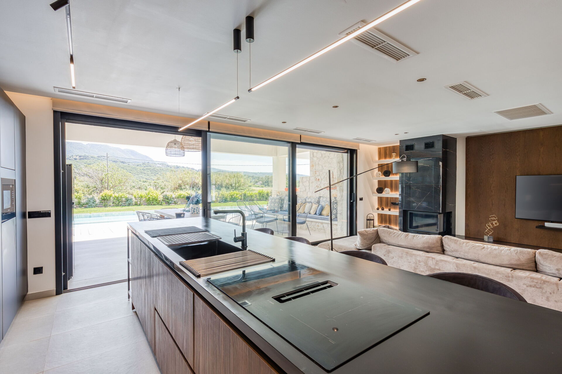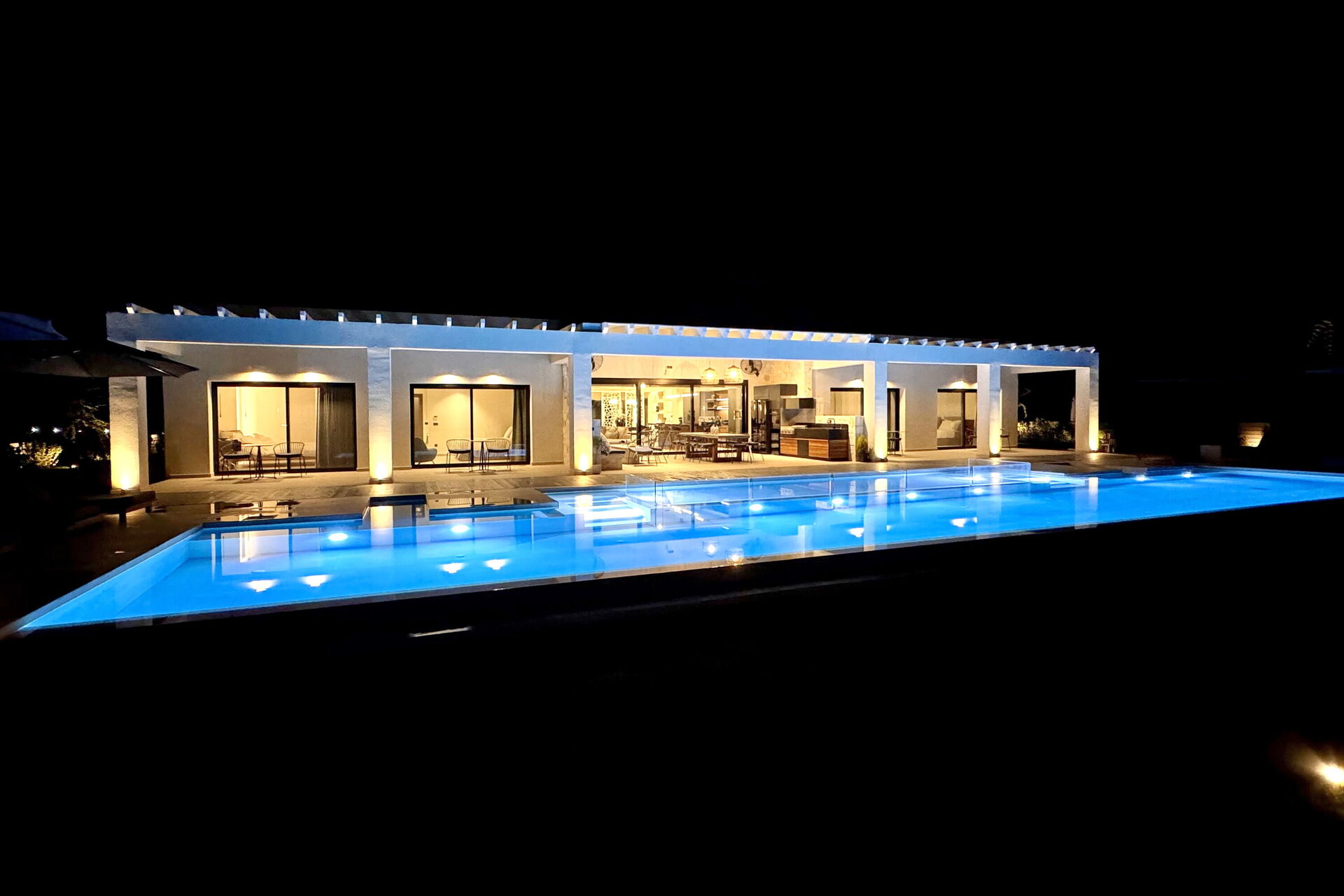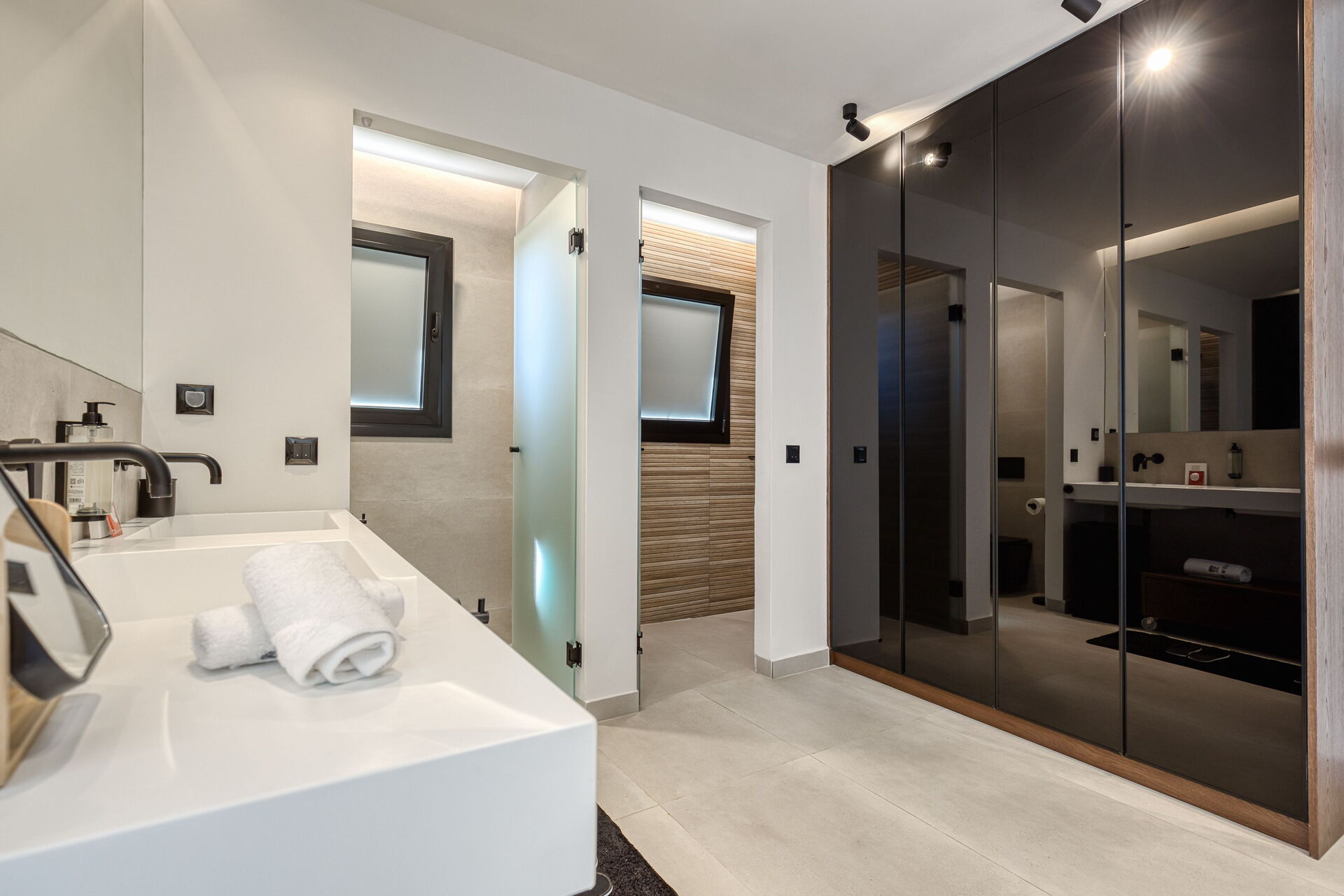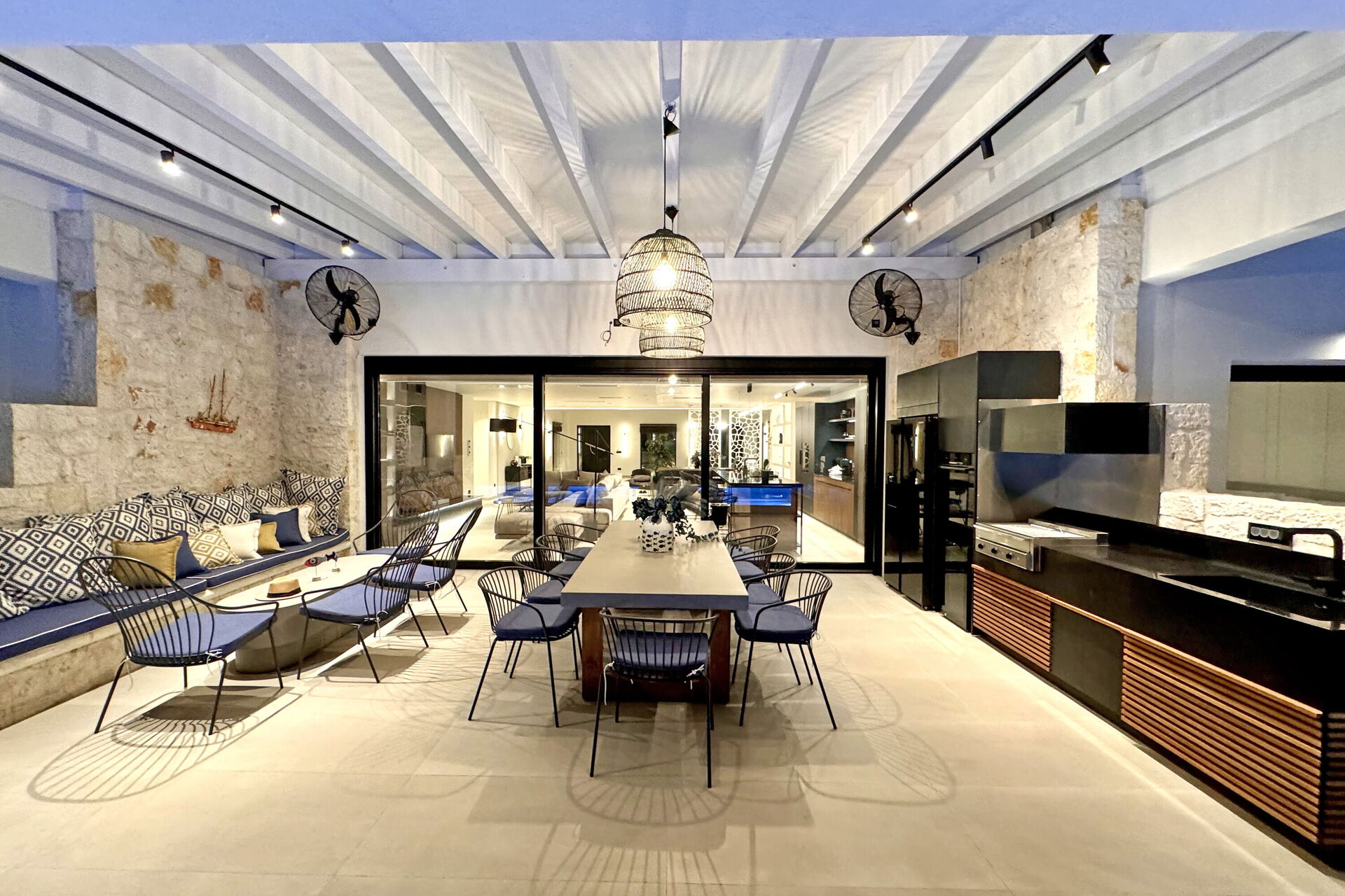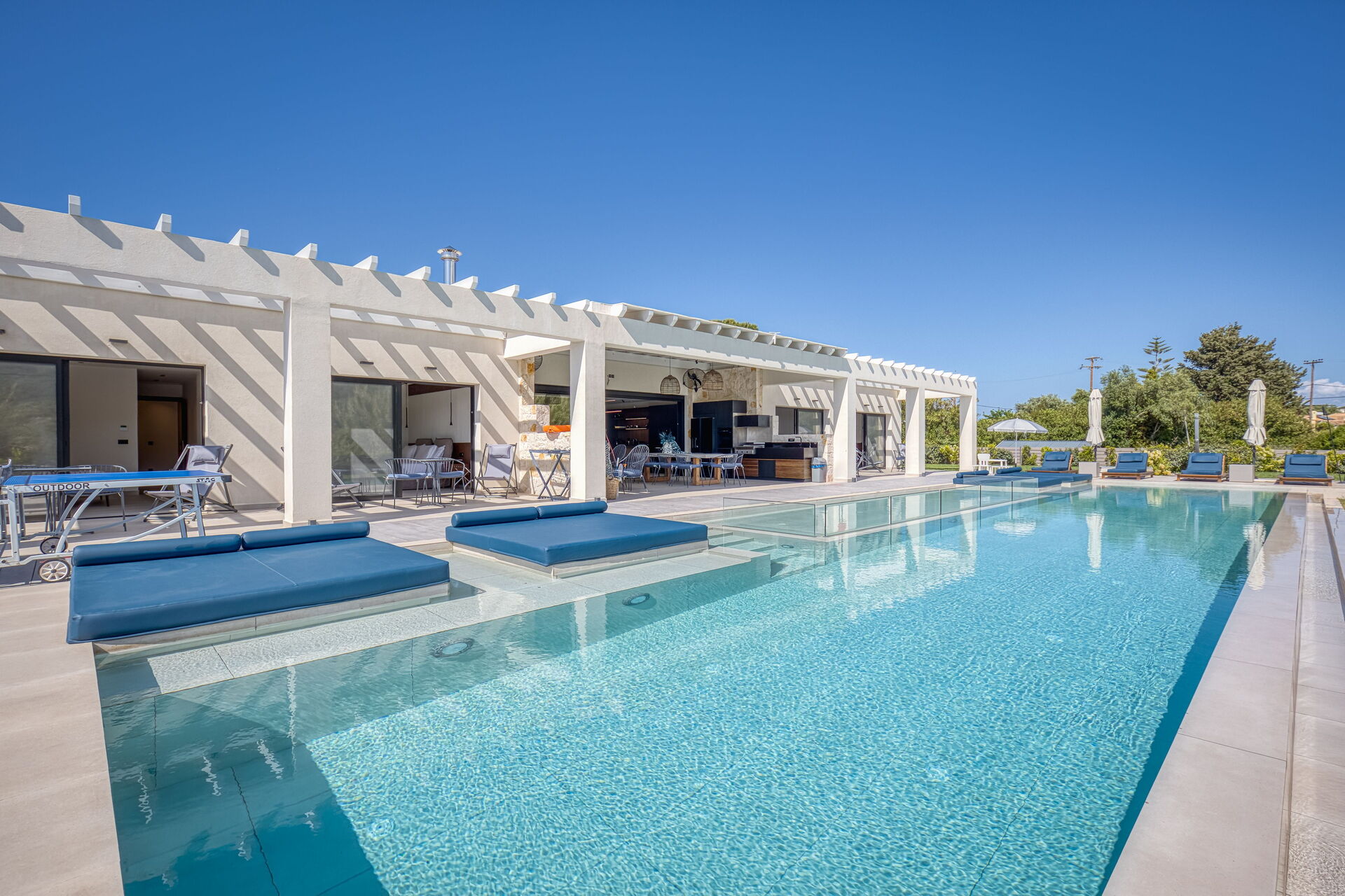 Outside, there is a well-tended enclosed garden, a fantastic pool, a play corner for children, a comfortable sun deck, and an outdoor cooking and dining area (equipped with a double refrigerator, ice machine, electric barbecue, oven and wine refrigerator) where you can enjoy Greece’s Mediterranean climate.