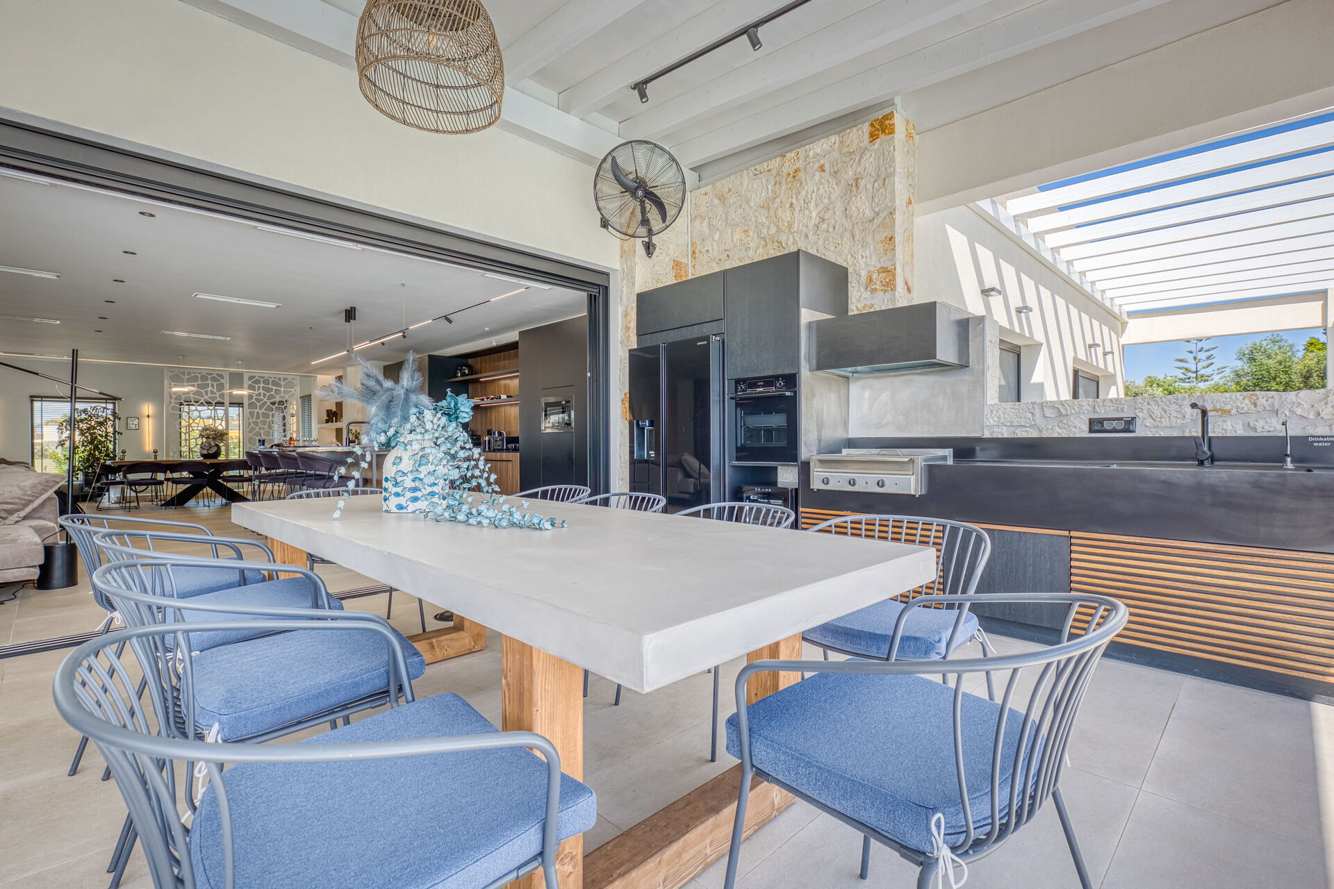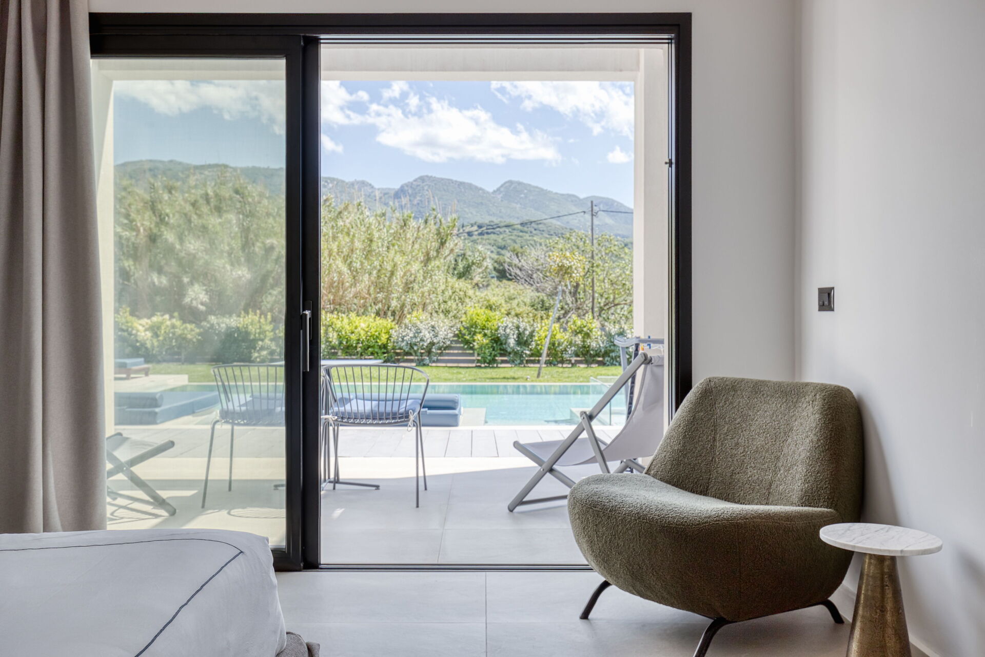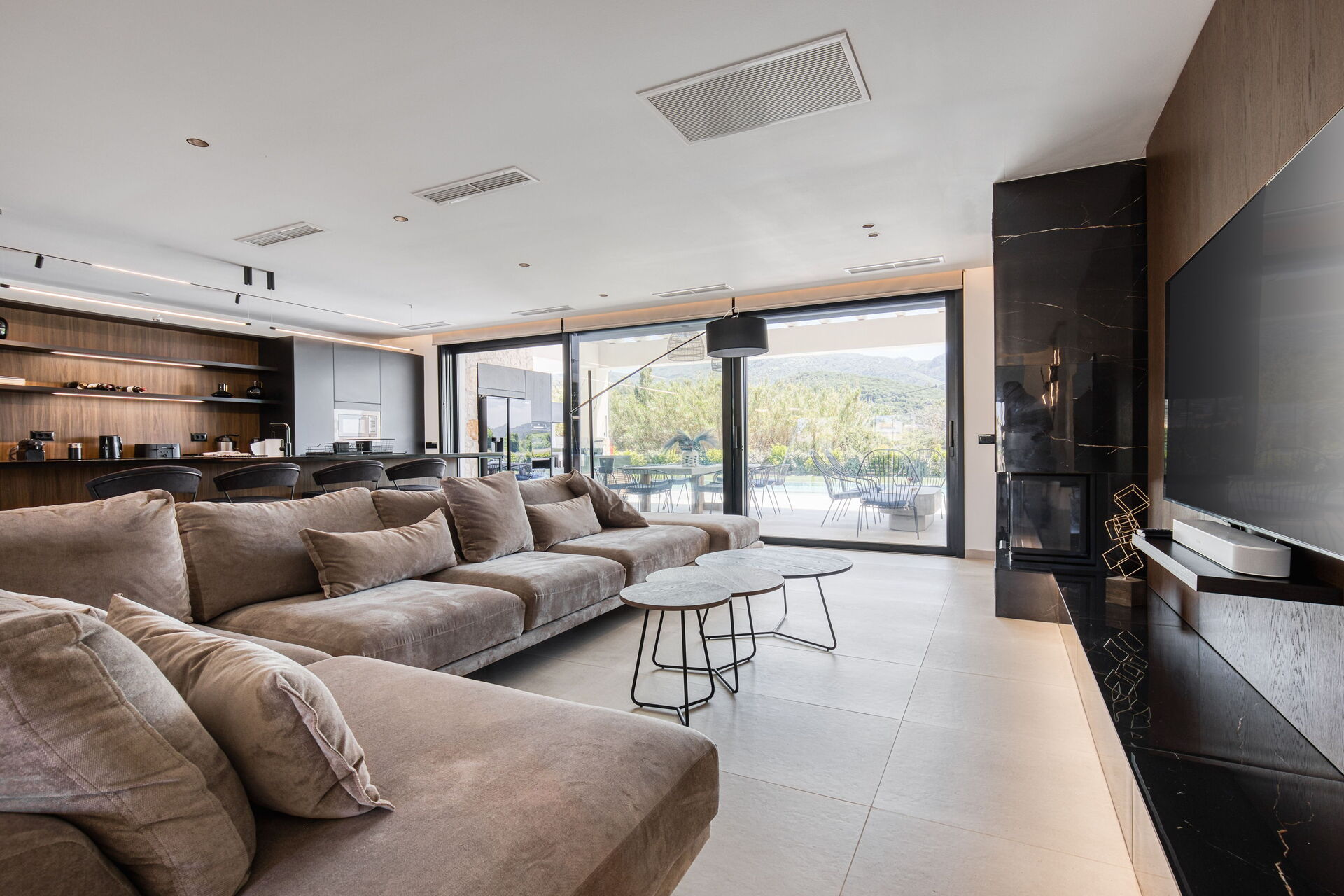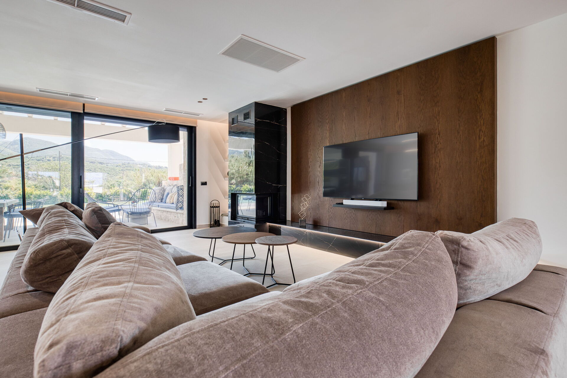 Outside, there is a well-tended enclosed garden, a fantastic pool, a play corner for children, a comfortable sun deck, and an outdoor cooking and dining area (equipped with a double refrigerator, ice machine, electric barbecue, oven and wine refrigerator) where you can enjoy Greece’s Mediterranean climate.