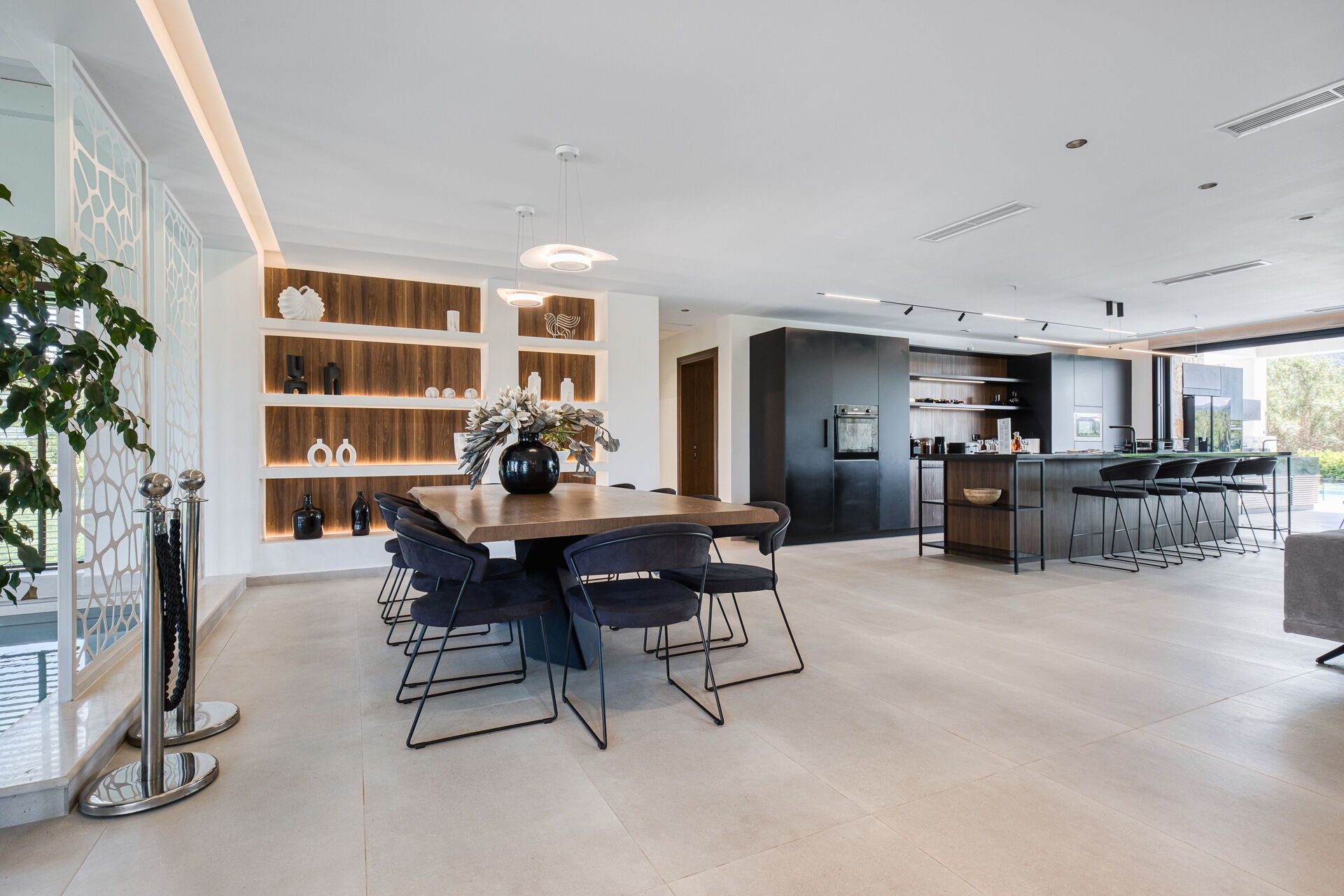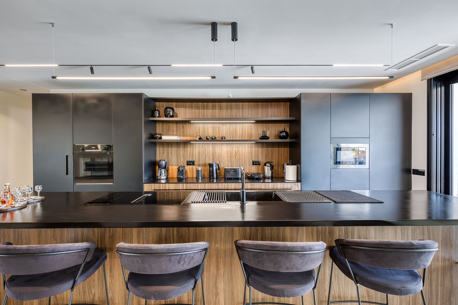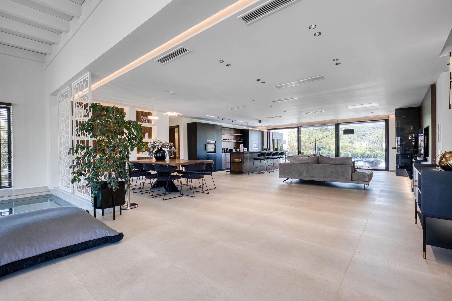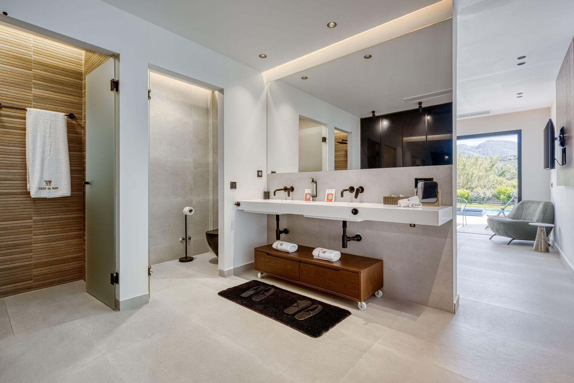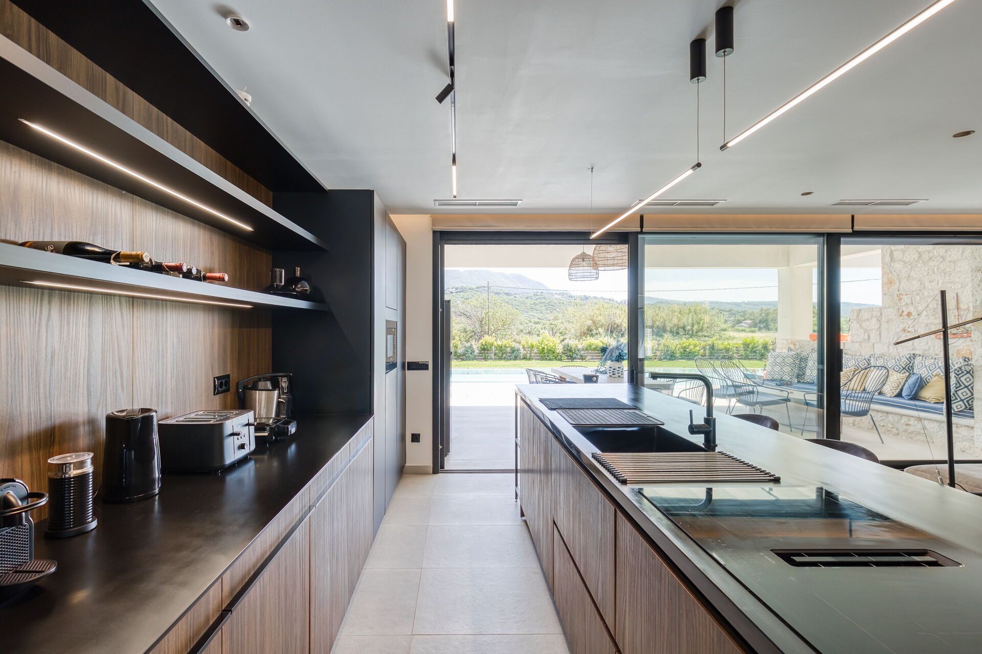 Outside, there is a well-tended enclosed garden, a fantastic pool, a play corner for children, a comfortable sun deck, and an outdoor cooking and dining area (equipped with a double refrigerator, ice machine, electric barbecue, oven and wine refrigerator) where you can enjoy Greece’s Mediterranean climate.