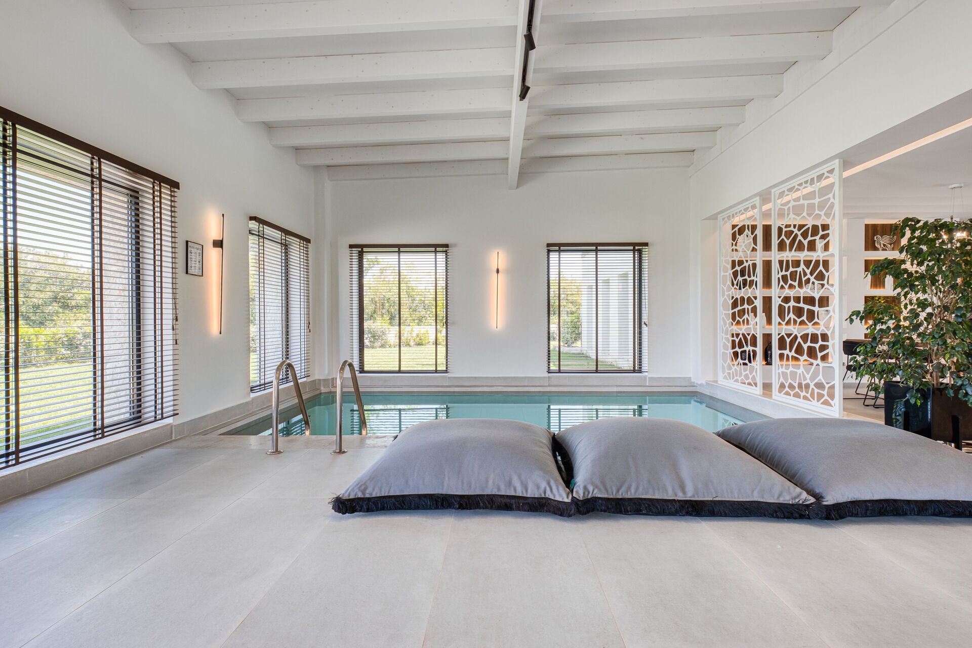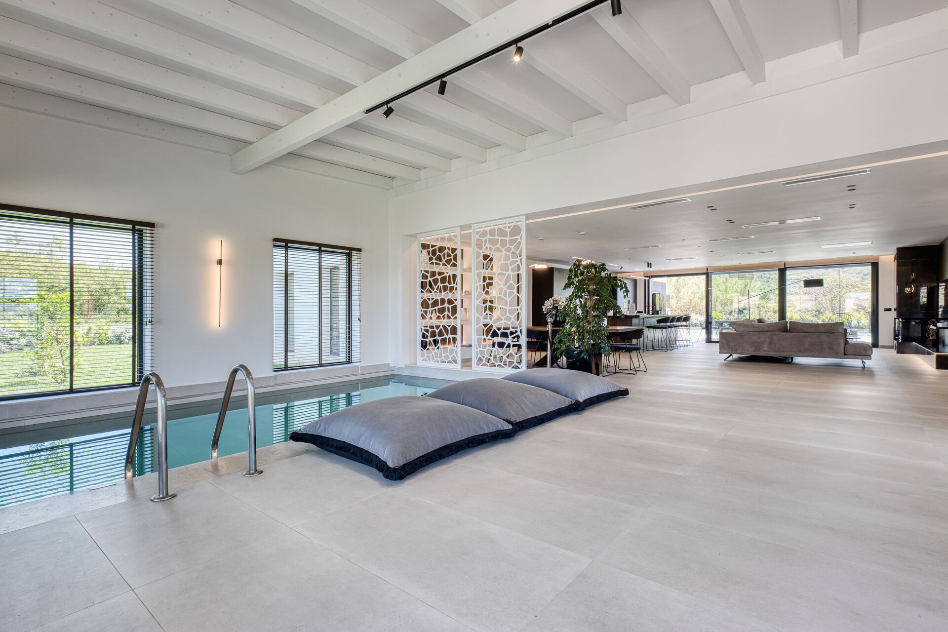 Ground floor: large, bright living area made up of living room with fireplace and smart TV, dining area and well-equipped kitchen (oven, freezer, refrigerator, dishwasher, wine refrigerator, espresso coffee maker, electric kettle, toaster), indoor pool area (5 x 3 meters, depth 1,1 meters), 4 double bedroom suites, each with a private bathroom with shower; bedroom with 2 single beds and private bathroom with shower; gym (treadmill, exercise bike, step machine, TRX straps, exercise mats and dumbbells).