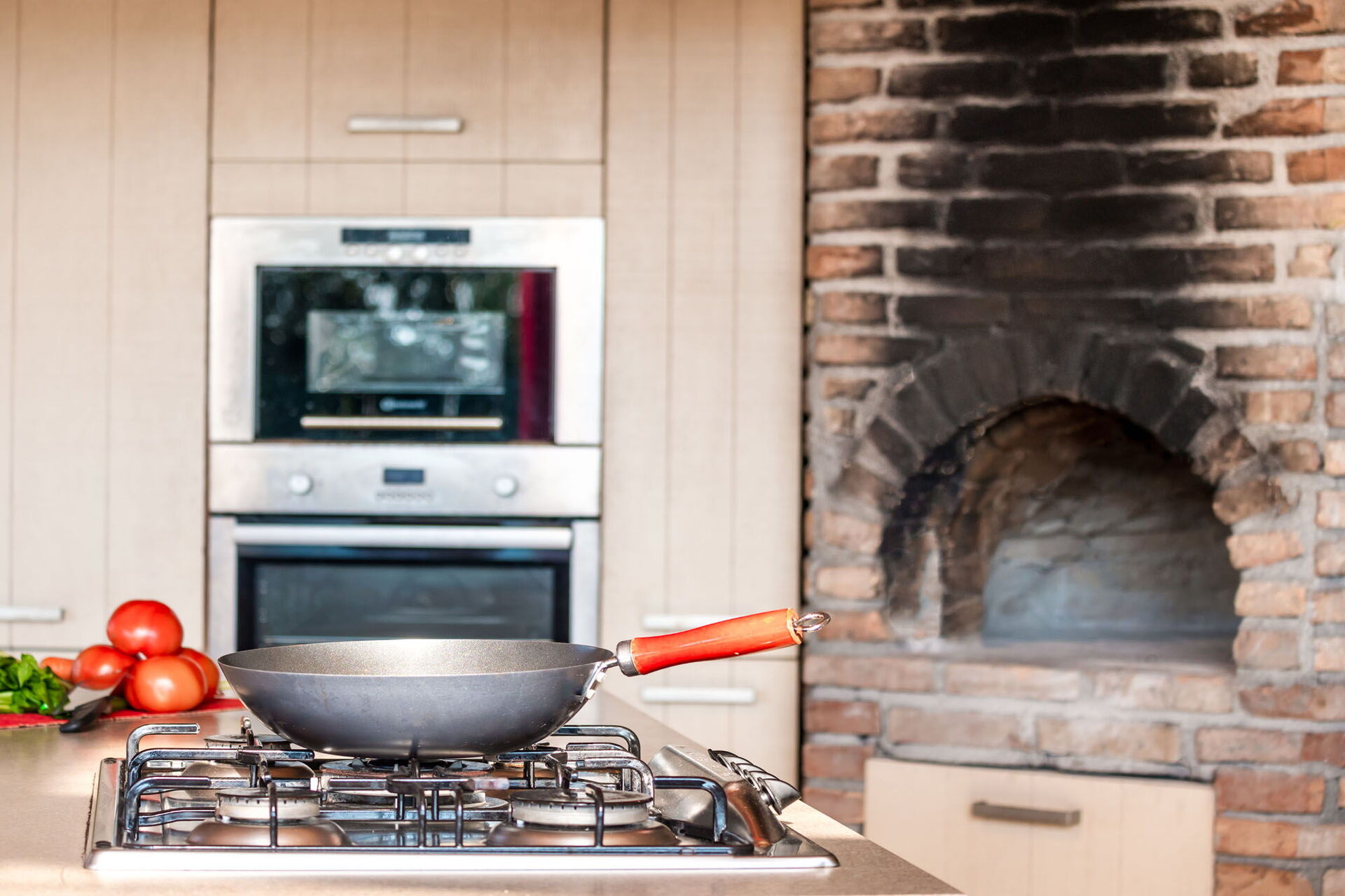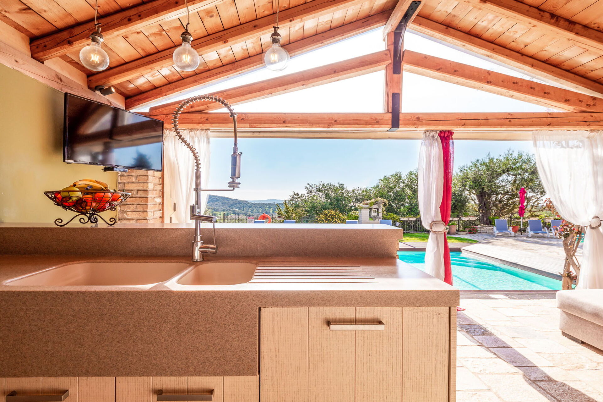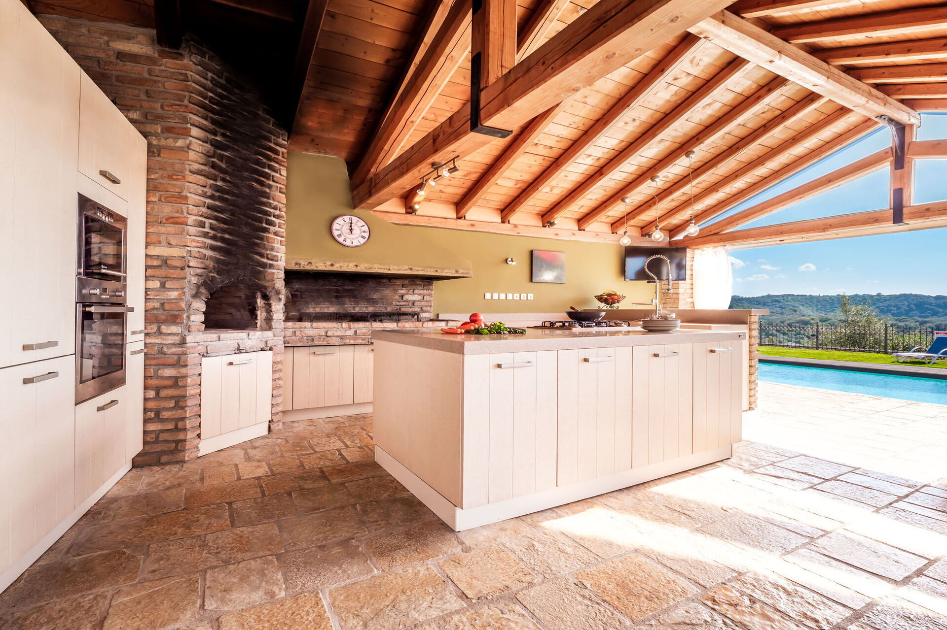 • large private exterior room equipped with kitchen, barbecue and woodburning oven