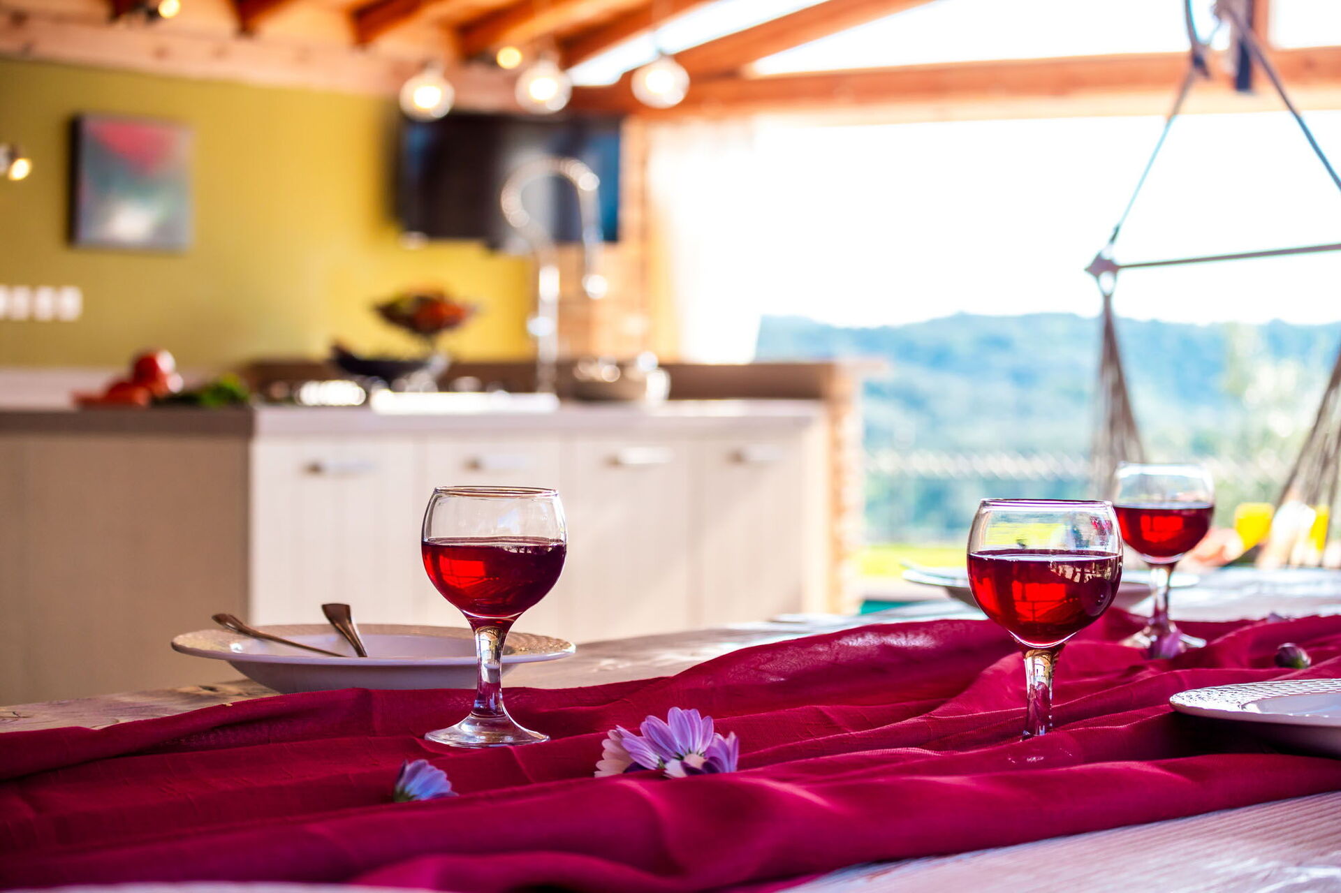 External room (not connected to the main house on the inside, but just a few meters away): living area with living room (TV) and dining area with large, well equipped kitchen (burners, oven, barbecue, woodburning oven).