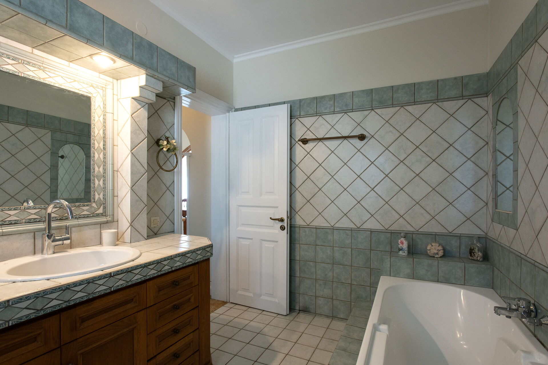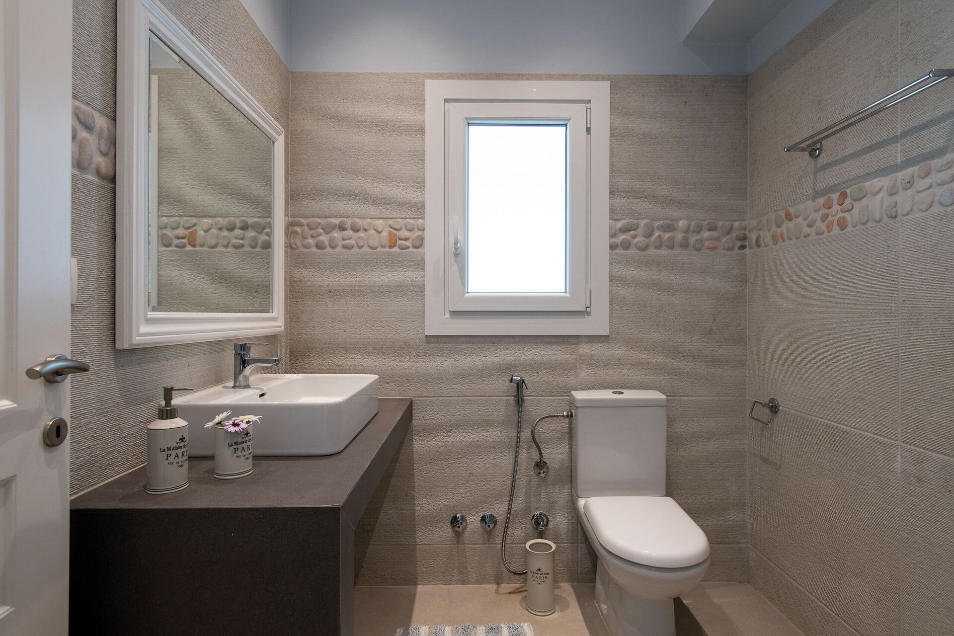 Ground floor: large living room (air conditioning, tv) with dining area and kitchen corner (cooktop, oven, freezer, dishwasher, microwave, coffee maker, toaster), bathroom with bathtub (washing machine), double bedroom with private bathroom with shower, bedroom with double bed (can be converted to 2 single beds upon request) with private bathroom with shower.