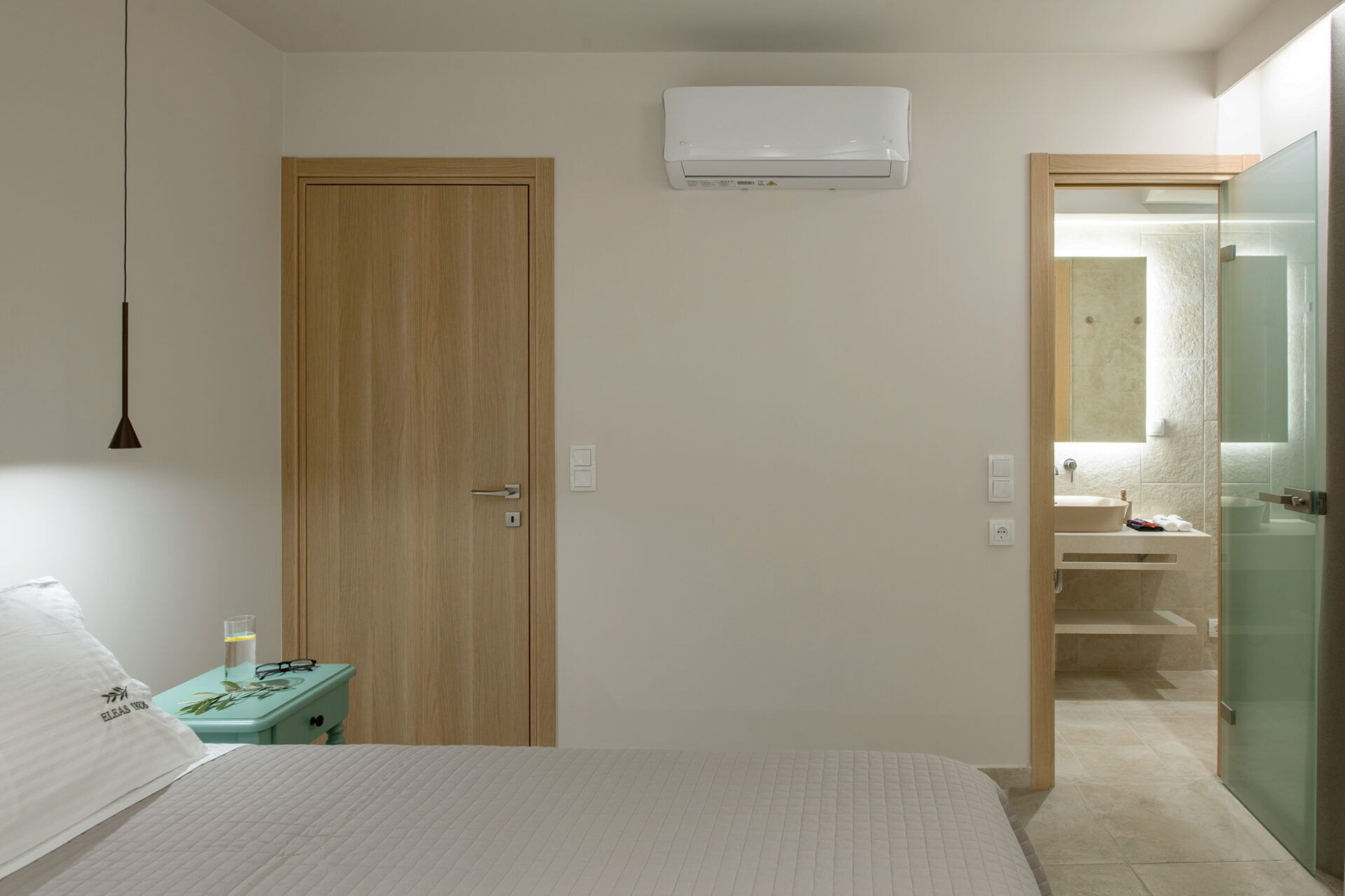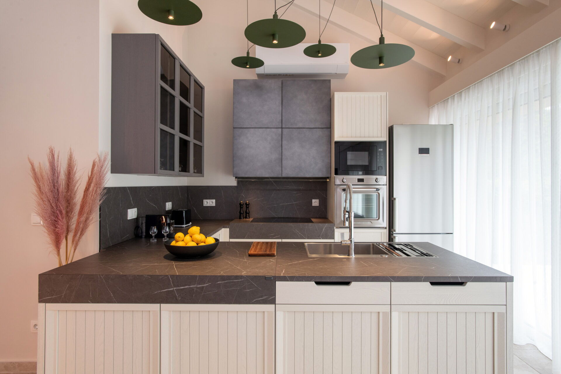 This beautiful brand new villa in Greece features modern furnishings and is very comfortable.