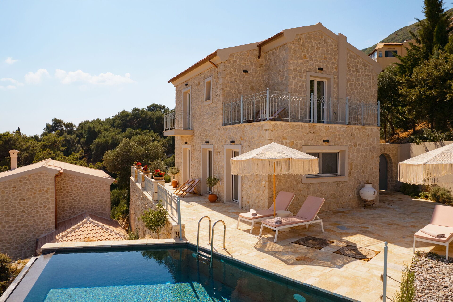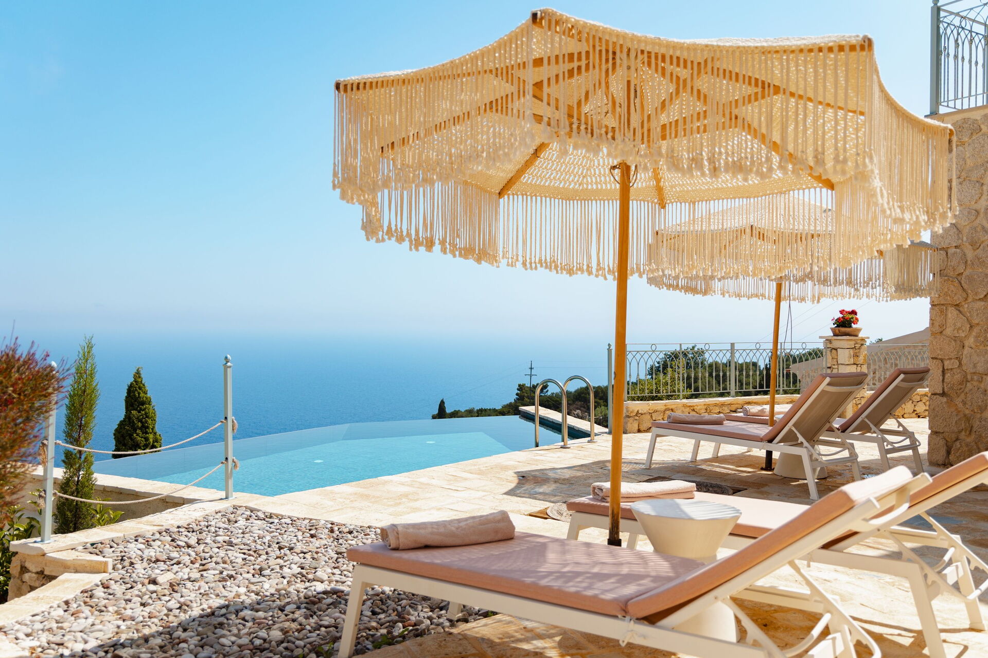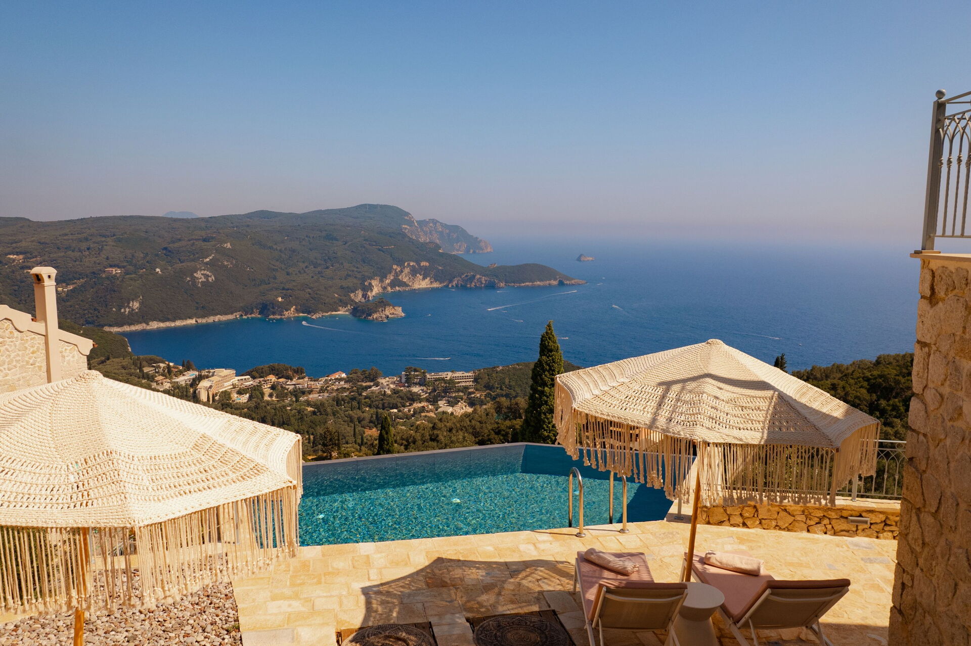 An outdoor area with sweeping views offers a lovely private pool and sun deck for enjoying the sunny Corfu days.