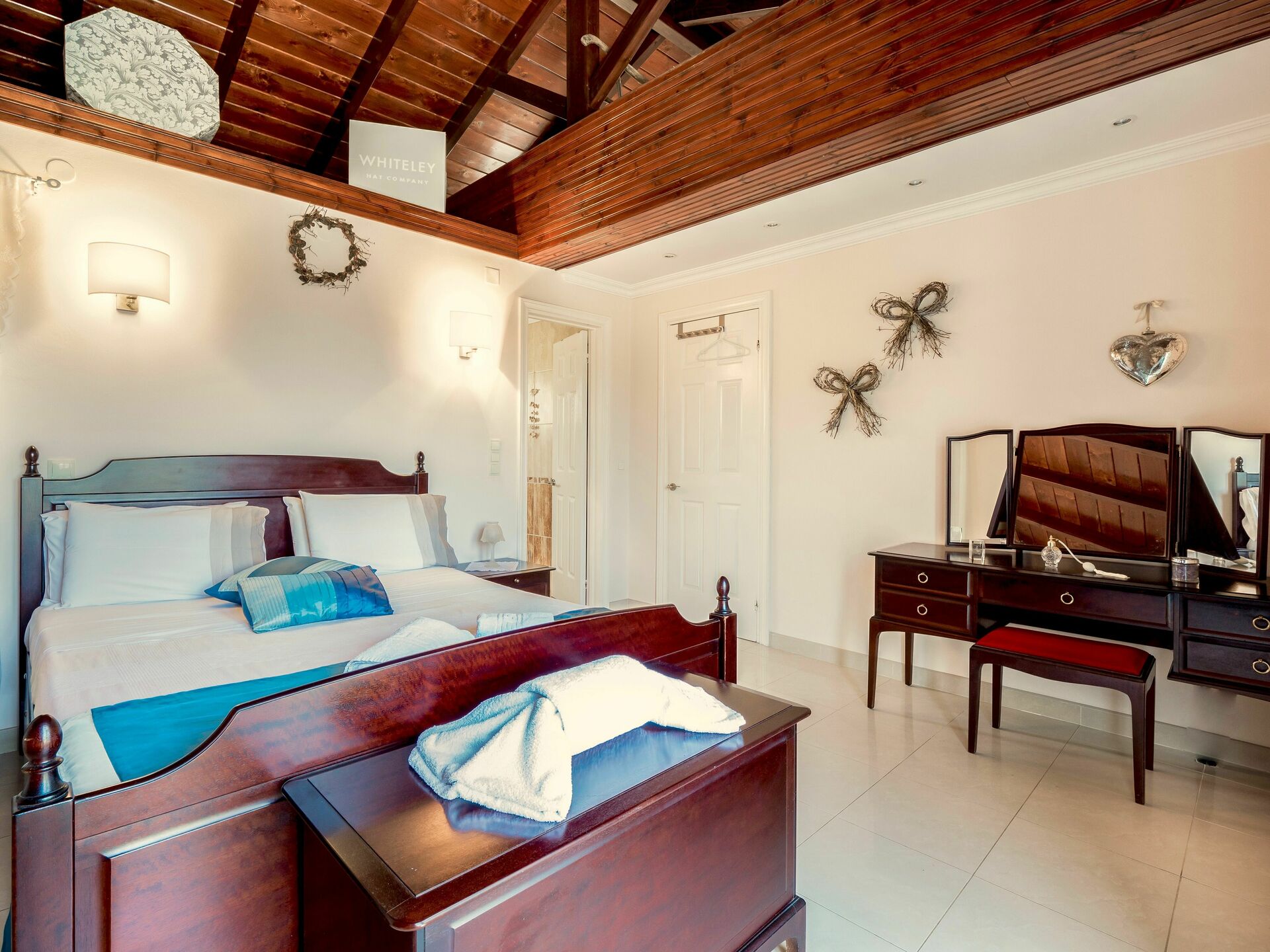 On the ground floor there are 3 bedrooms, 2 bathrooms, and a useful lounge/kitchenette perfect for preparing poolside meals without the need to go upstairs. All the rooms open via big patio doors onto a well-furnished terrace facing the pool and the gardens. The bedrooms on the ground floor are 2 doubles and 1 twin, all romantically furnished and particularly spacious. The master bedroom has its own bathroom with walk-in shower, while the 2 further bedrooms share a large family bathroom with both a Jacuzzi bathtub and separate shower.
