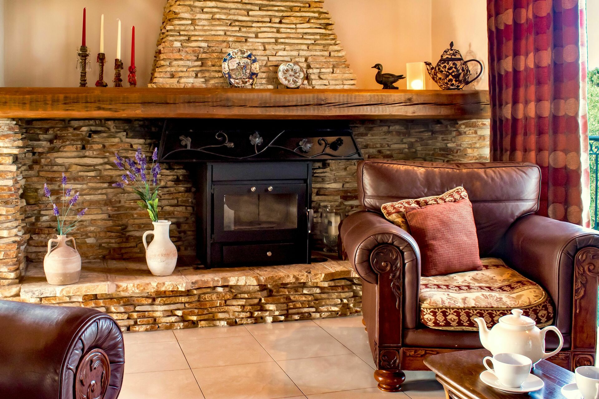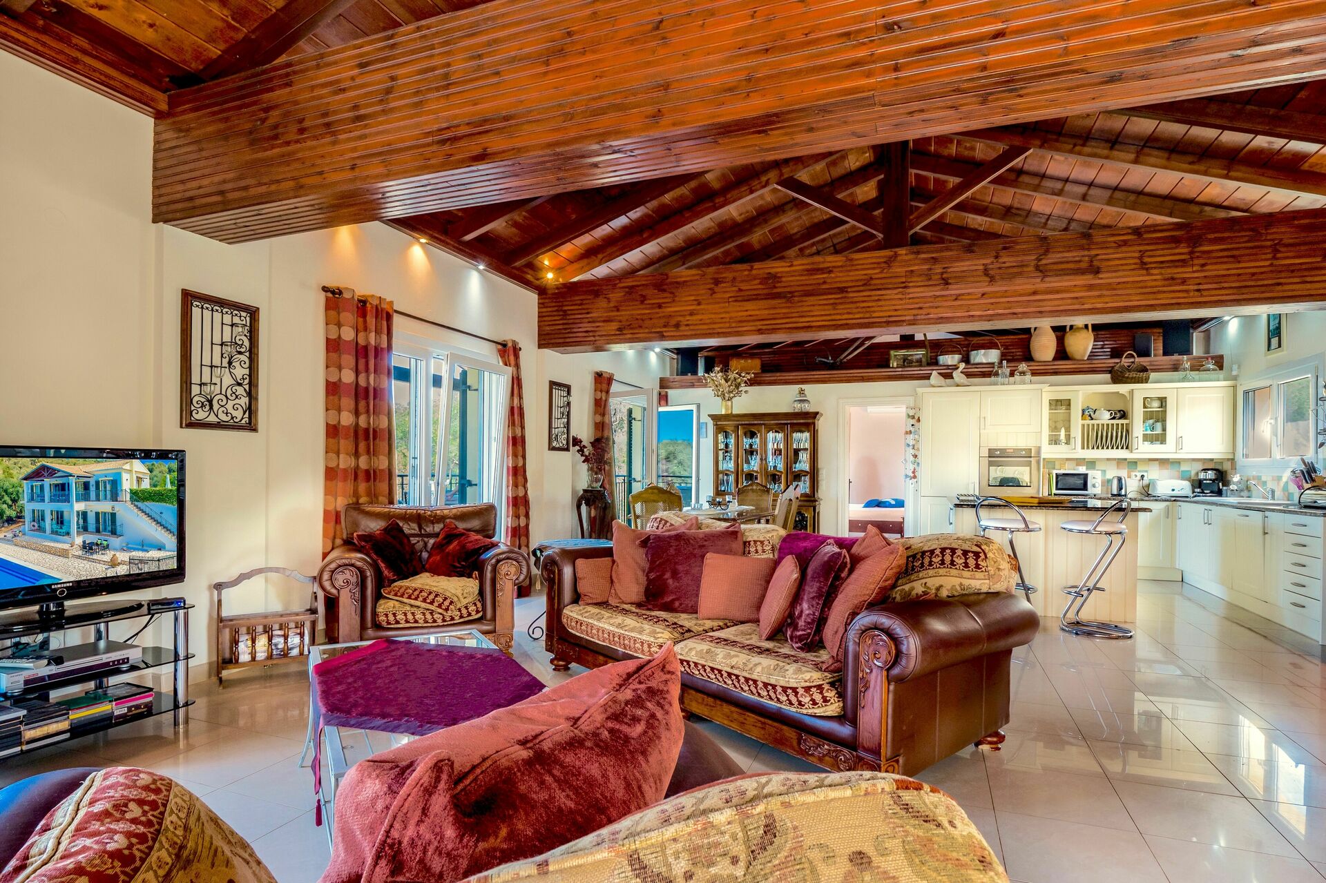 The upper floor houses the main living area together with a stunning suite with double bed and its own shower room. The huge living room (with fireplace) has plenty of sofas, armchairs as well as satellite TV (free channels), DVD player, music system. The surprisingly well equipped and well stocked kitchen has a breakfast bar as well as a dining table that can comfortably sit all the guests together. Dishwasher, oven, microwave, 4 cooking rings, fridge/freezer, toaster, kettle, coffee maker and washing machine are available. Also on the upper floor all the rooms open straight to a front balcony overlooking the pool, the olive trees and the sea, with plenty of outdoor furniture to dine outside, relax or simply enjoy the views. There is also a side balcony, accessible from the lounge, well equipped with rattan sofas and coffee tables.
