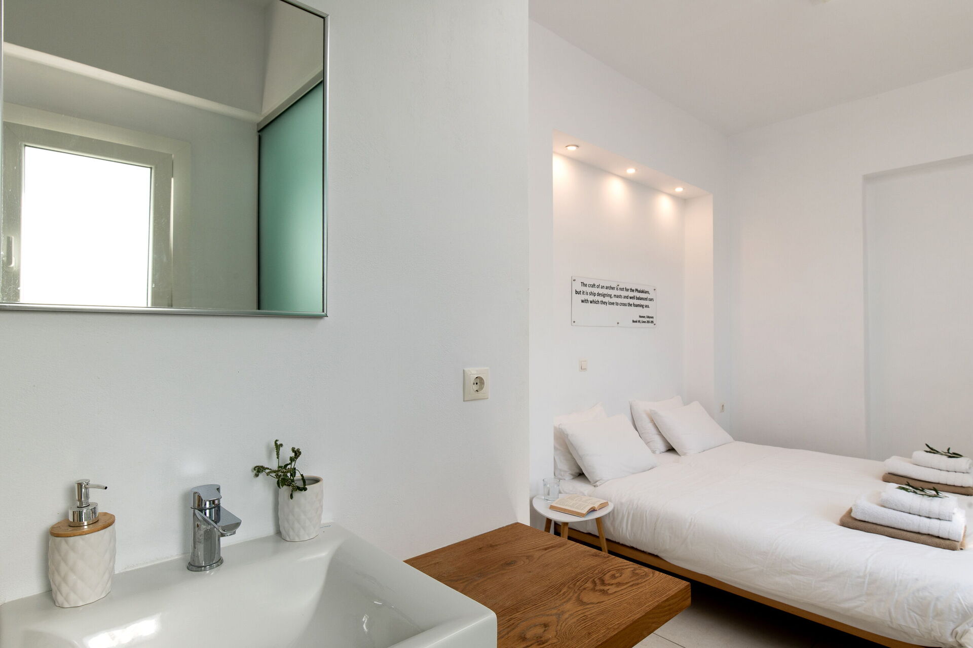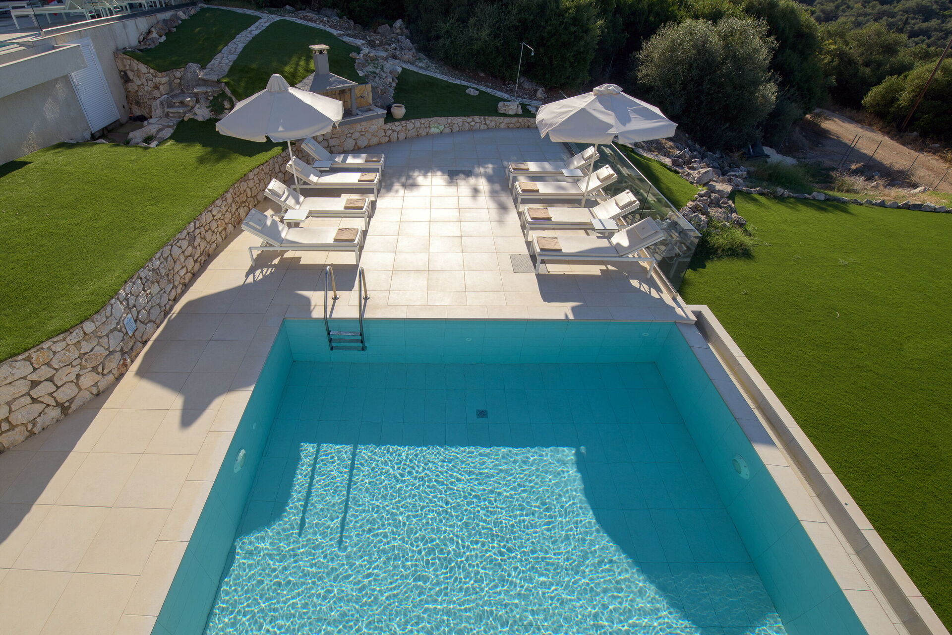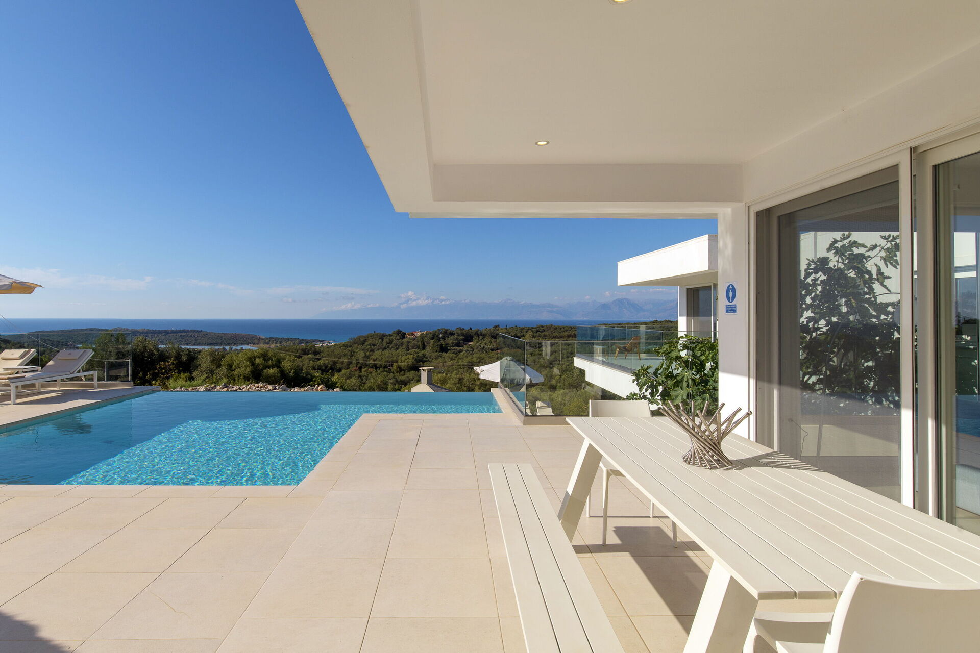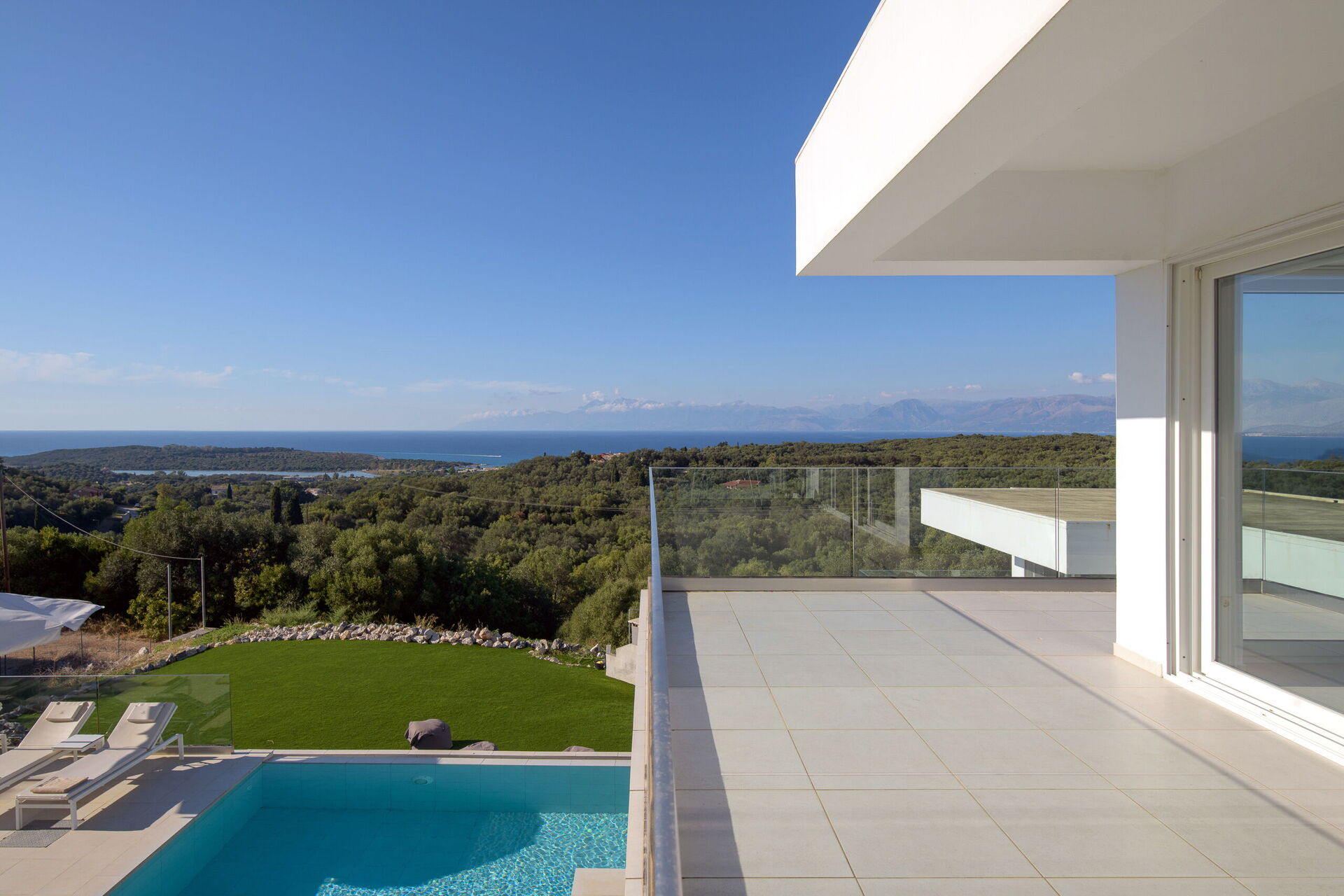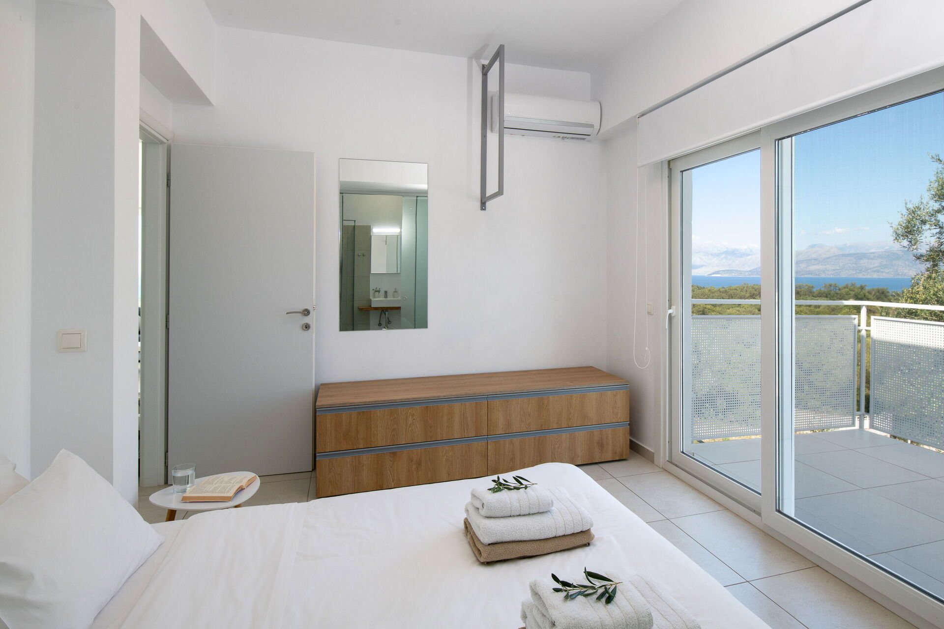 Inside, this modern villa is set over 2 floors connected via a side staircase. With huge patio doors, large windows, and designer furniture, Villa Arete enjoys all the sun and light that Greece can offer. On the ground floor there is a spacious lounge (sofas, wi-fi, air-conditioning) with adjoining kitchen (fully equipped) as well as 2 bedrooms (both en-suite). One bedroom has a double bed + a sofa (that can be turned into a full size single sofa bed) while the other bedroom is a twin. The upper floor is identical to the lower one, except that the master bedroom has just a double bed and not an extra sofa bed. Extensive terrace on both floors provide magical views over the ionian Sea and Albanian coastline beyond.